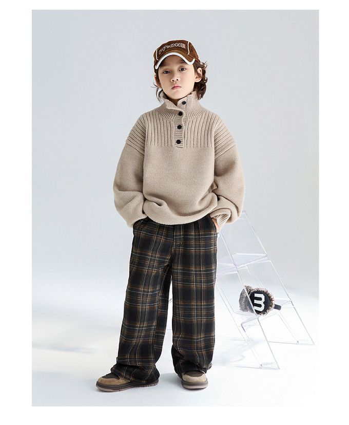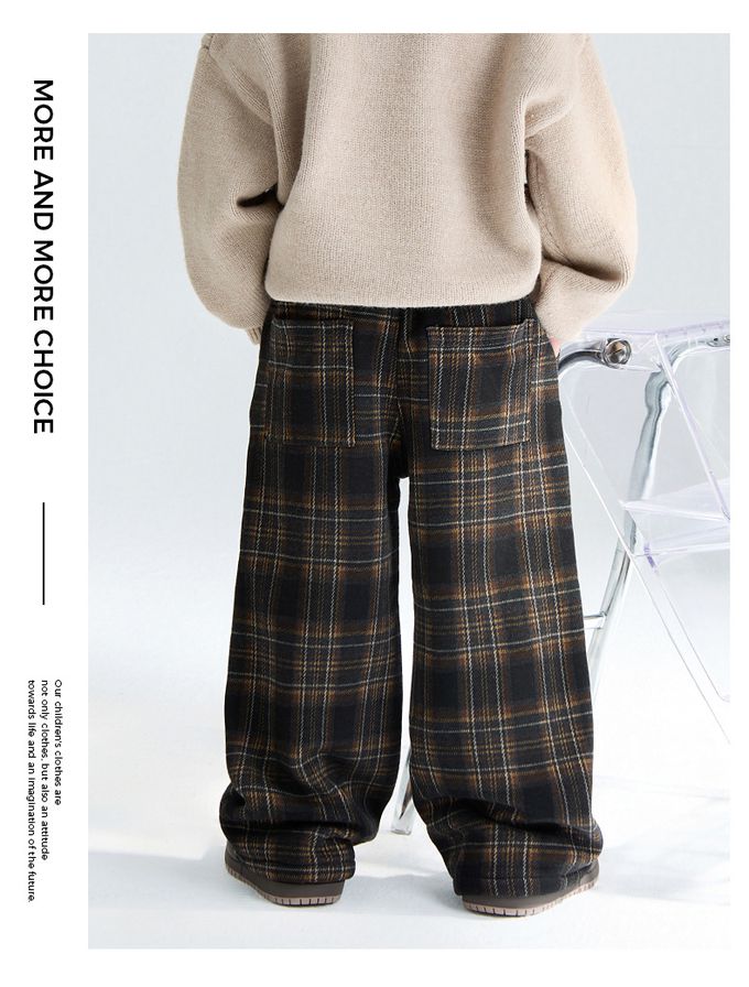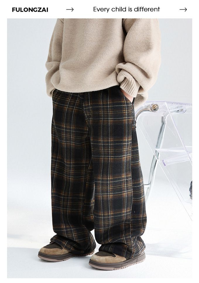 FULONGZAI - 腰鬆緊休閒長褲(加絨)-英倫風格紋-黑x咖