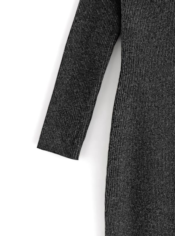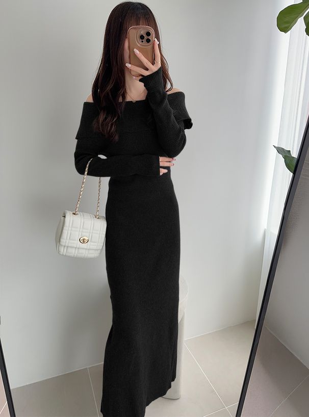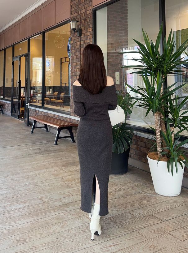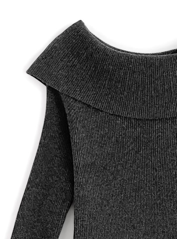 日本 GRL - 露肩翻領腰線合身針織長洋裝-灰