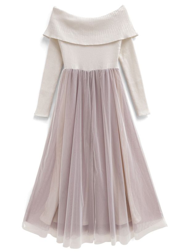 日本 GRL - 一字領針織拼接浪漫薄紗洋裝-白x紫粉