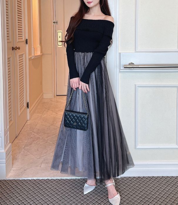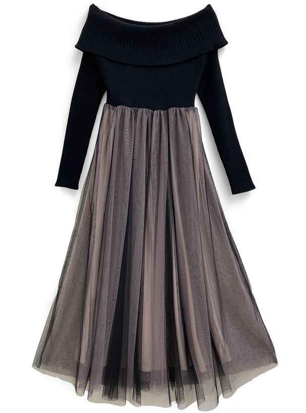 • 品名:一字領針織拼接浪漫薄紗洋裝