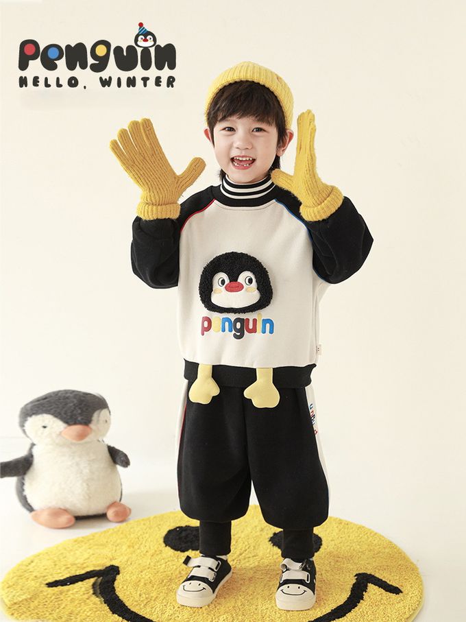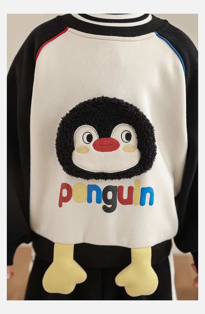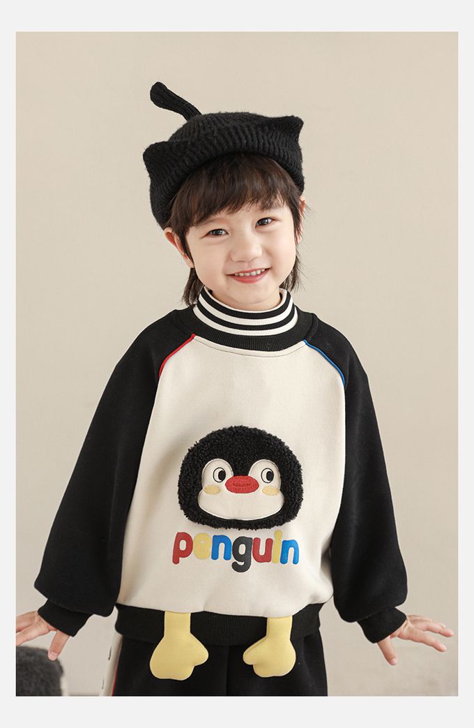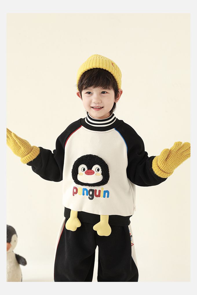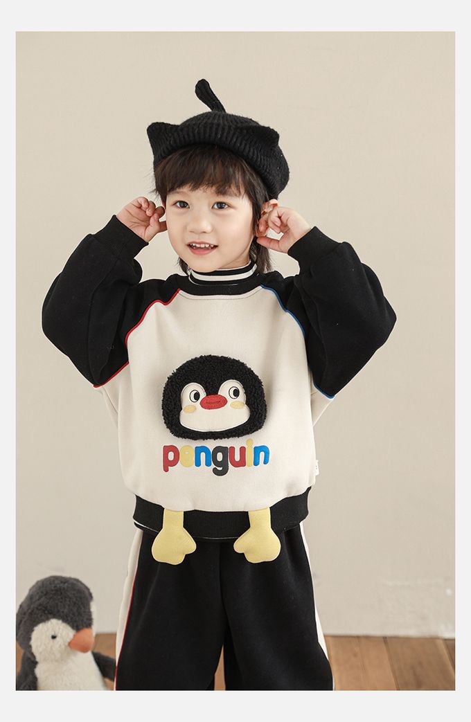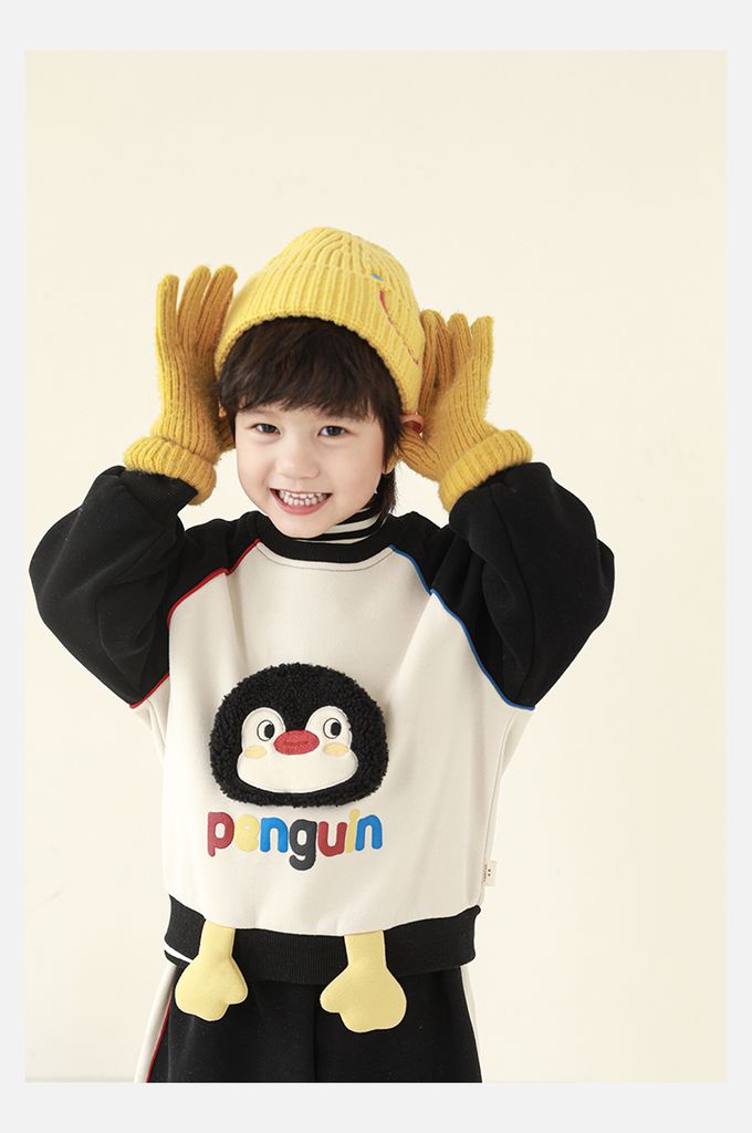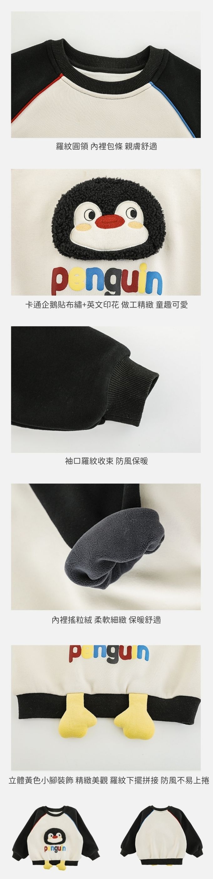 休閒圓領長袖上衣/大學T(加絨)-立體企鵝寶寶-米色