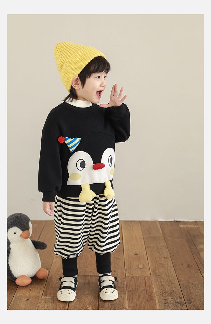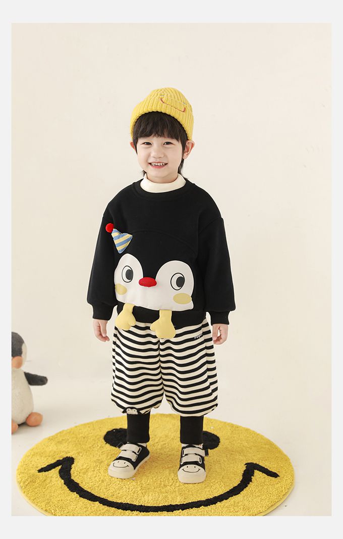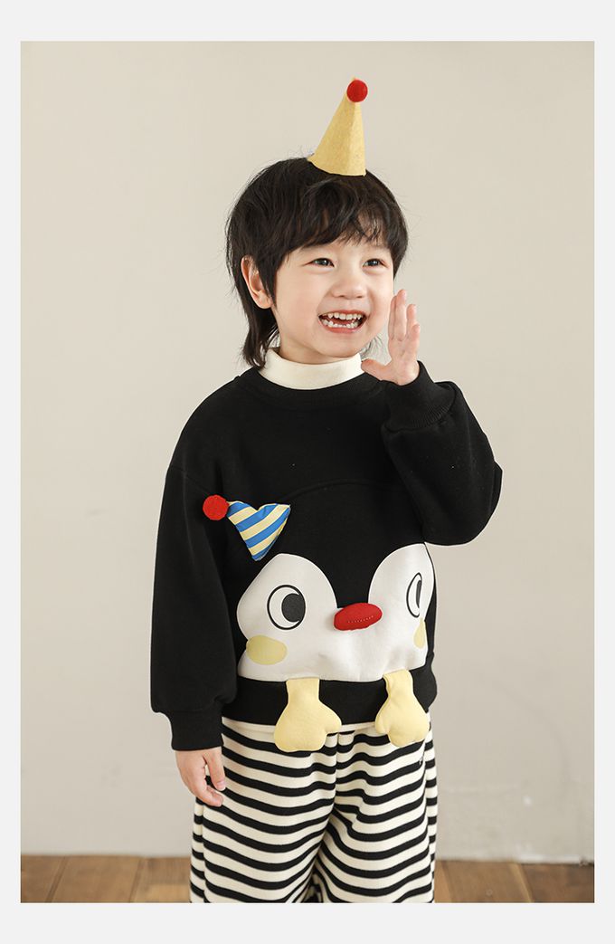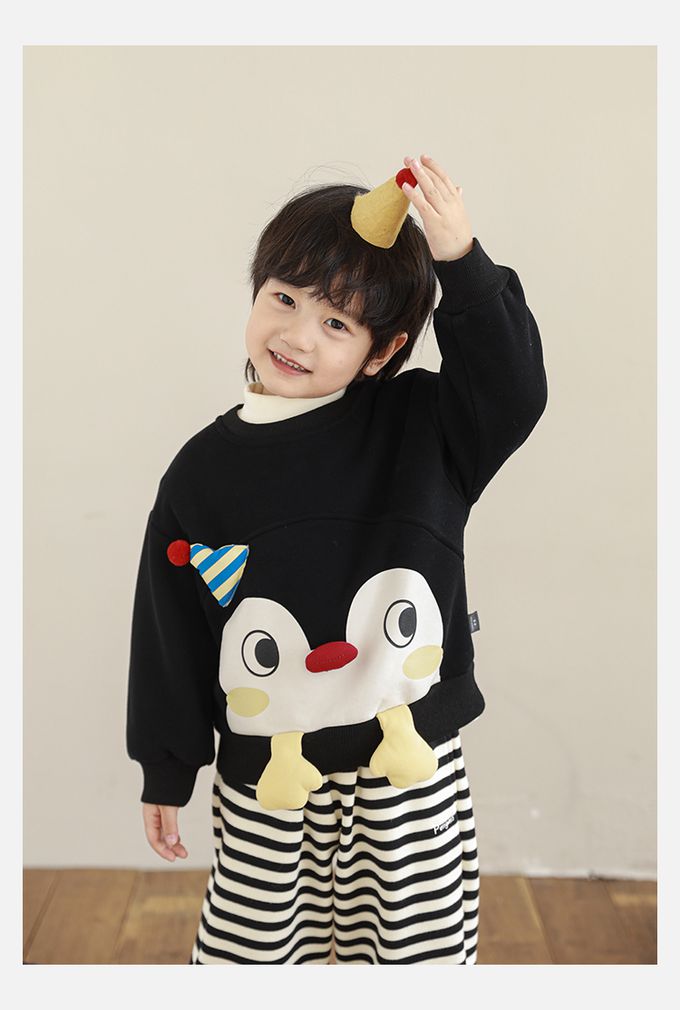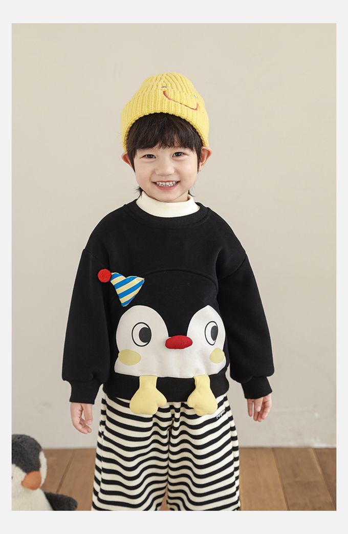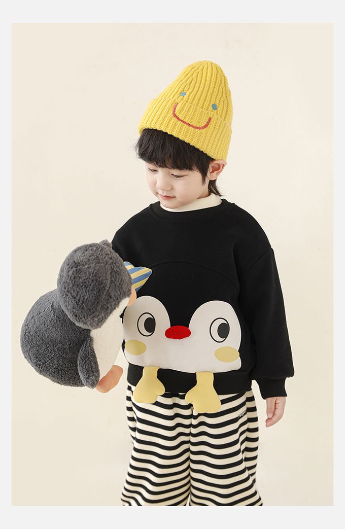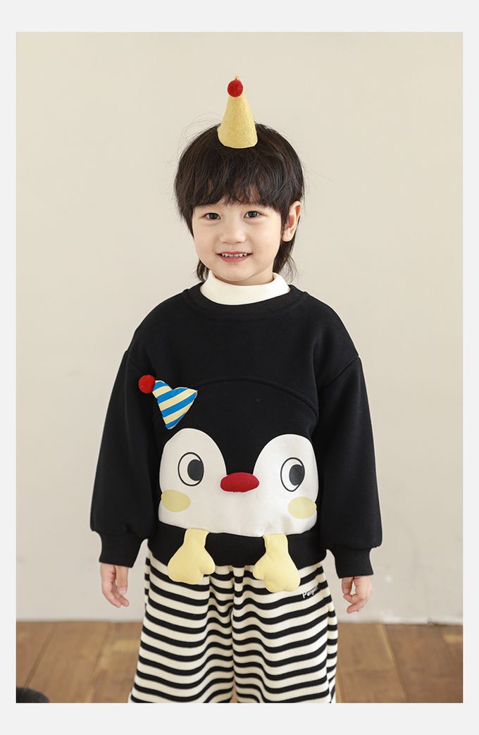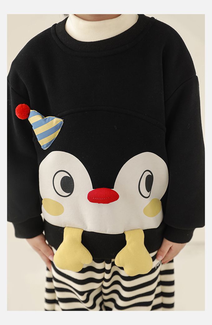 休閒圓領長袖上衣/大學T(加絨)-立體企鵝臉-黑色