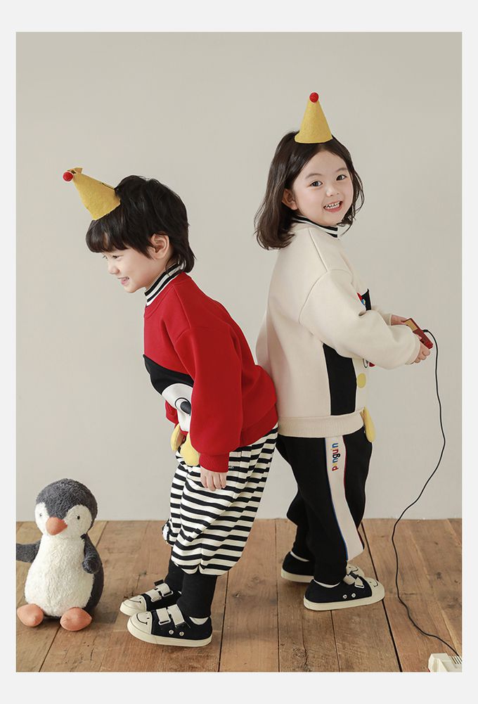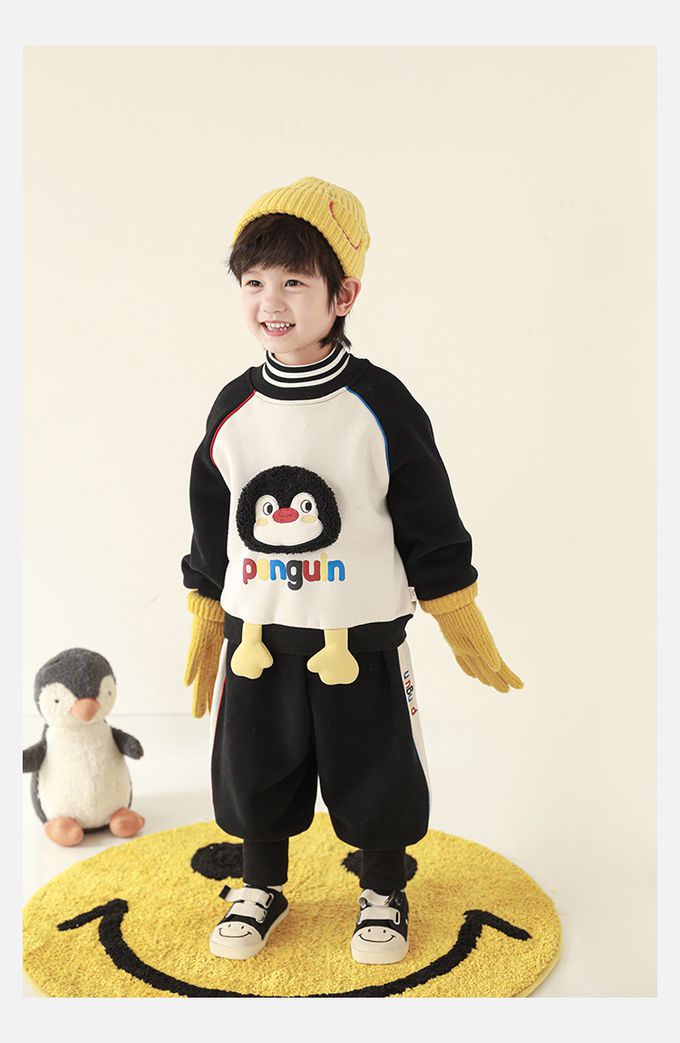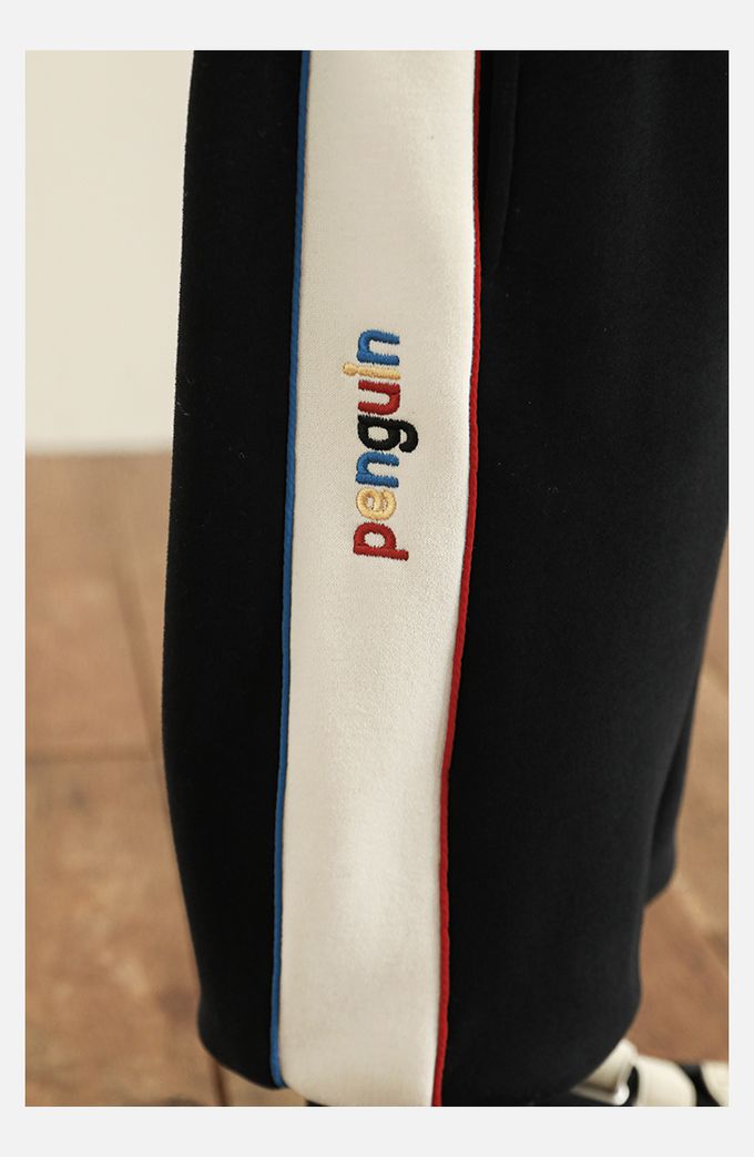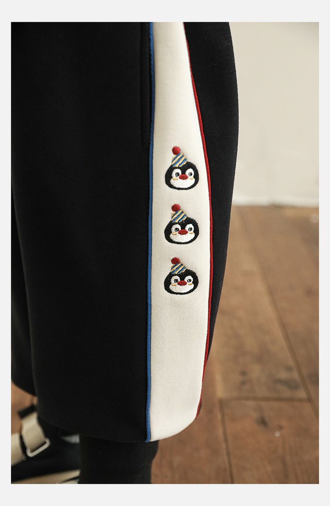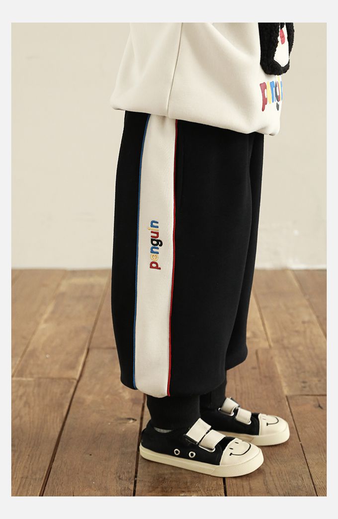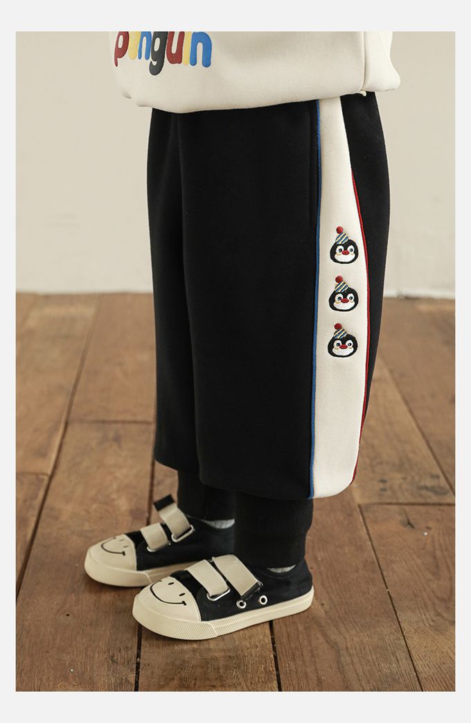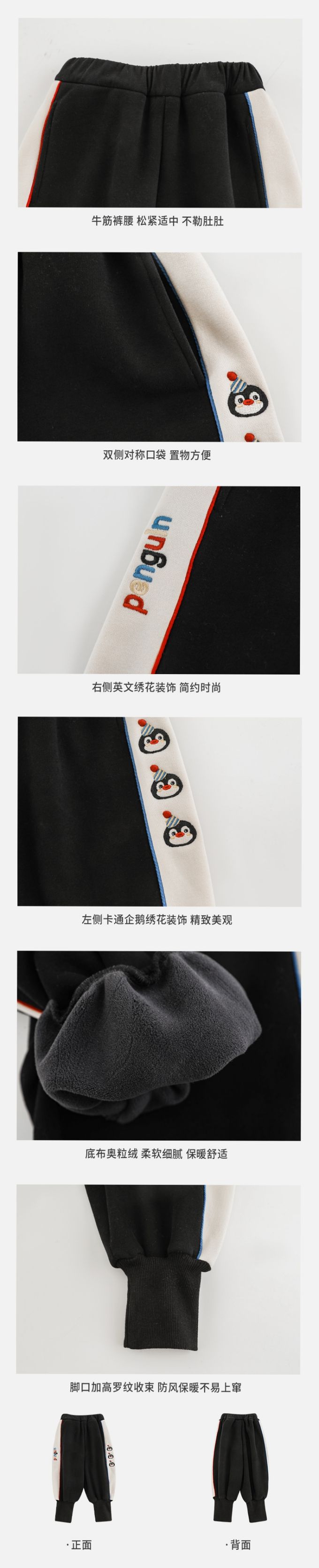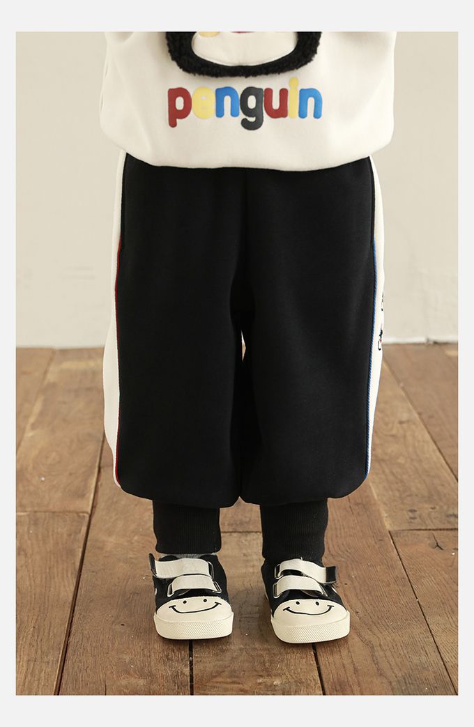 腰鬆緊休閒束口長褲(加絨)-可愛小企鵝-黑色/米色