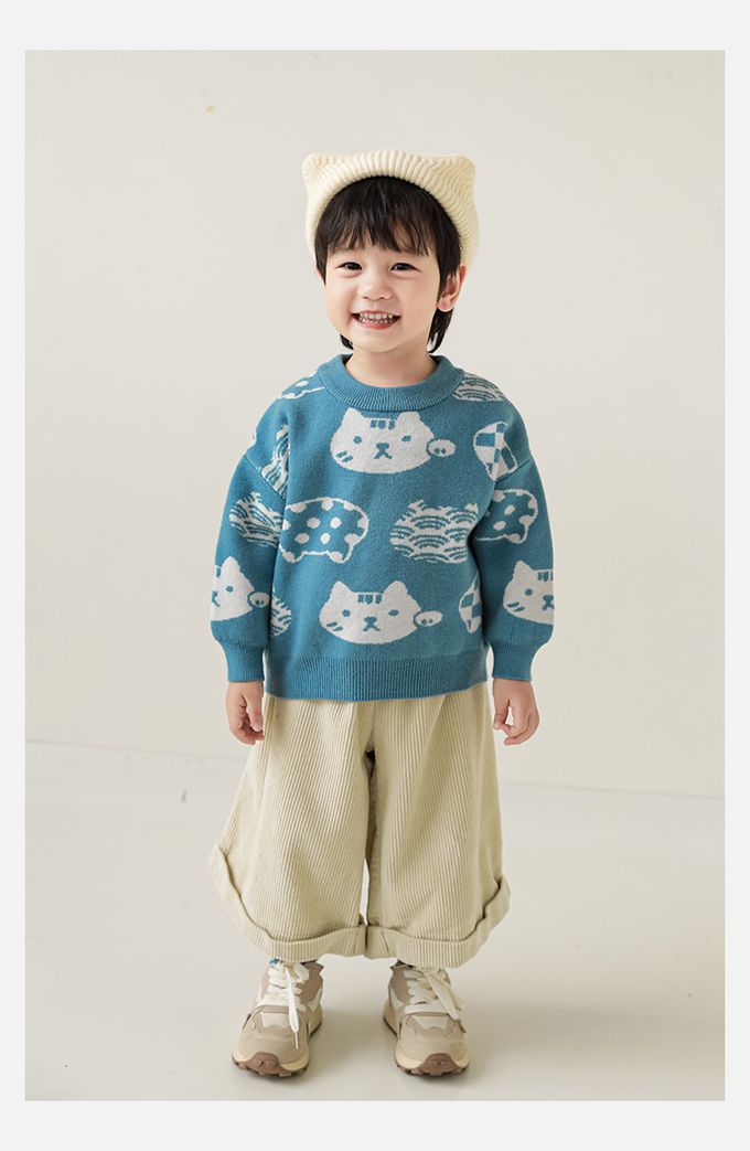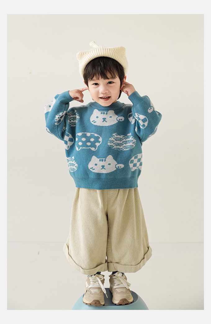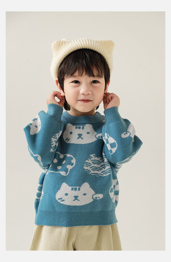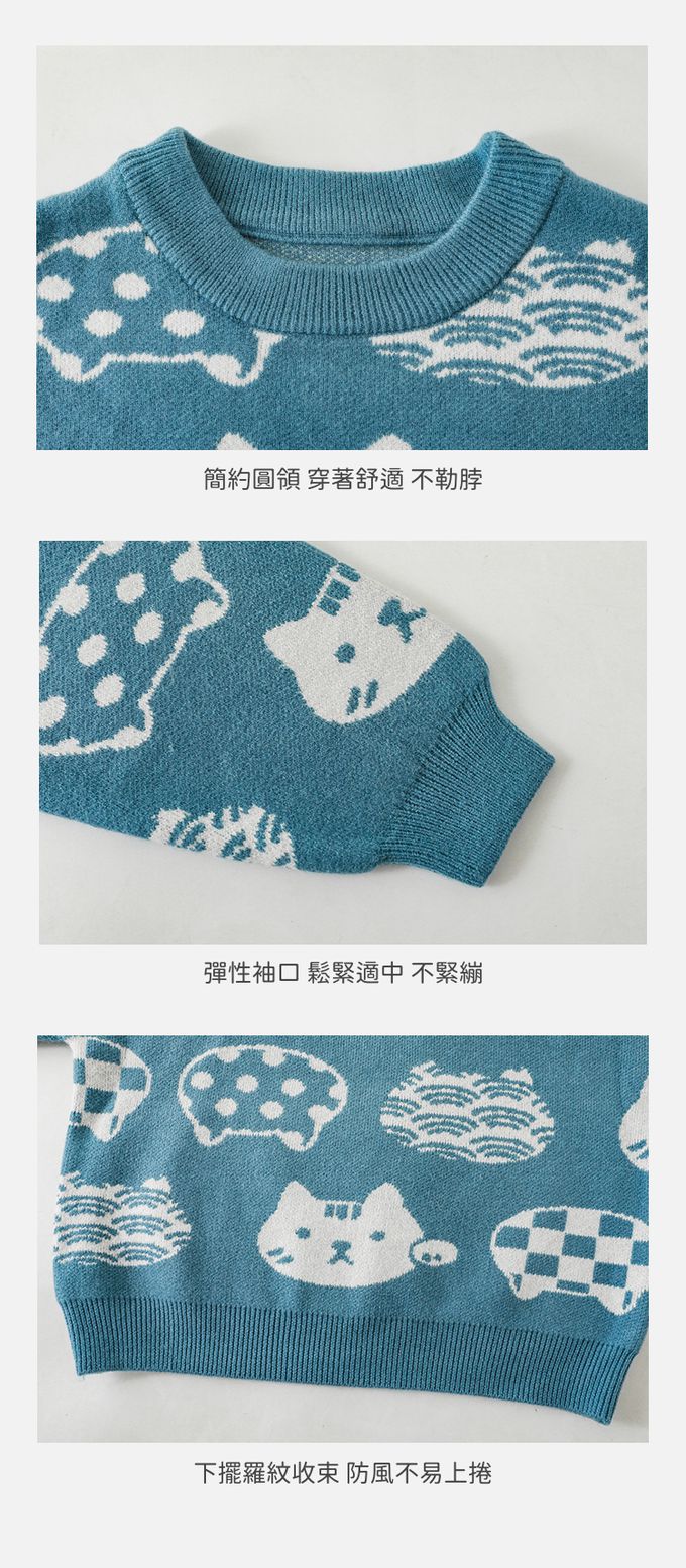 圓領長袖針織上衣/毛衣-超萌貓咪-藍色