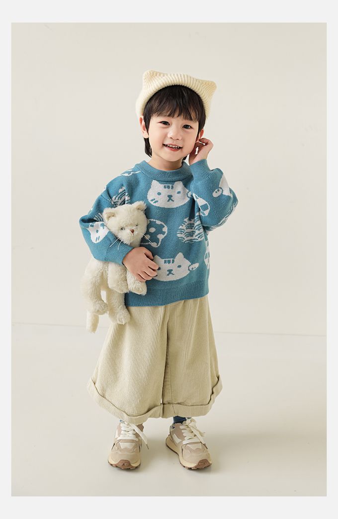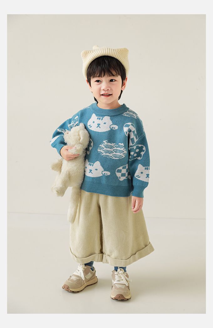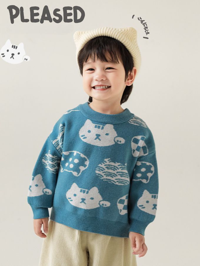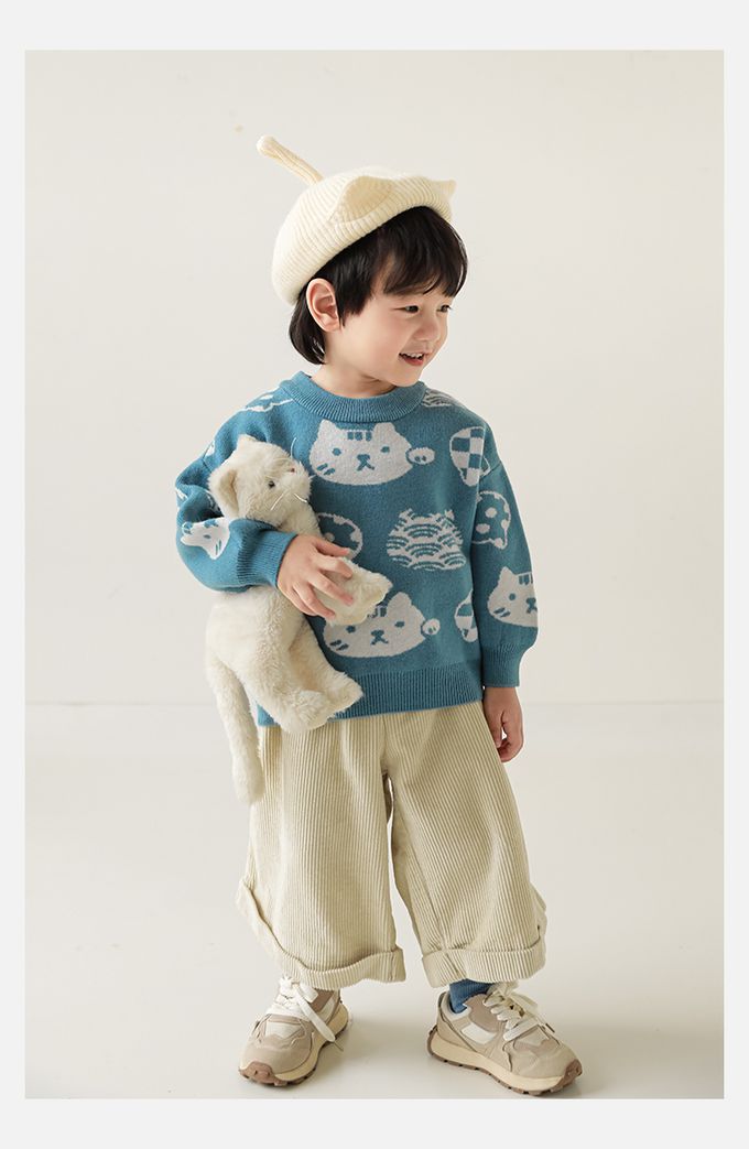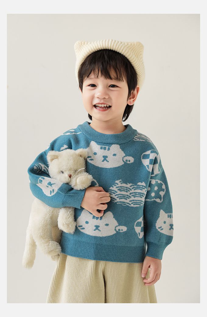 圓領長袖針織上衣/毛衣-超萌貓咪-藍色