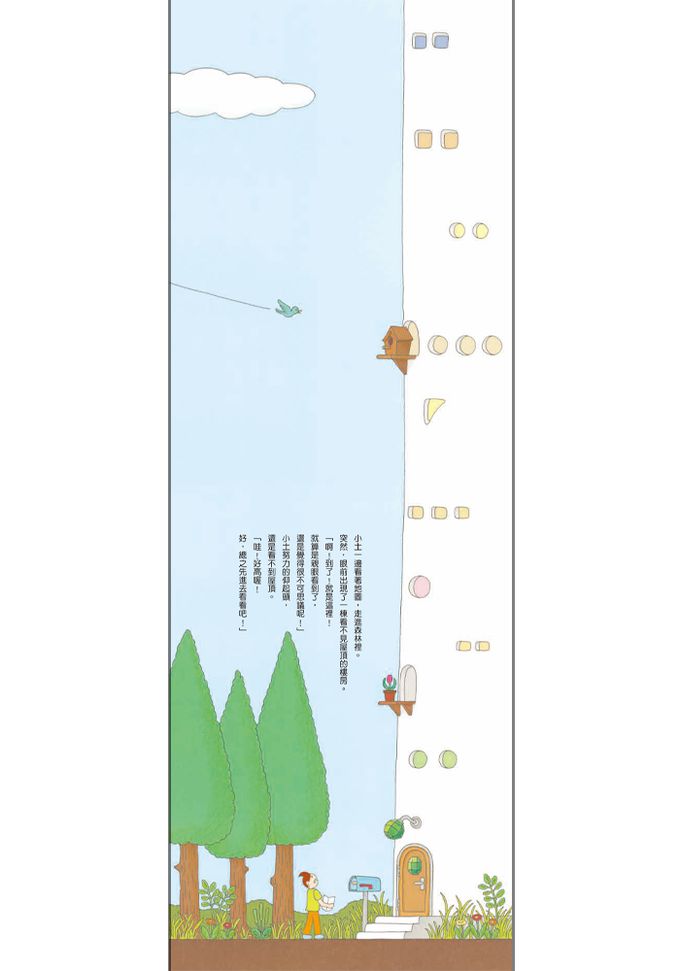 爬100層樓梯本來是寂寞、枯燥而且辛勞的苦差事,但是當二樓門上的乳酪和老鼠圖樣把小土引入室內,爬樓梯就變成認識朋友的新鮮事了。隨著每一個跨頁開展,十層一戶的動物住家剖現眼前。每一戶的形狀、顏色,以及和天空接觸的方式,各有風格;樓內的室內擺設、裝置和活動,也因為動物的習性而各有奇趣。這樣一來,只在同一定點往高處攀升的小土和讀者,每爬高一層樓,就有好多細節可以觀察,有好多「家」的故事可以說了。
