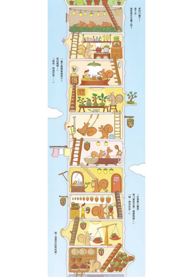 原來,在這棟奇妙的建築裡,每隔十層樓,就是一種動物的家呢!松鼠、瓢蟲、青蛙、蜜蜂……仔細看,每層樓都有不同的布置、也都代表了主人的個性喔!那……住在第100層樓的,到底是誰呢?