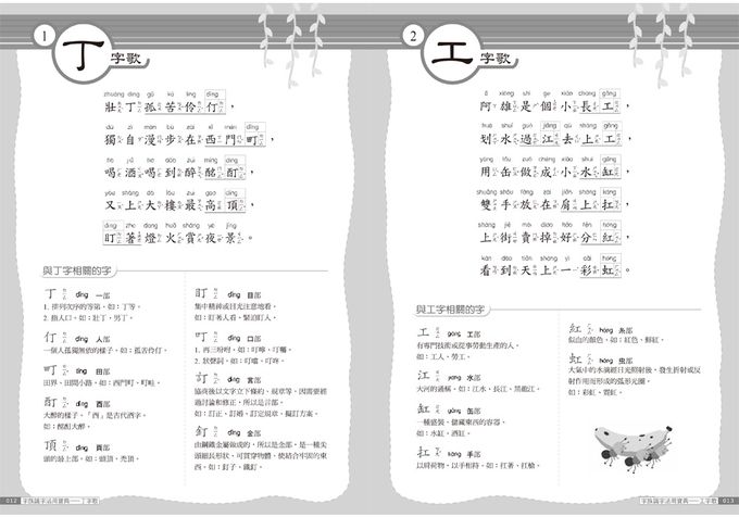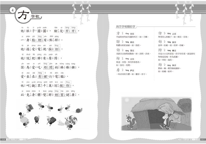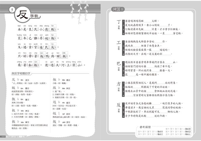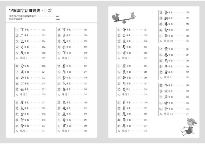 為了不使識字枯燥無味,這本《字族識字活用寶典》,以歌謠方式呈現,讓讀起來有節奏,有押韻,可以朗朗上口,引起學生的興趣。老師或家長指導孩子學習時,可以多關照字音的念法、再講解部首與字的關係。本書每學習五個「識字歌」,就有一則練習,讓學習者從練習中,加深「字」的印象。為了彌補無法把同部件的字,都編進有意義的歌謠裡,只好把相關字放在識字歌的下方,在閱讀了歌謠之後,可以再練習下面的字,如此,就可以增加識字量了。