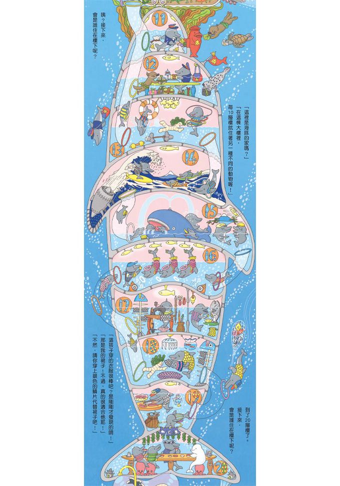 作者根據不同海洋生物的特性,打造多樣化的樓層,讓孩子能在趣味故事中,一邊認識海洋生態,一邊學數數。