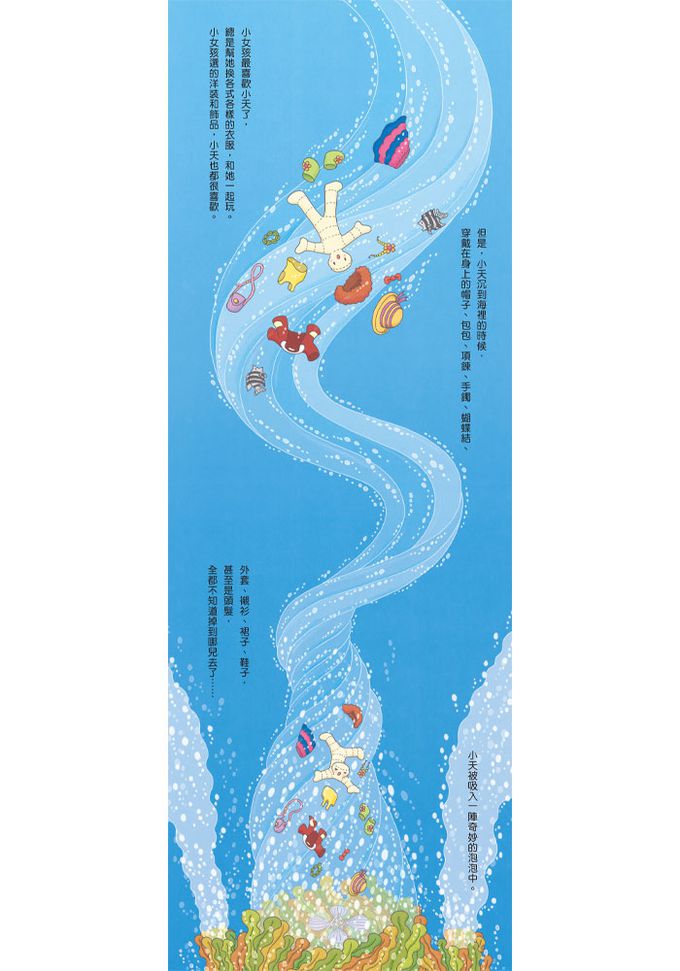 船上有個小女孩抱著洋娃娃小天在餵海鷗,一不小心,小天掉進了海裡!她身上的帽子、包包、衣服、頭髮……全都不知掉到哪兒去了。小天被吸入一陣奇妙的泡泡中,進入了神祕的海底建築裡探險……她會遇到哪些海洋生物?她能找回失落的東西嗎?她最後能回到小女孩的身邊嗎?