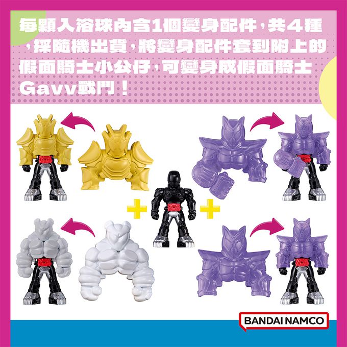 入浴球含1個變身配件,共4種,另附1個假面騎士Gavv小公仔,採隨機出貨!