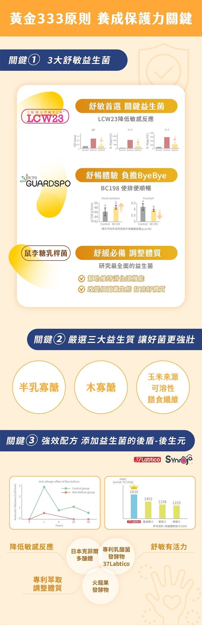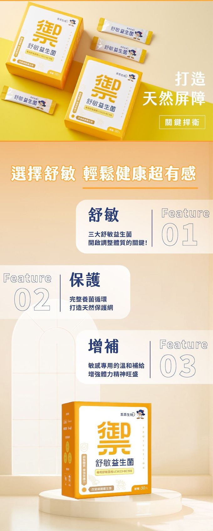 ▪️ 精準 ⎮ 調整體質 舒敏X保護X增補▪️ 關鍵 ⎮ 益生菌 三大黃金配方 益生元、益生菌、後生元▪️ 升級 ⎮ 存菌、養菌、顧菌全方位消化道升級▪️ 榮獲 ⎮ LCW23榮獲澳洲芬蘭功效專利烏克蘭國際發明獎▪️ 金牌 ⎮ BC198 國際發明展三項金牌獎▪️ 專利 ⎮ 鼠李糖乳桿菌專利包埋技術,保留活性▪️ 日本 ⎮ 世界級研發藥廠開發專利克菲爾多醣體▪️ 全齡 ⎮ 兒童、孕婦皆可安心食用▪️ 每盒 30 小條,每條 3 公克