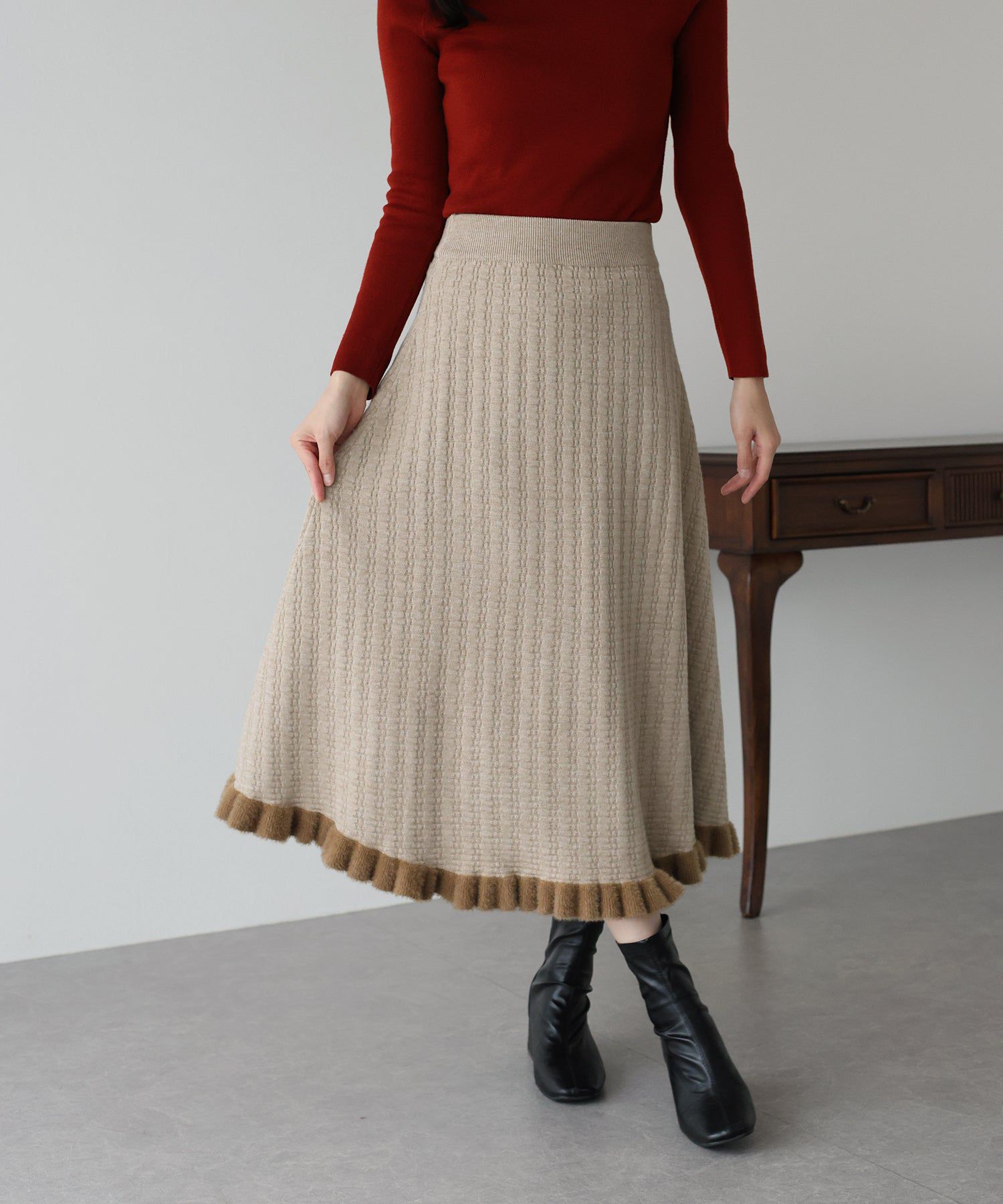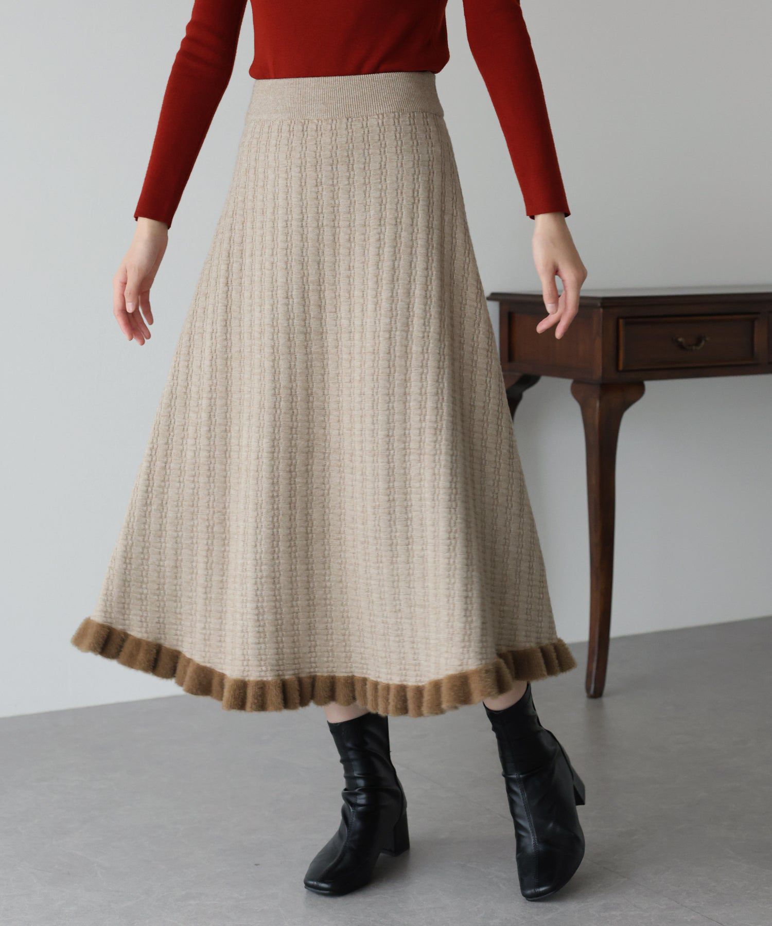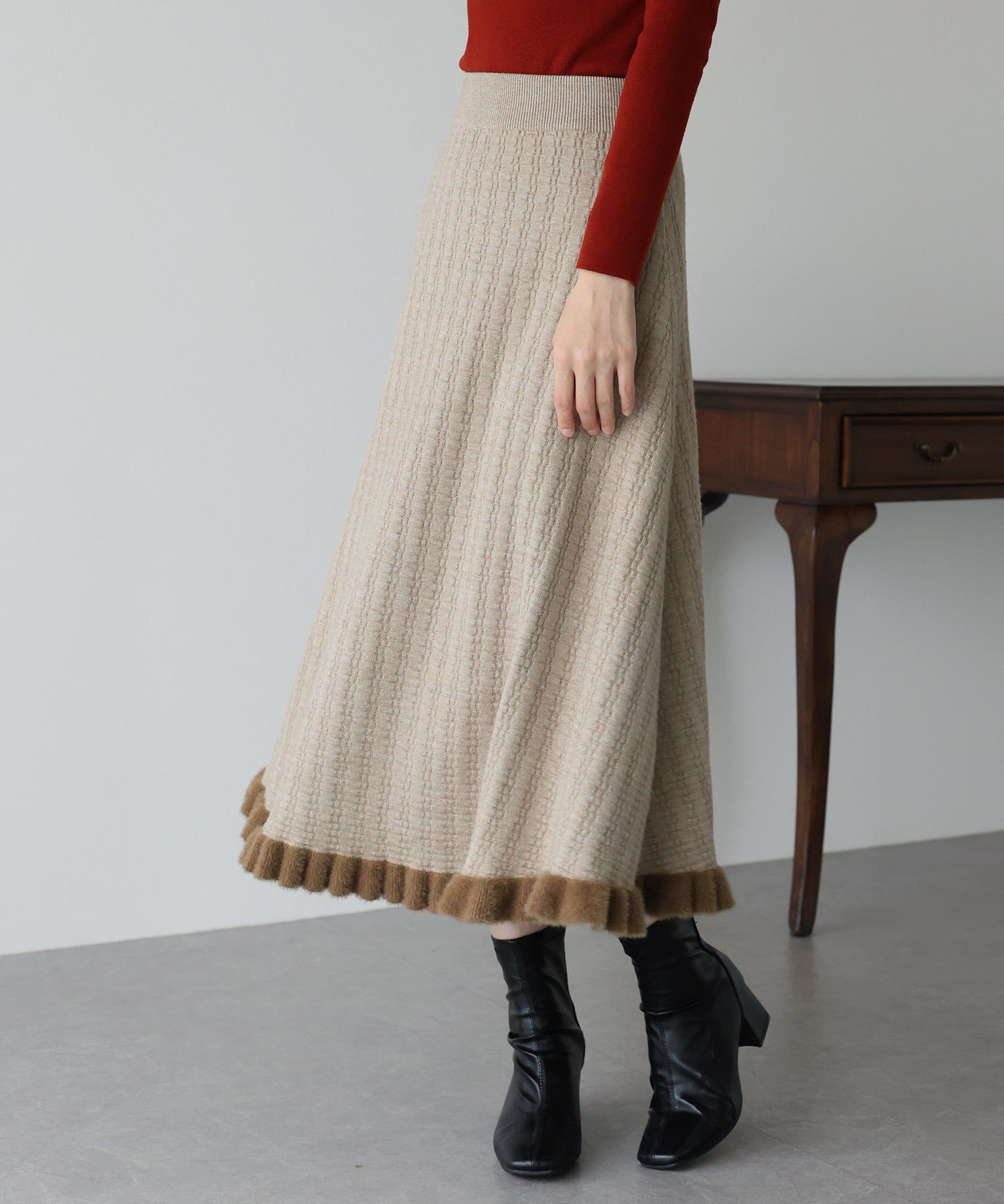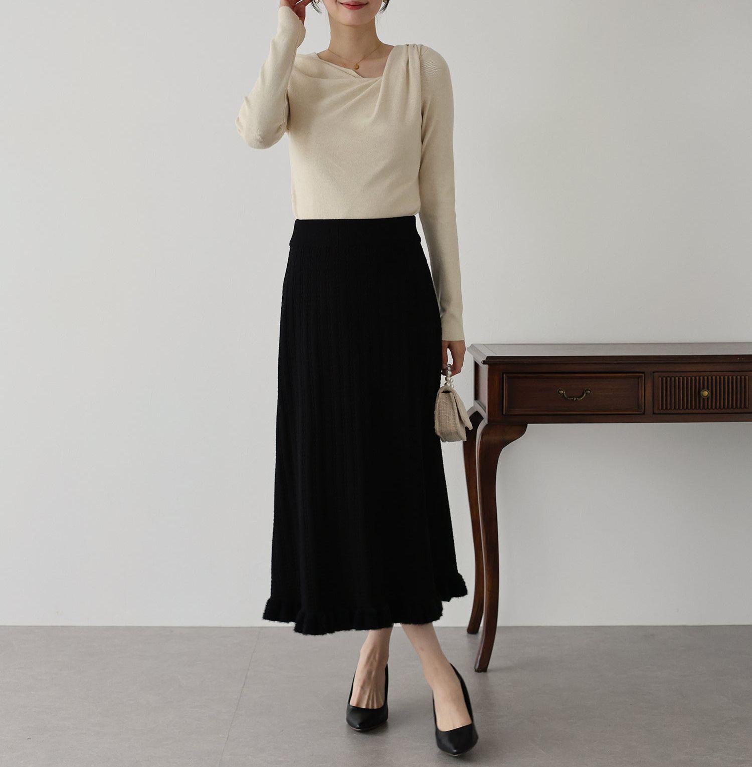 日本 BLUE EAST - 下擺荷葉彈性緹花針織長裙-米杏