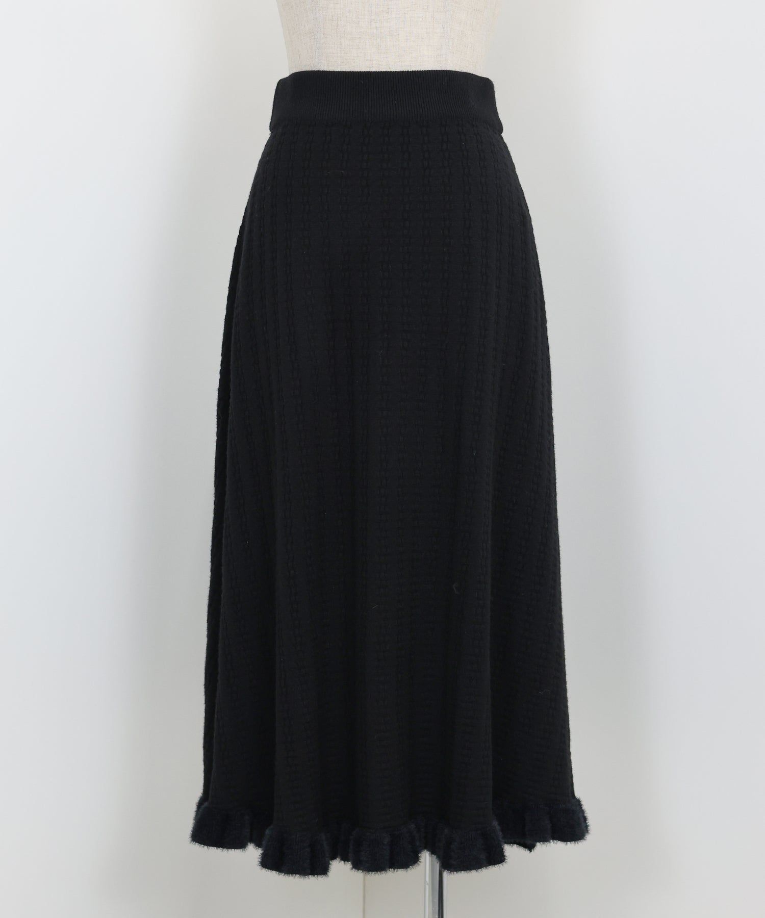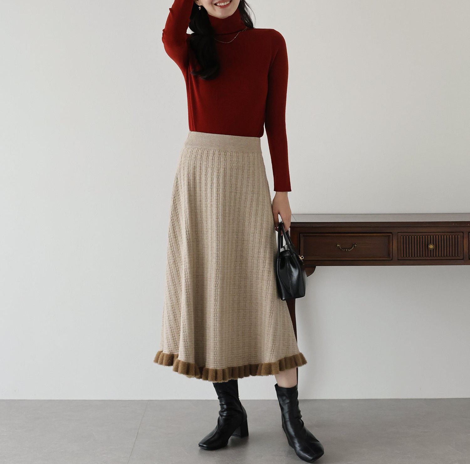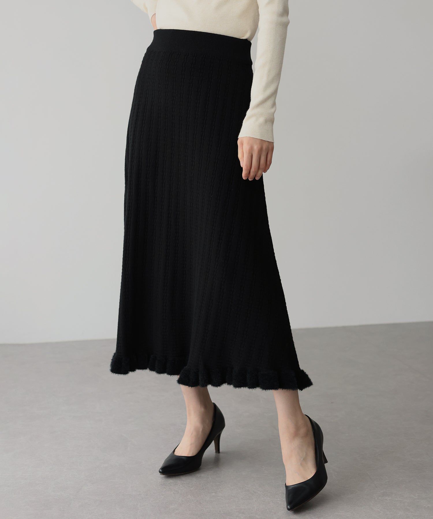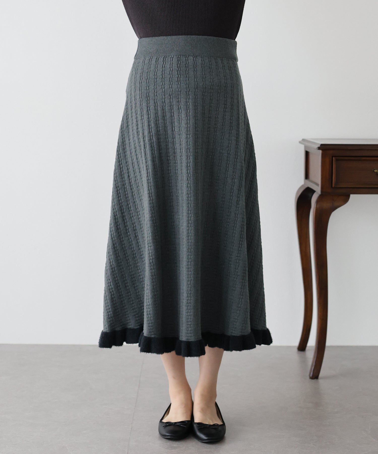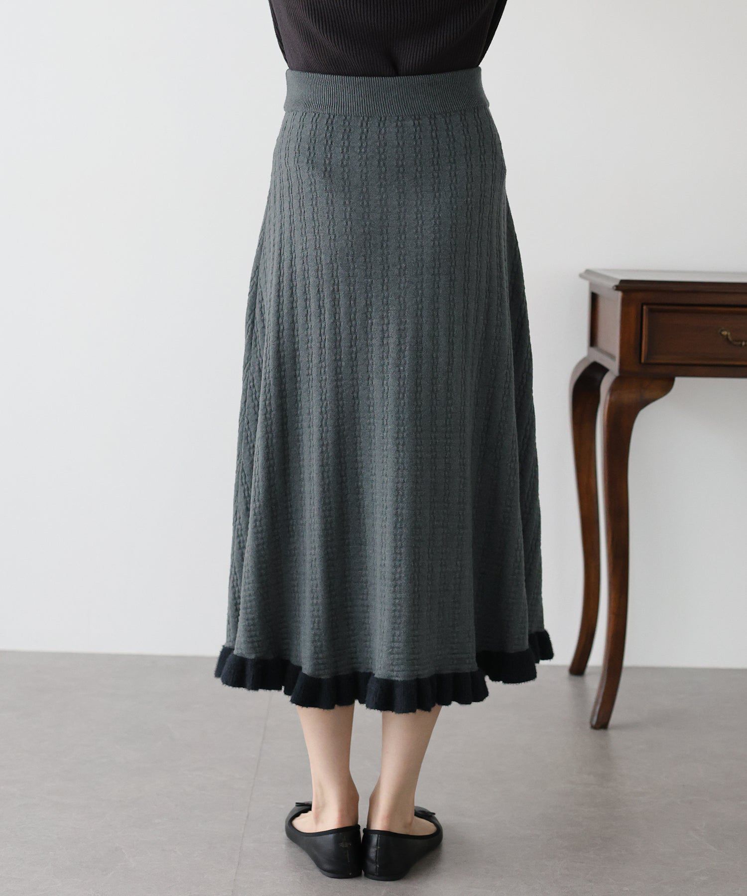 日本 BLUE EAST - 下擺荷葉彈性緹花針織長裙-米杏