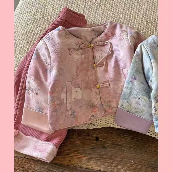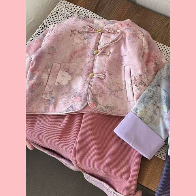 新年過年柔美花朵印花盤釦外套坑條長褲套裝-外套+長褲-粉色