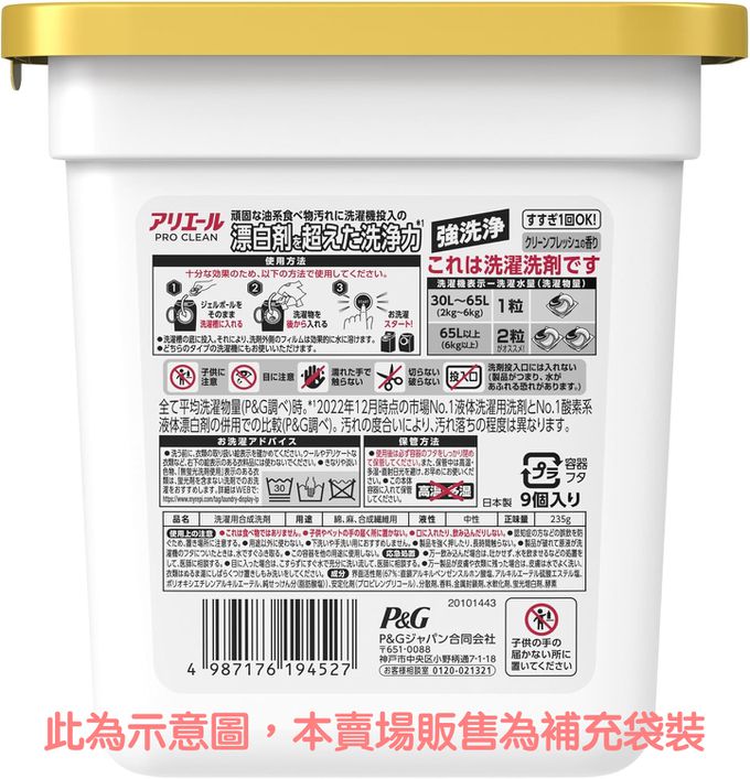 品名:P&G ARIEL Pro Clean 4D立體洗衣膠球 補充袋(19顆入/包) 含漂白成份