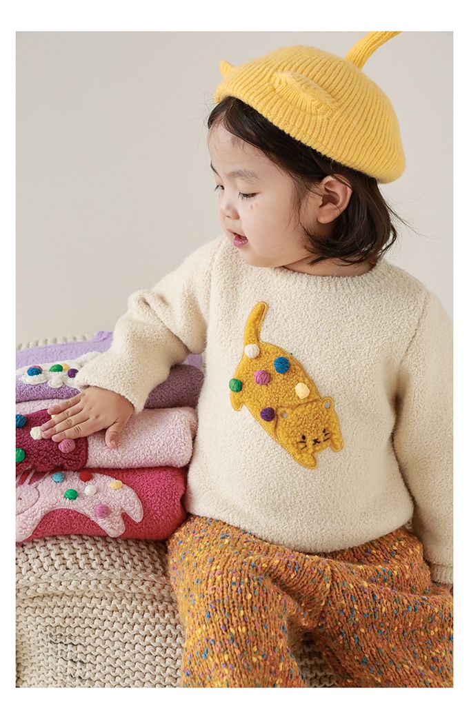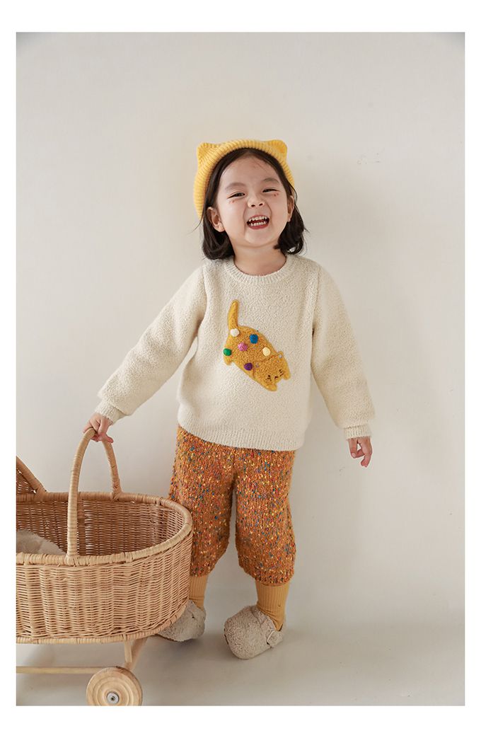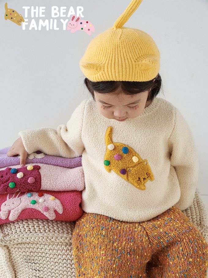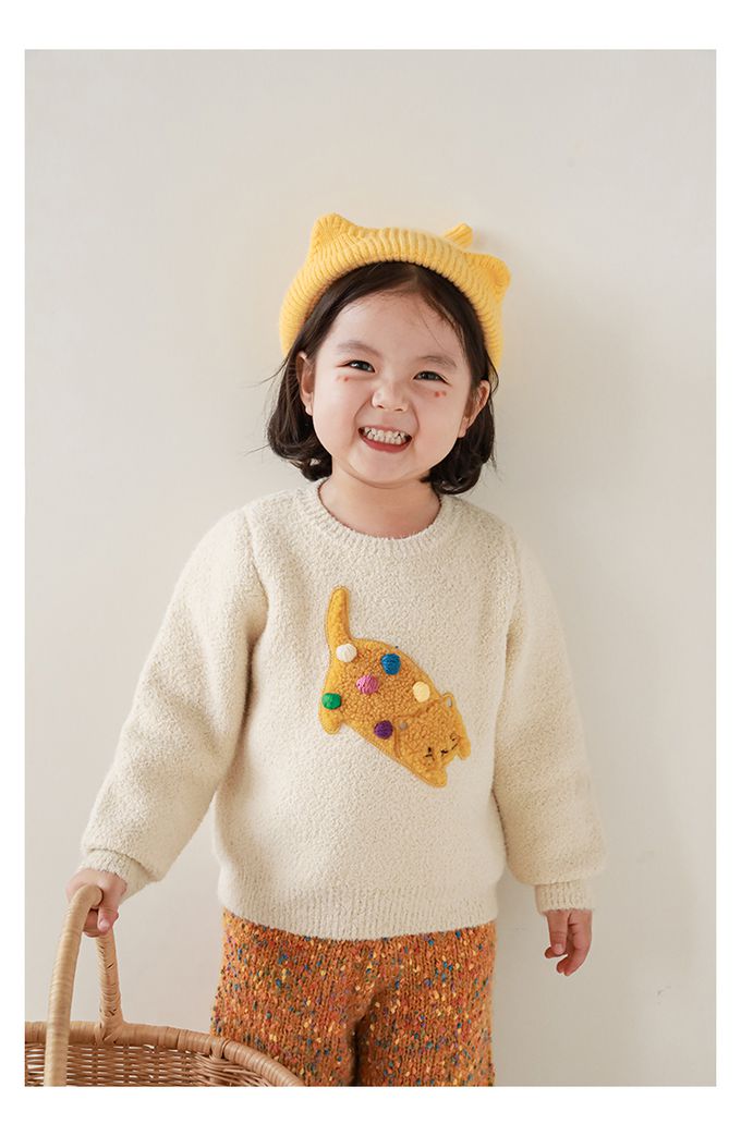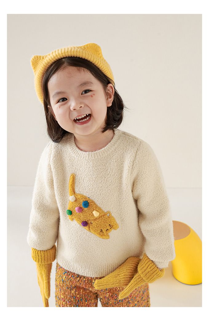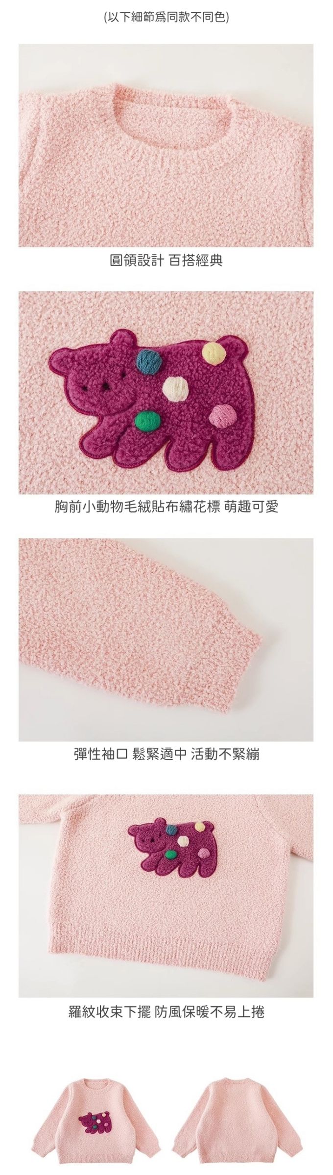 圓領針織長袖上衣-毛茸茸童趣貼布繡-米杏色