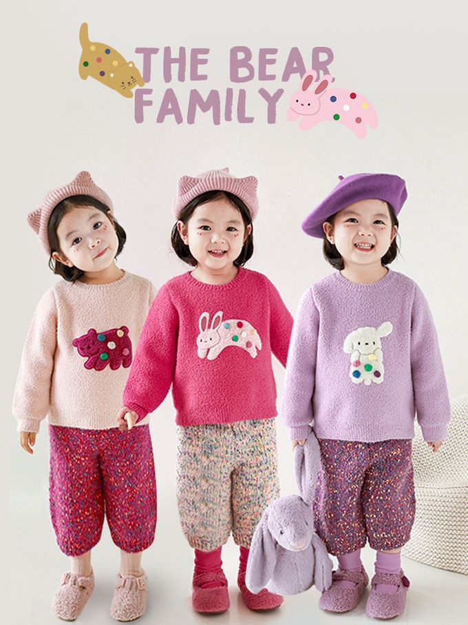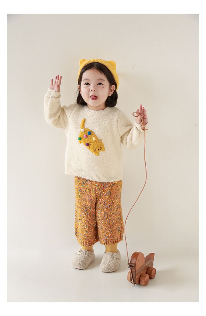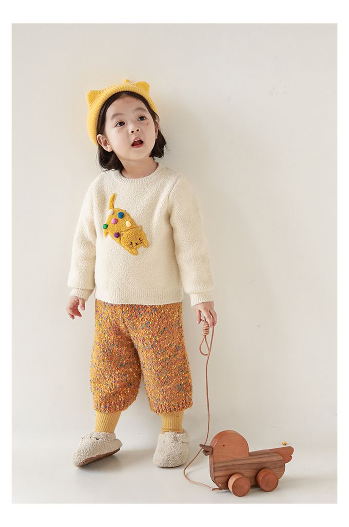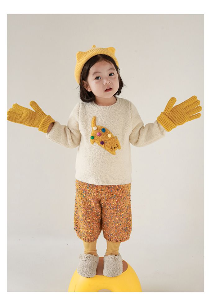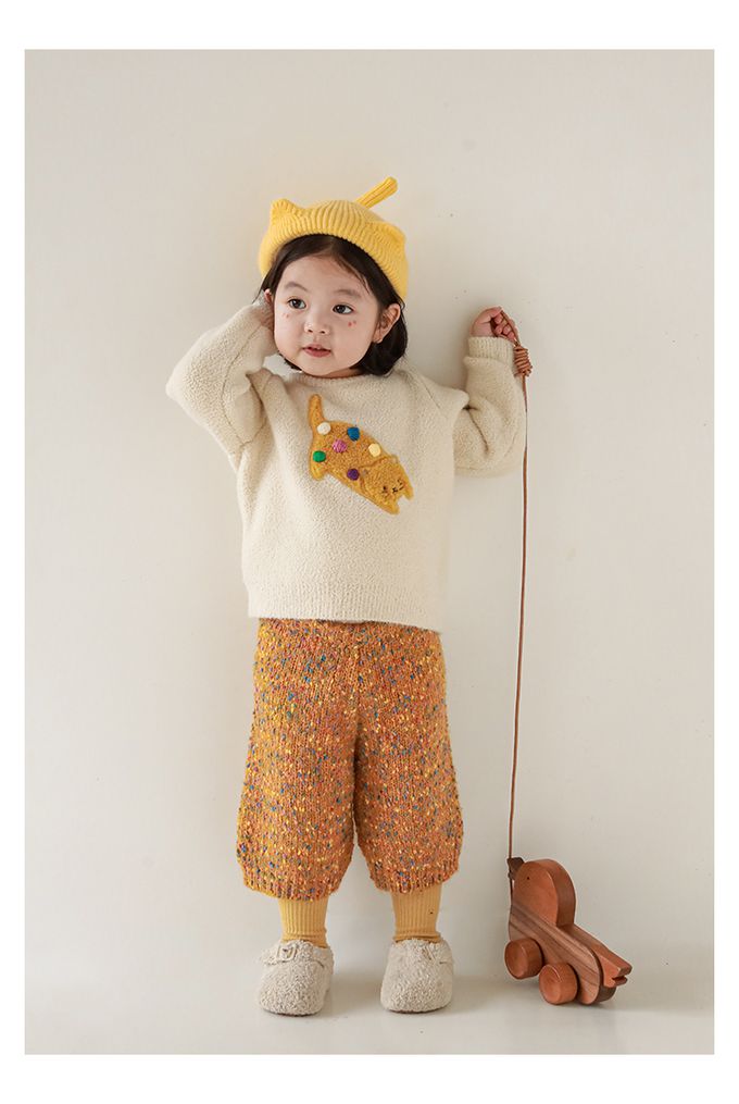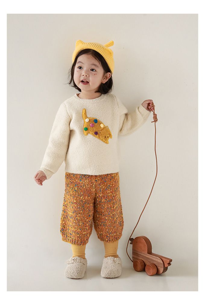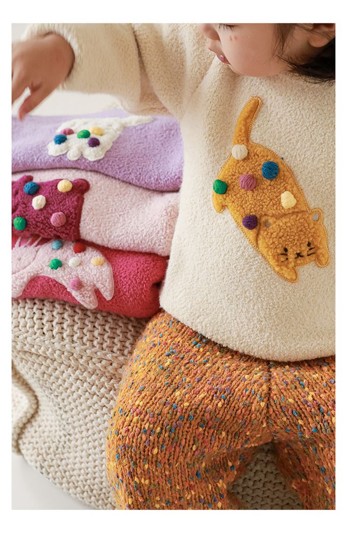 圓領針織長袖上衣-毛茸茸童趣貼布繡-米杏色