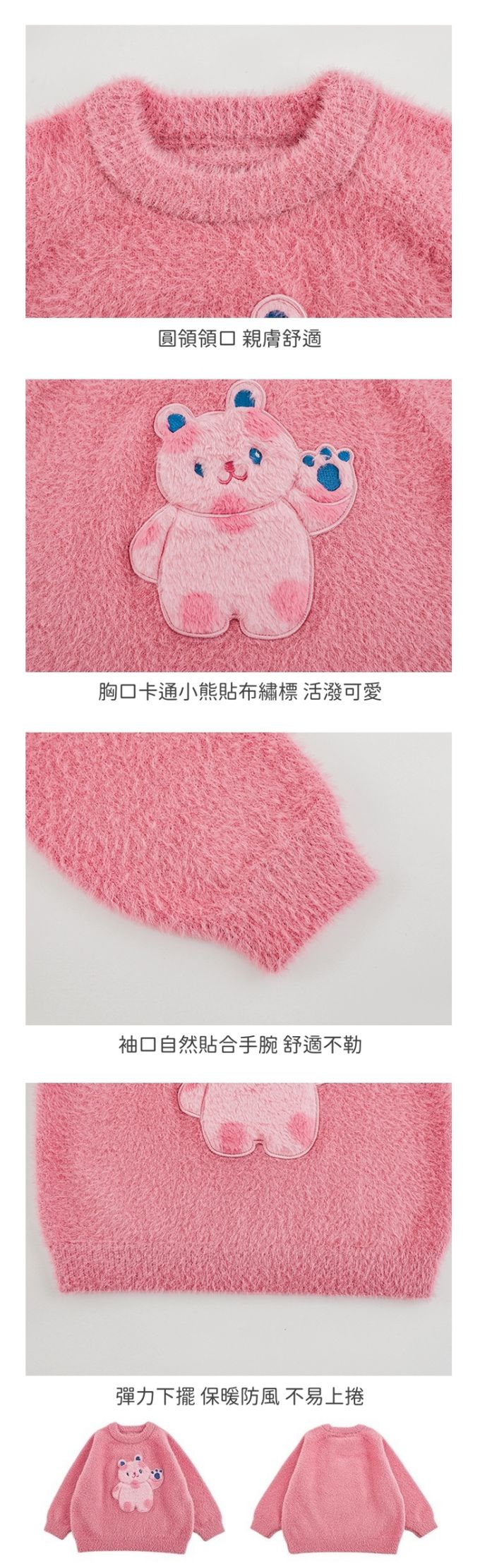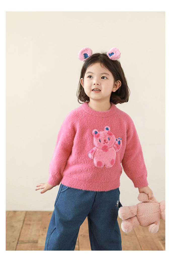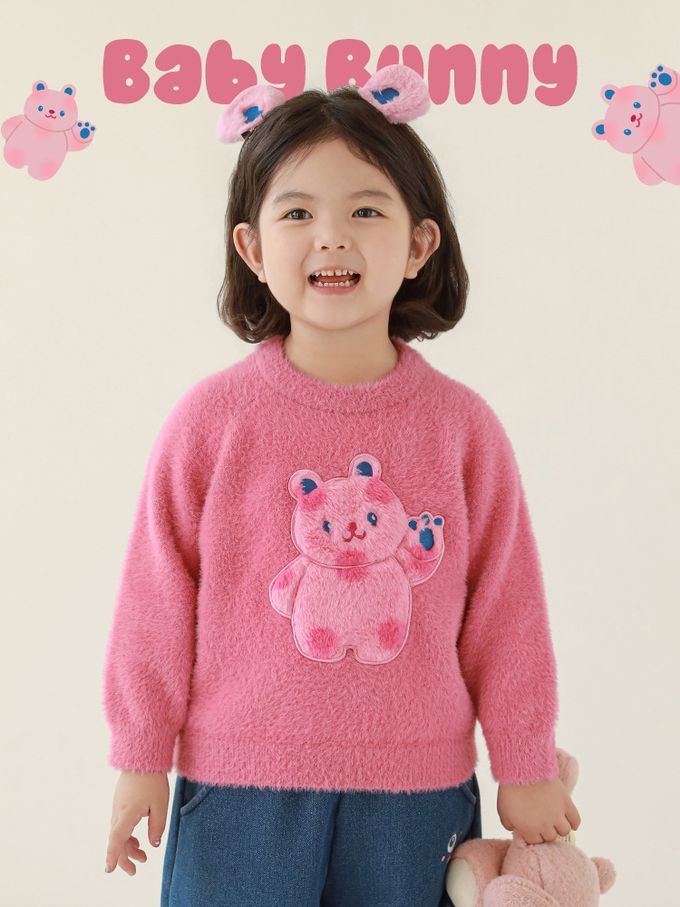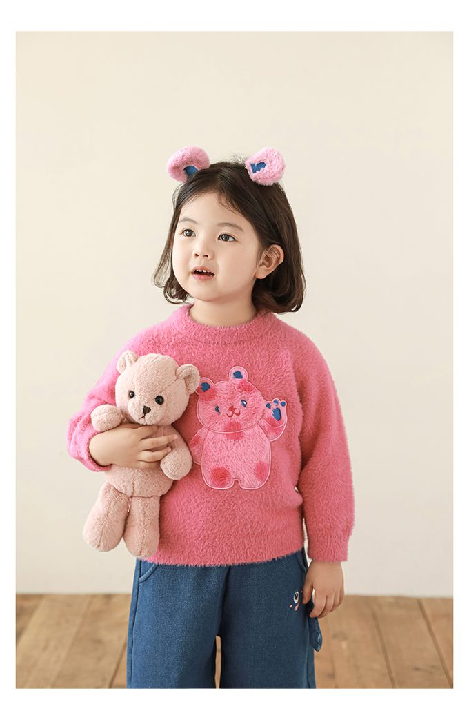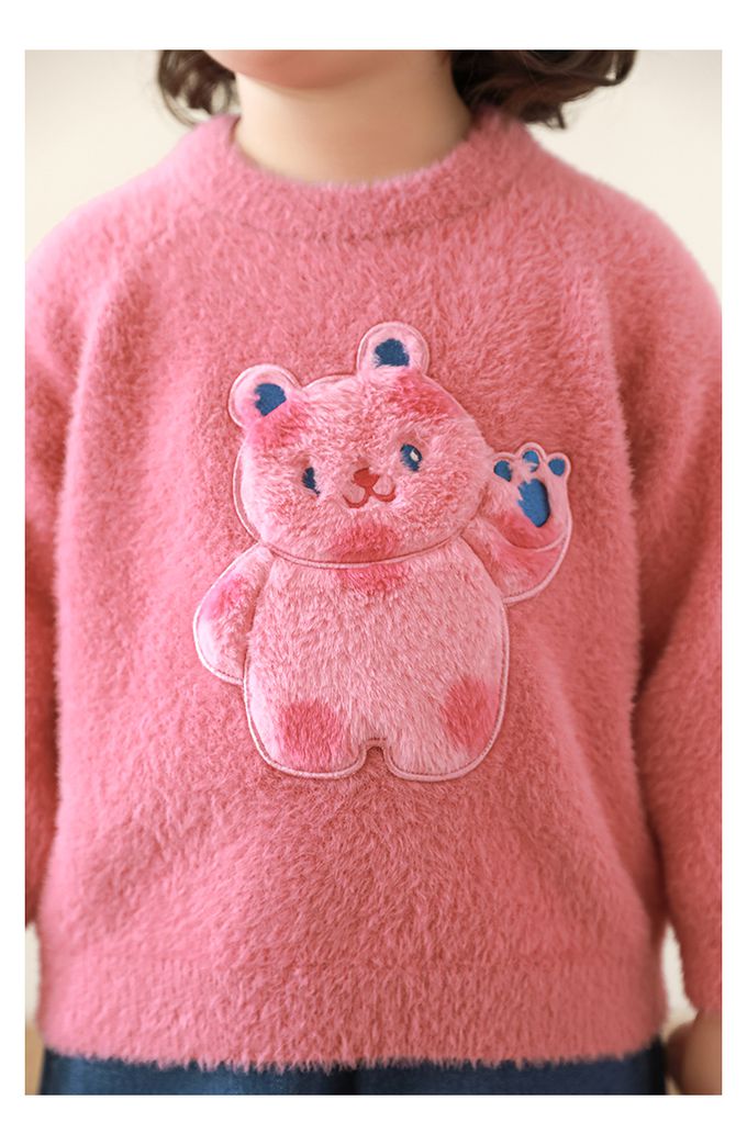 兔毛絨感圓領長袖毛衣-軟萌小熊-粉色
