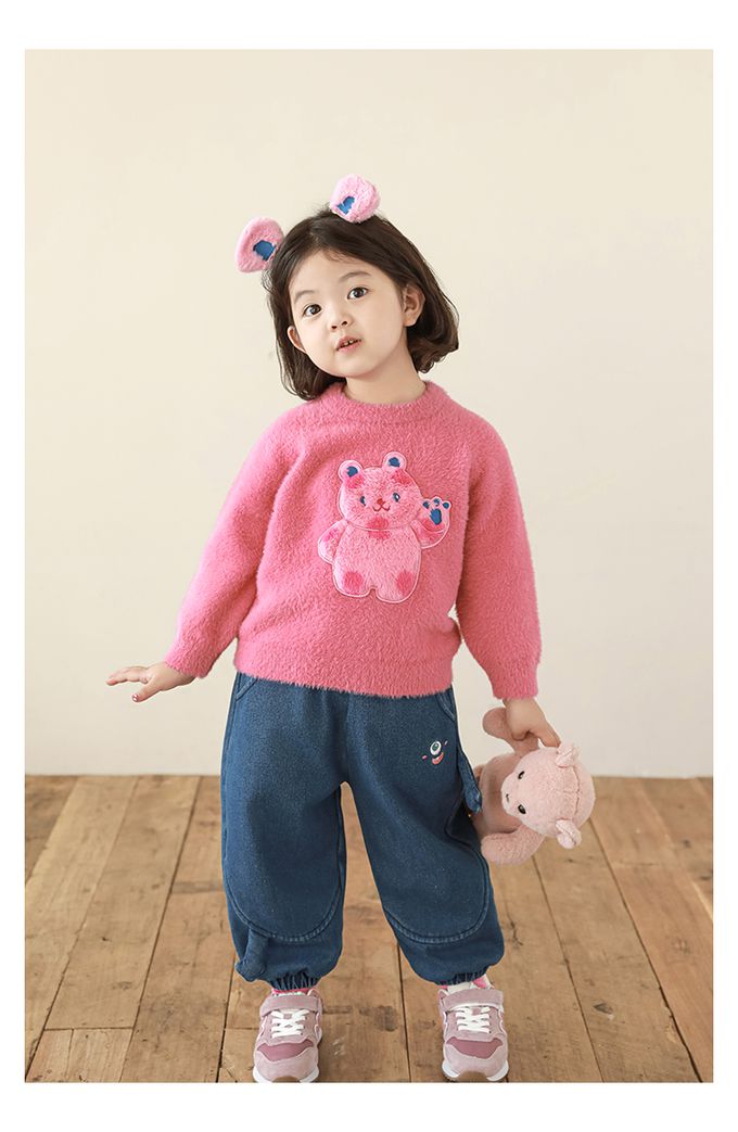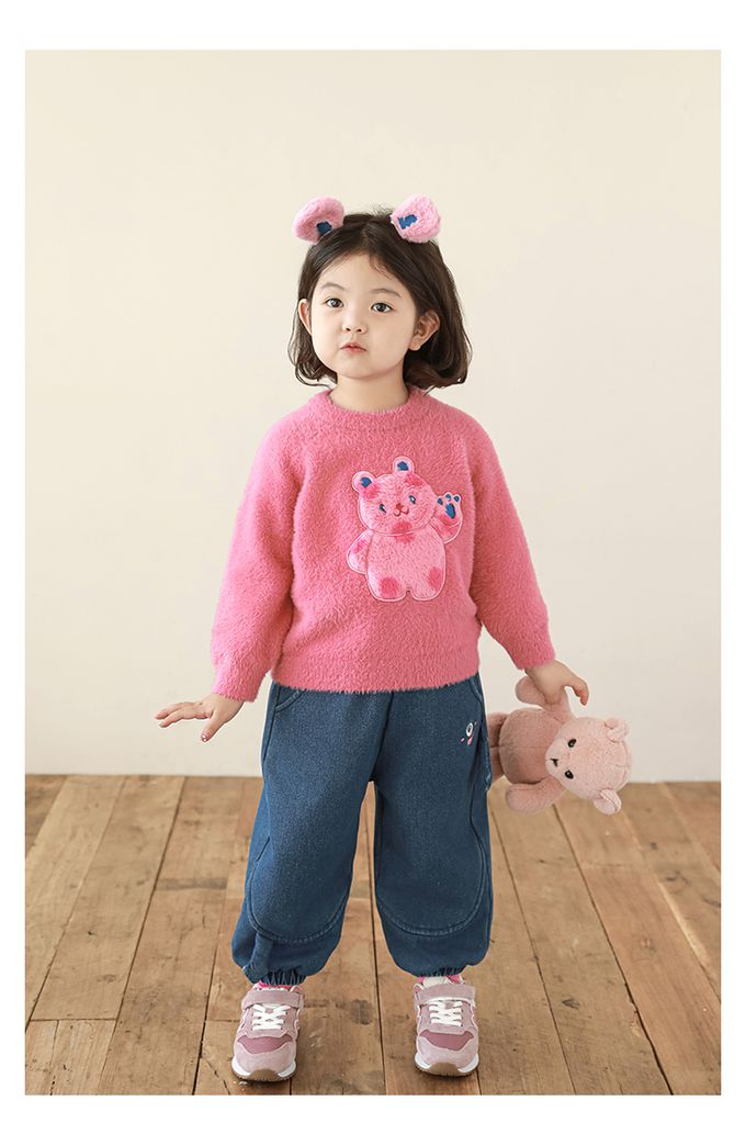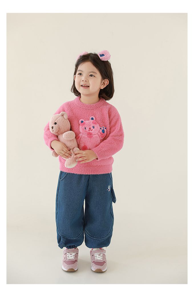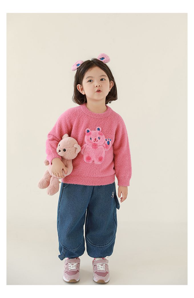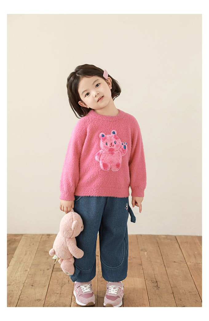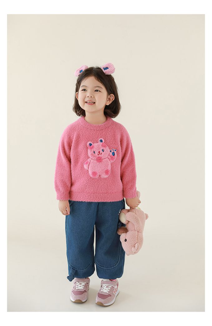 兔毛絨感圓領長袖毛衣-軟萌小熊-粉色