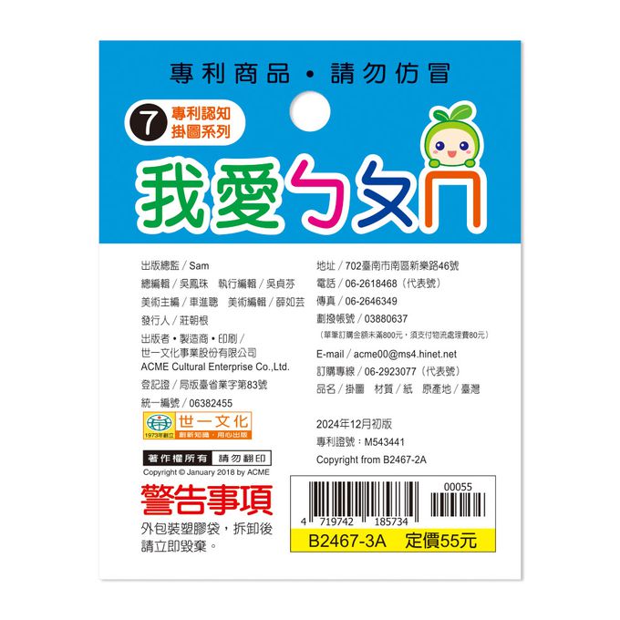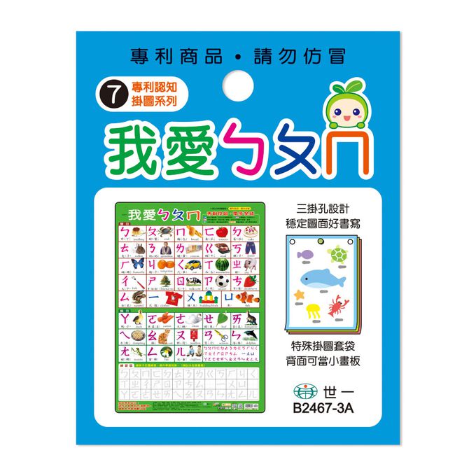 專利掛圖,獨步全球!字大,圖多,畫面清晰,最適合幼兒的多元學習主題.本產品圖文並茂,幫助孩子學習ㄅㄆㄇ念法,寫法及單字詞彙,建立孩子的基本認知.