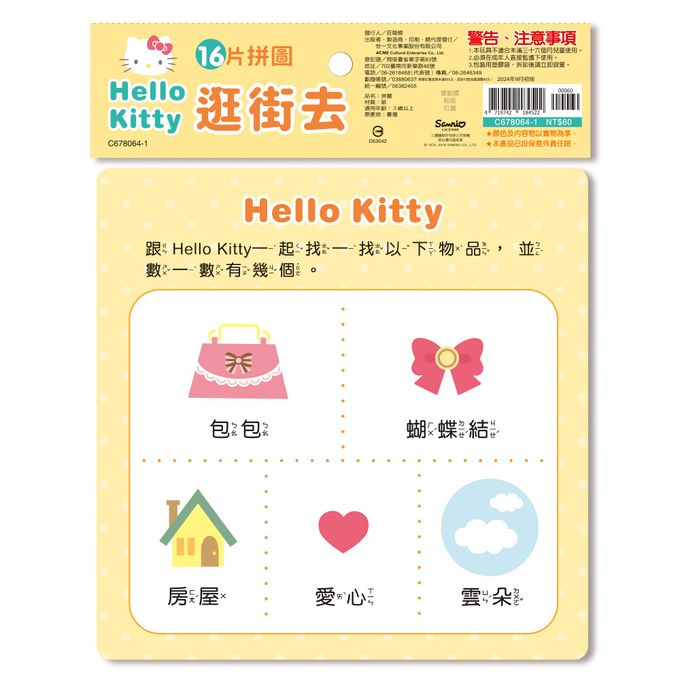 可愛的HELLO KITTY 拼圖不僅可以增強孩子對部分與整體的概念,在拼湊的過程 中培養耐心與專注力;還能促進手部小肌肉的發展及手眼協調,並激發孩子的圖形辨識能力,強化邏輯思考能力!