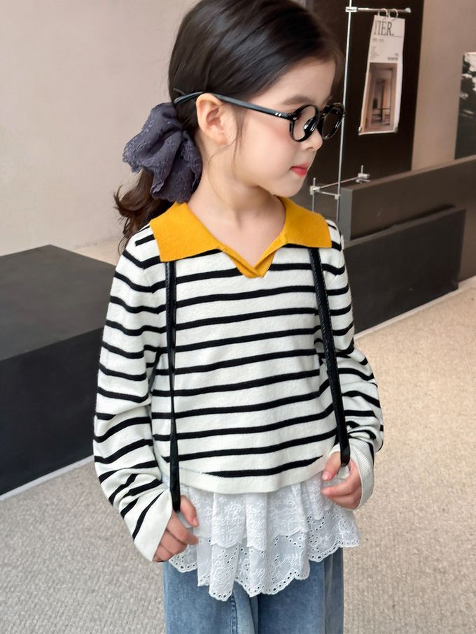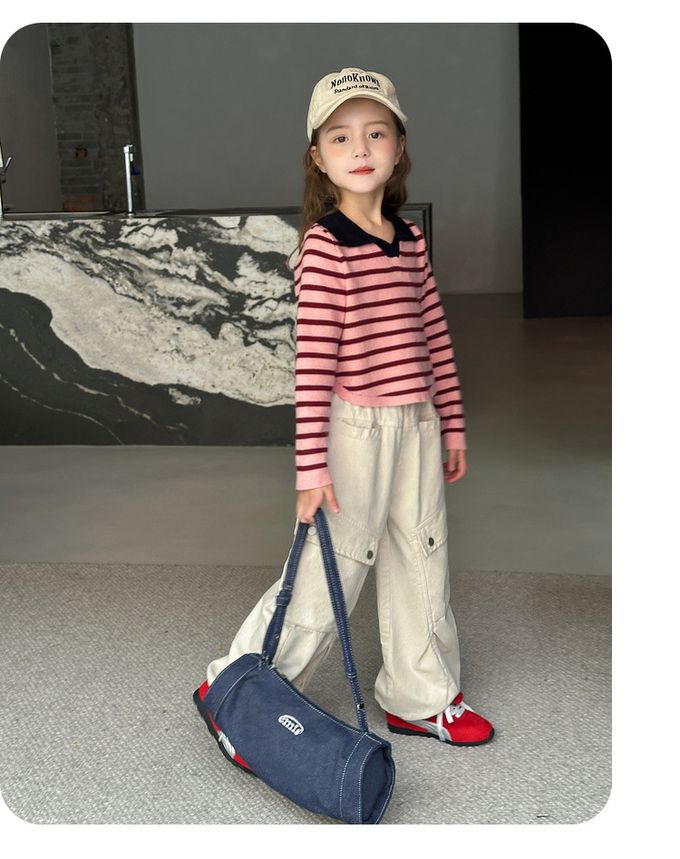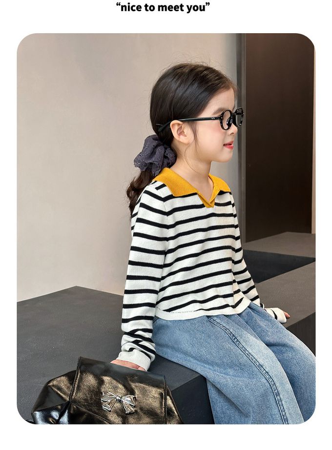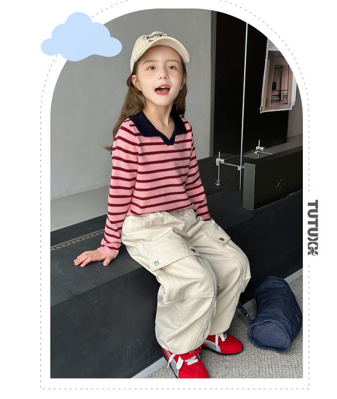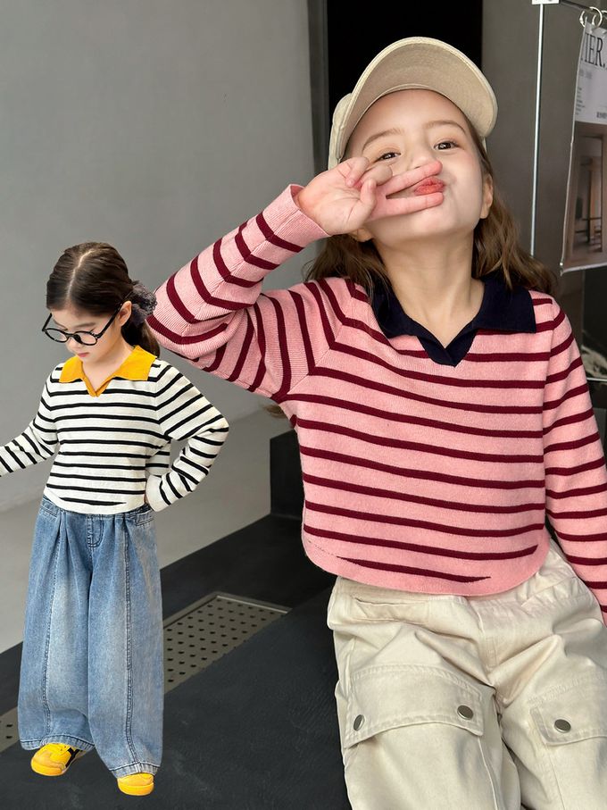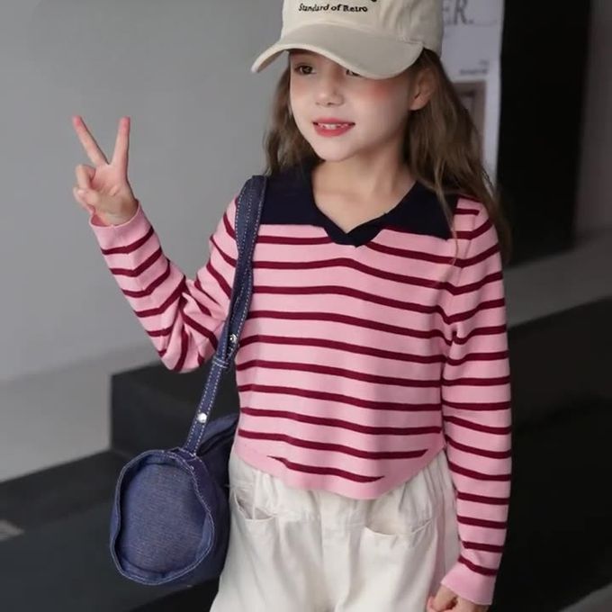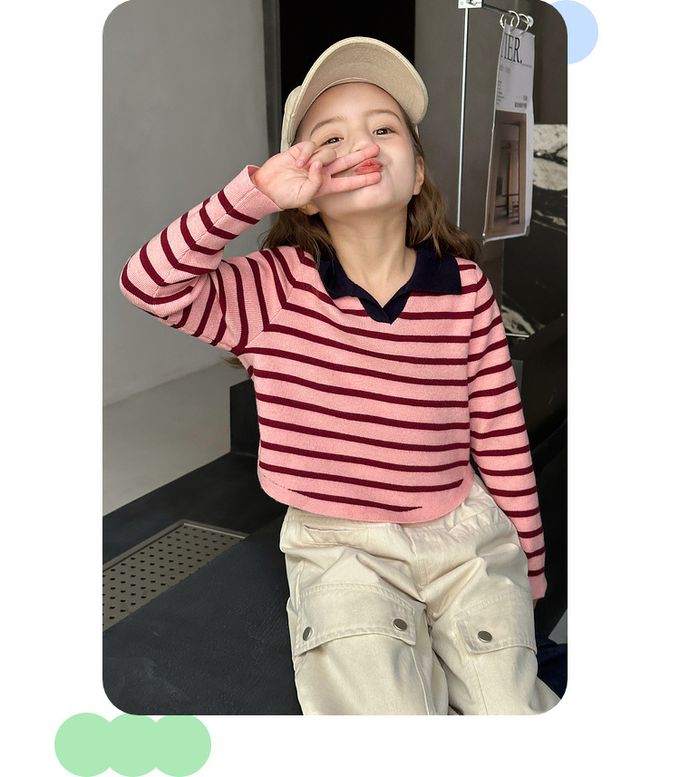 TUTU - 撞色翻領針織長袖上衣-條紋-粉色
