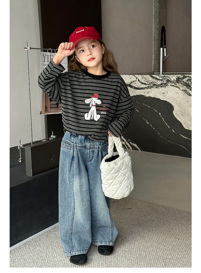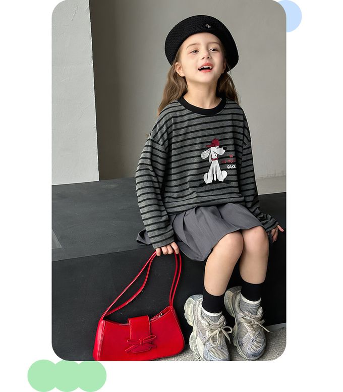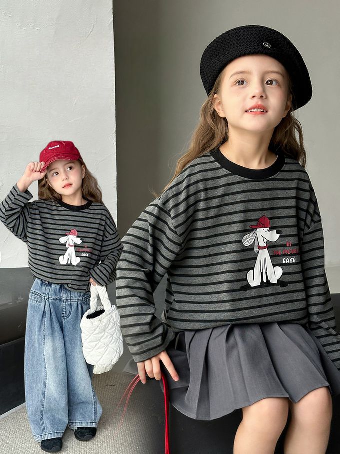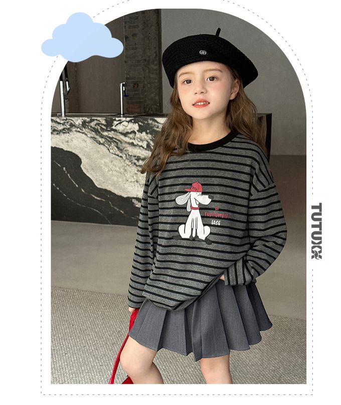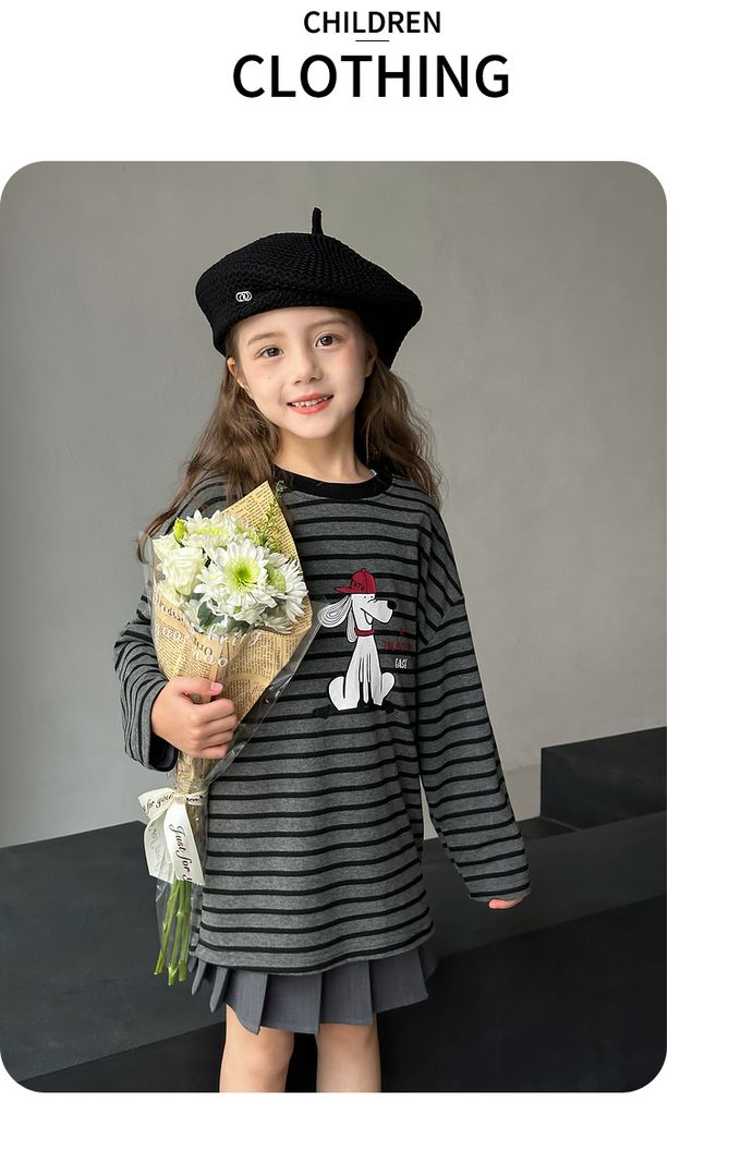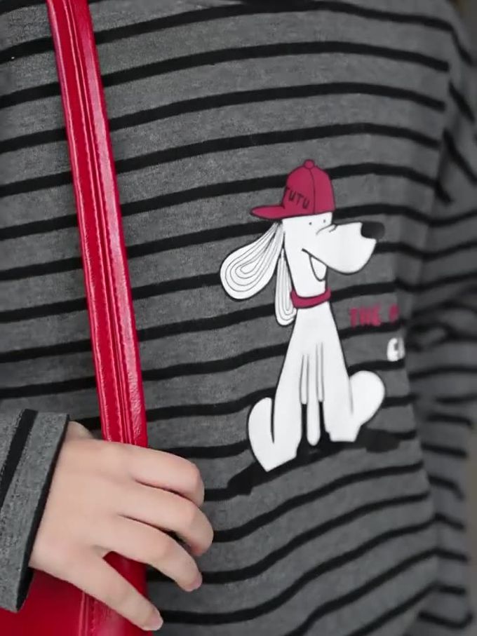 TUTU - 圓領落肩條紋長袖上衣-狗狗印花-黑灰色
