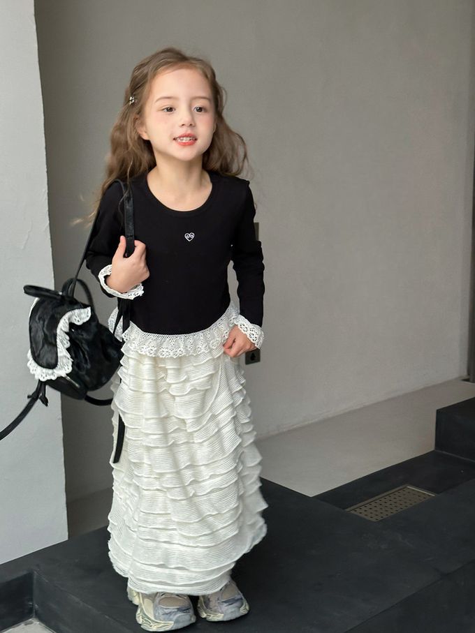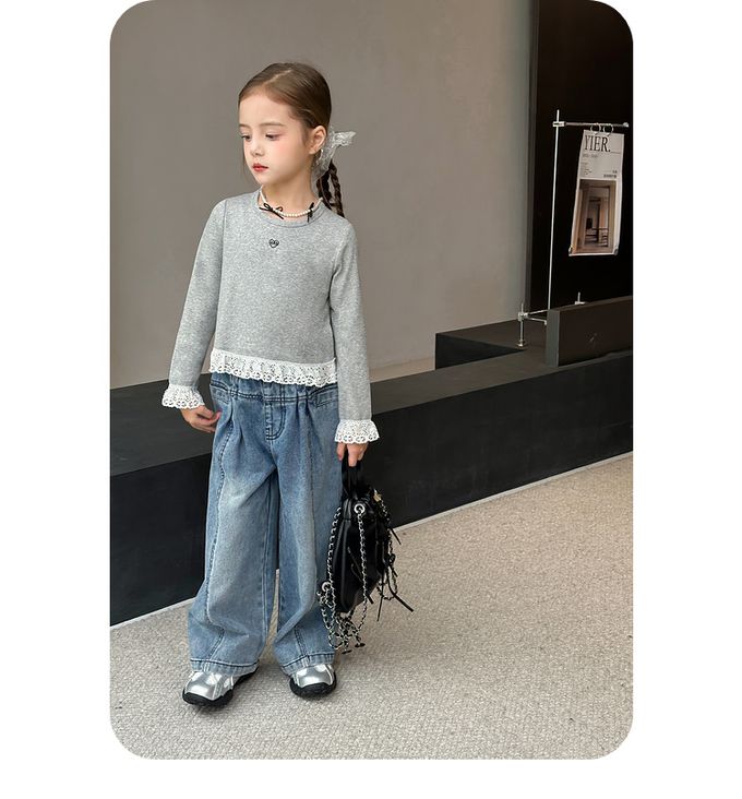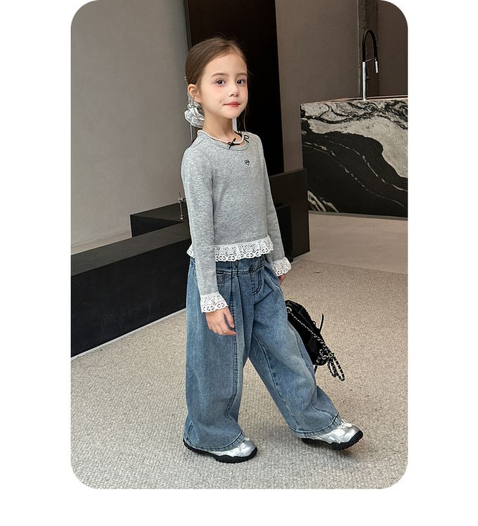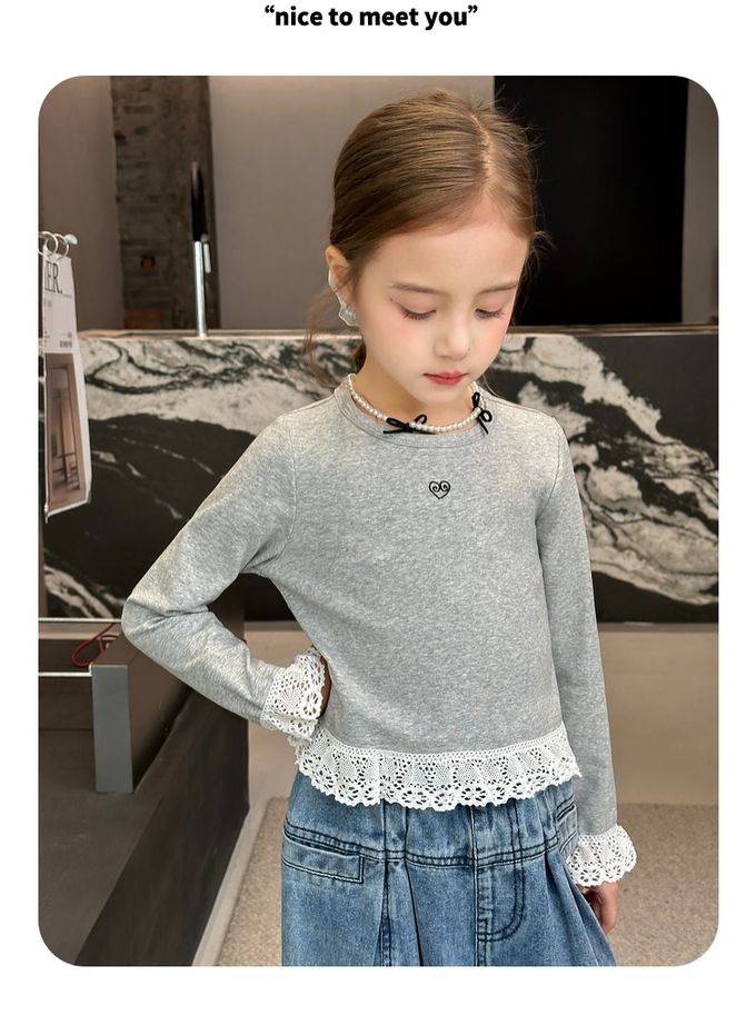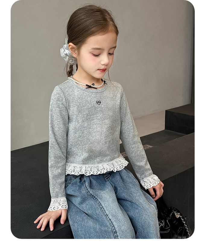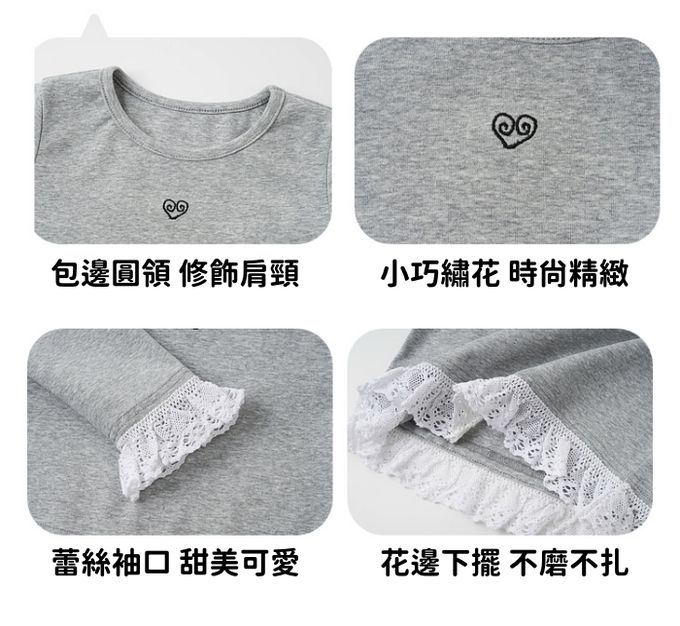 TUTU - 圓領蕾絲花邊長袖上衣-小巧繡花-灰色