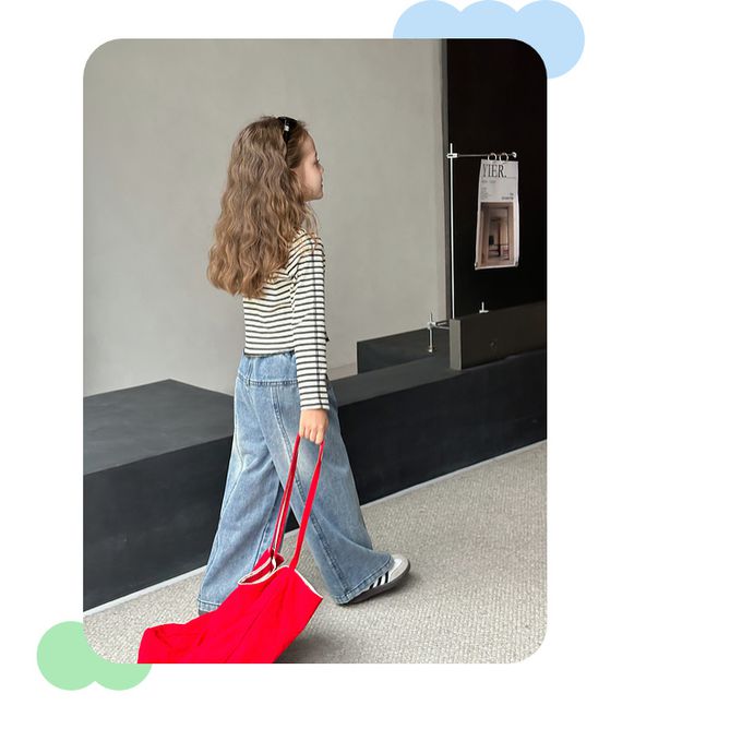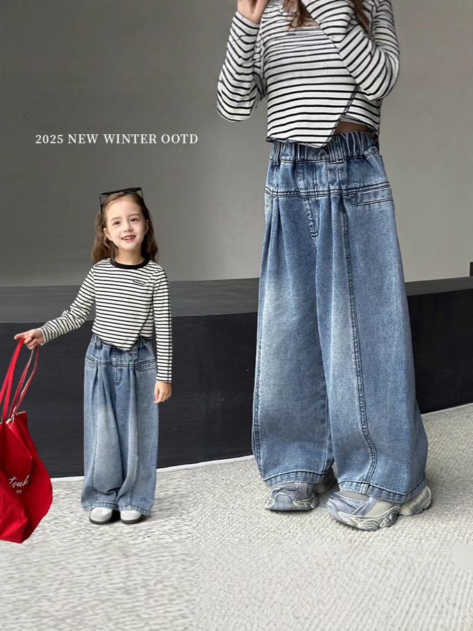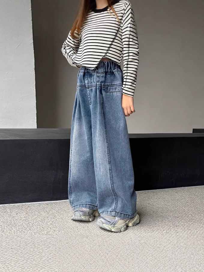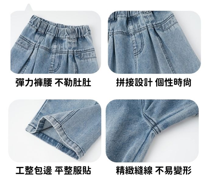 腰鬆緊休閒牛仔寬褲-線條感-藍色