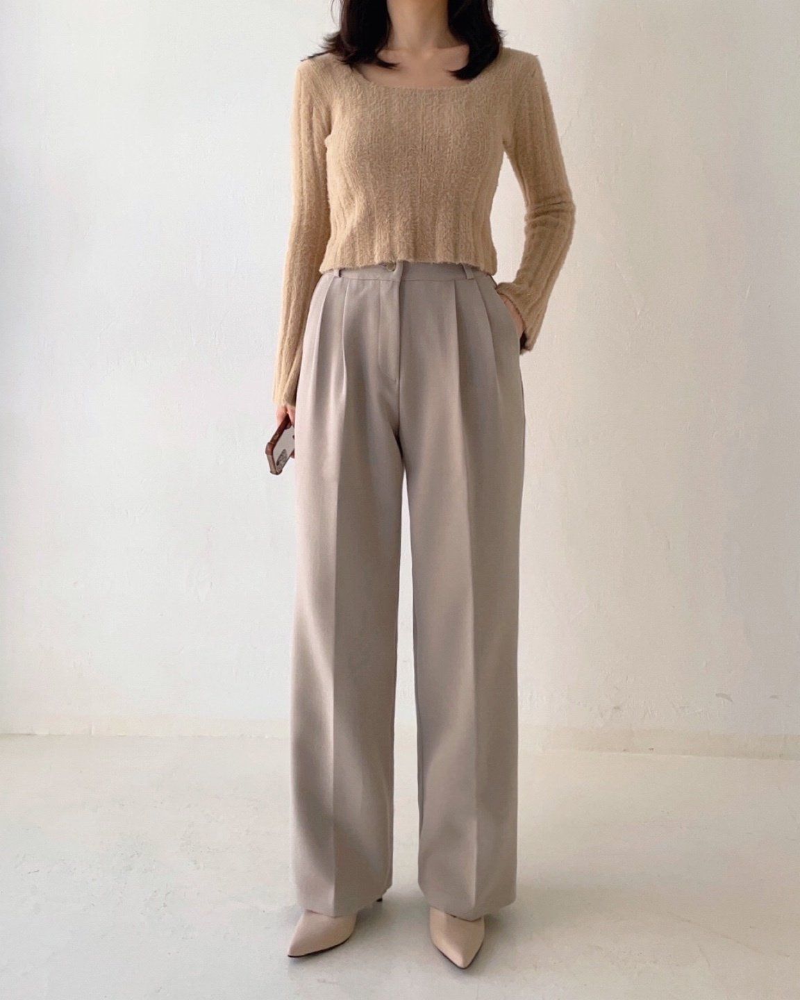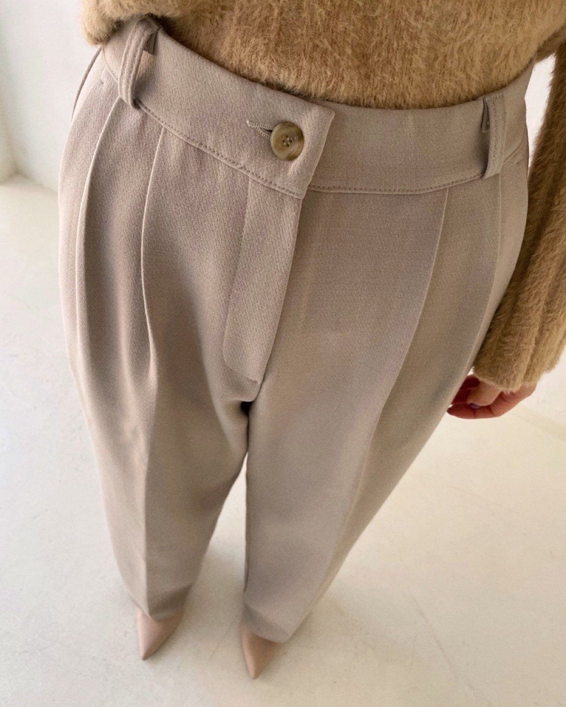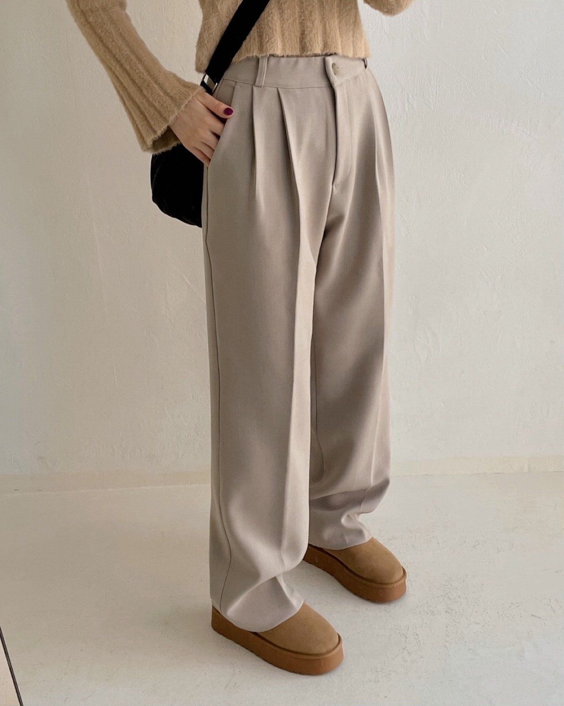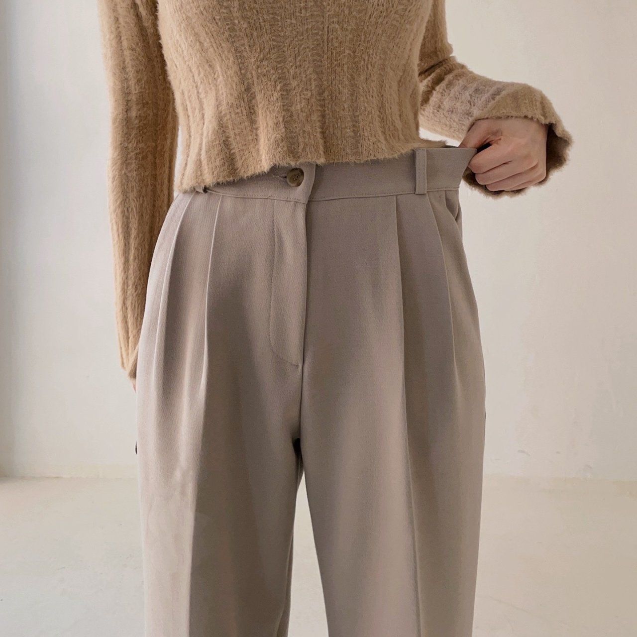• 品名:彈性腰輕磨毛抓褶感西裝落地寬褲