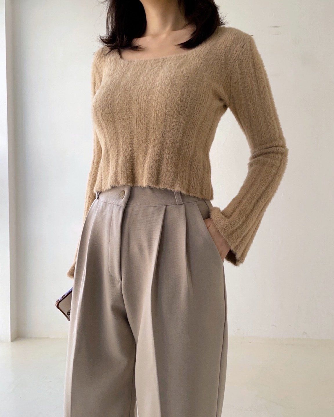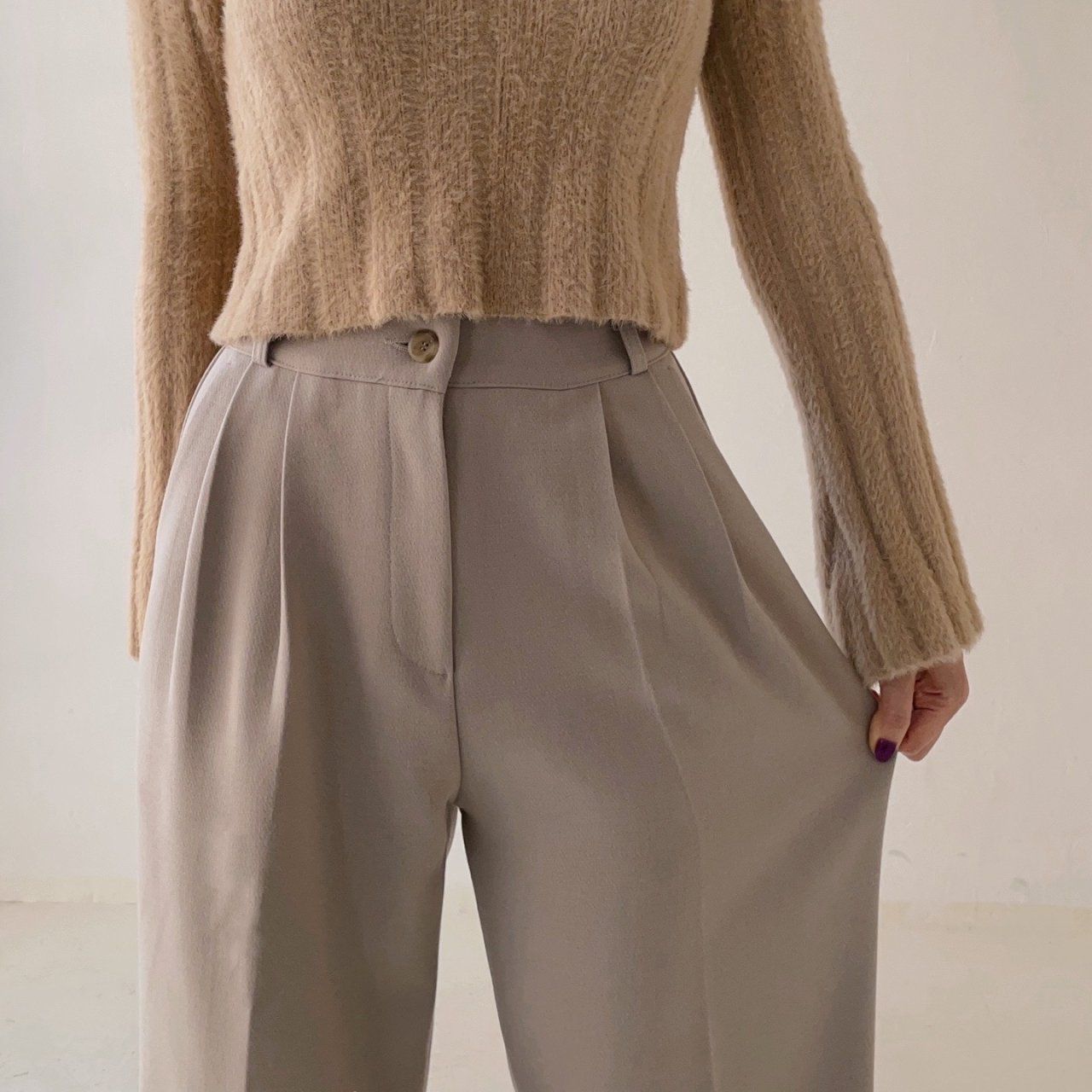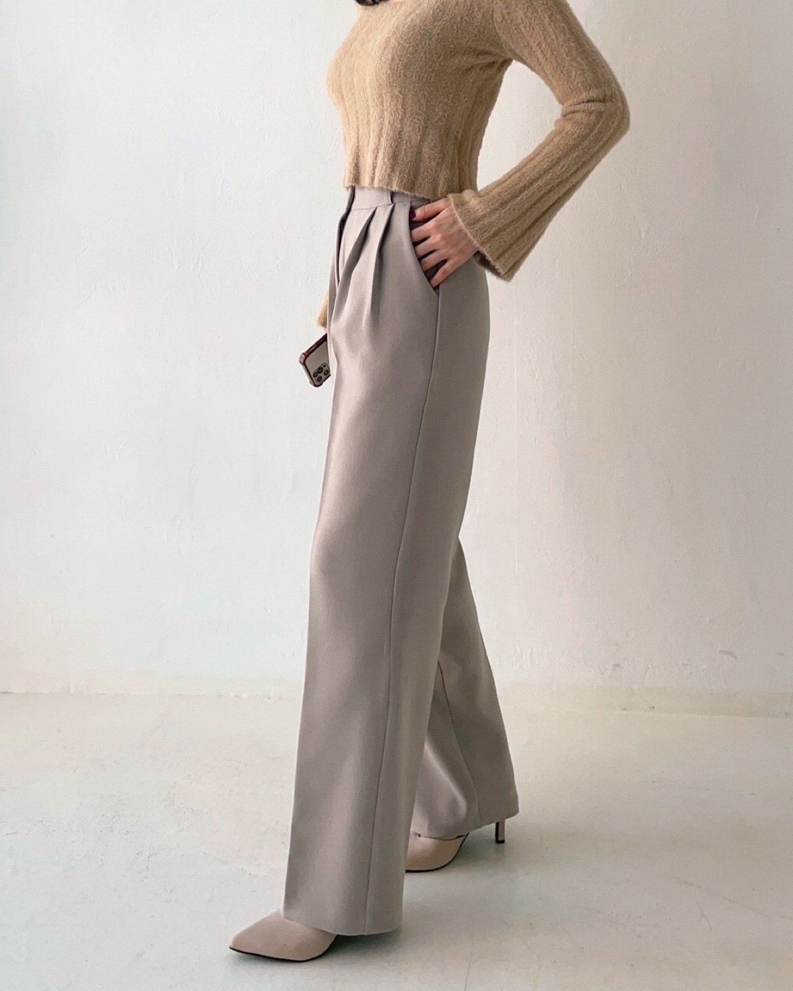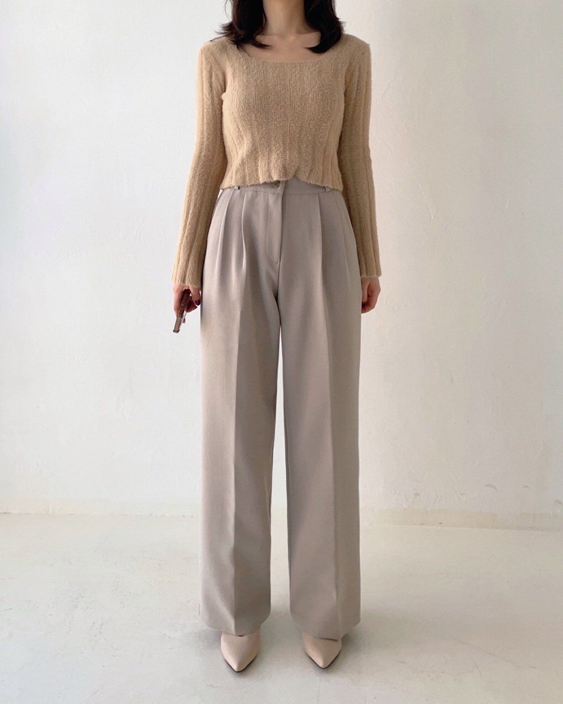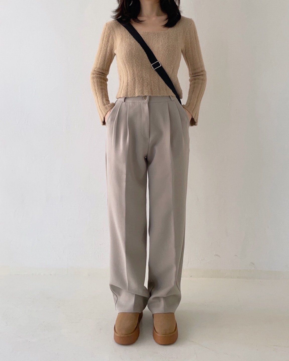 • 品名:彈性腰輕磨毛抓褶感西裝落地寬褲