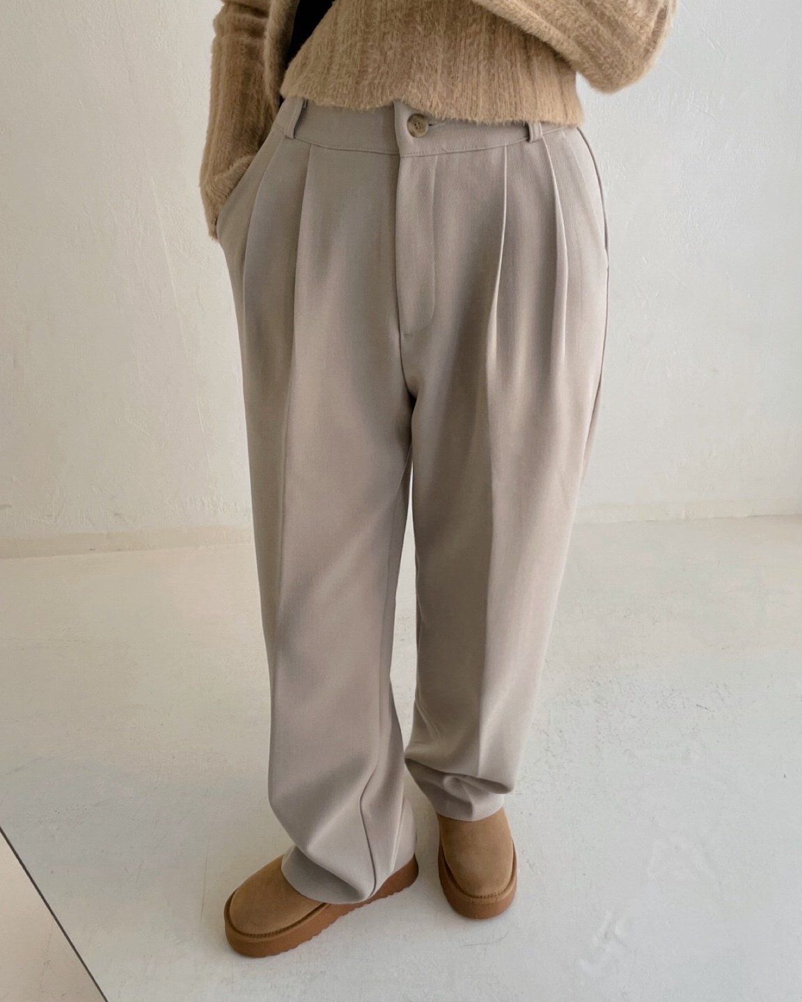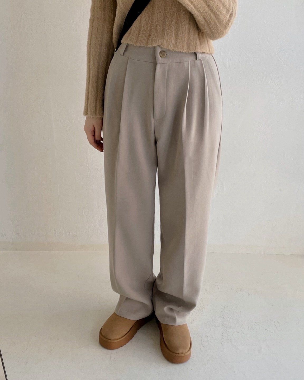 韓國女裝連線 - 彈性腰輕磨毛抓褶感西裝落地寬褲-卡其杏