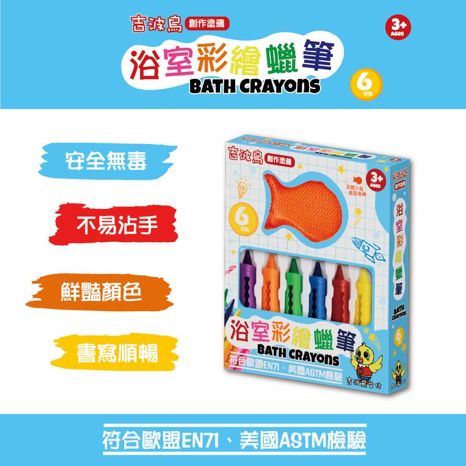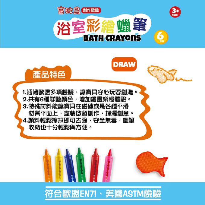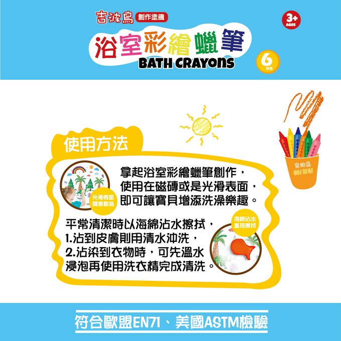拿起浴室彩繪蠟筆創作,使用在磁磚或是光滑表面,即可讓寶貝增添洗澡樂趣。
