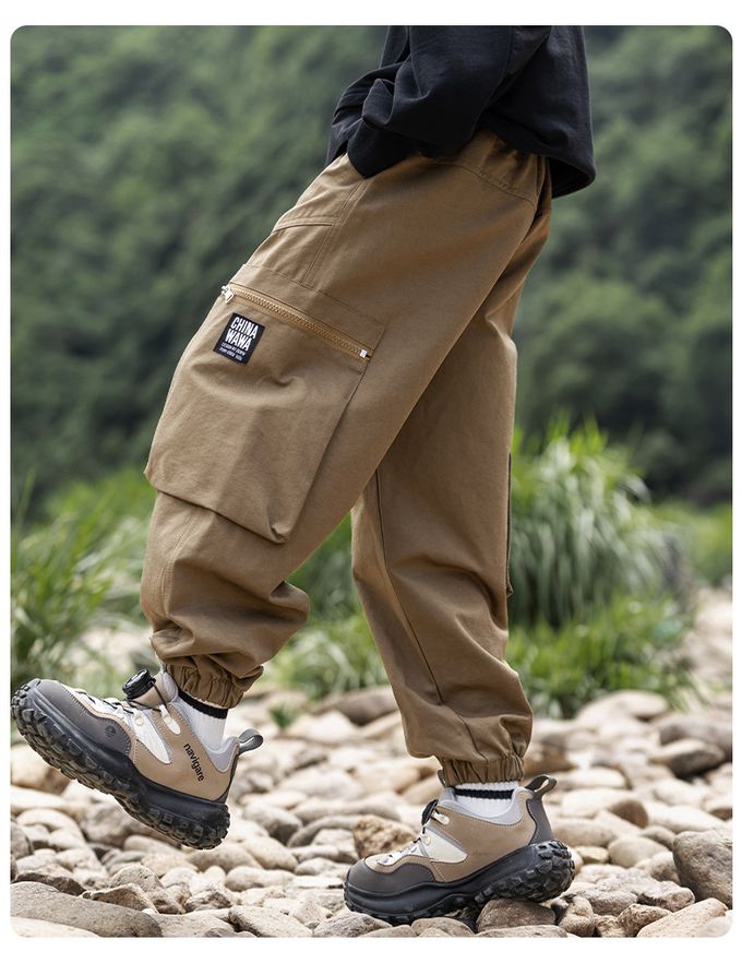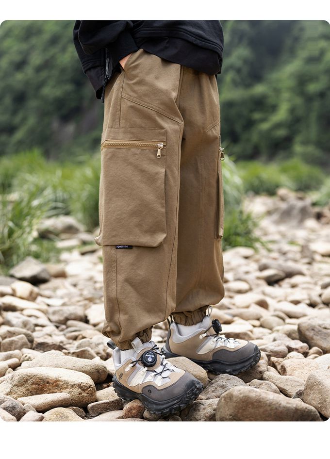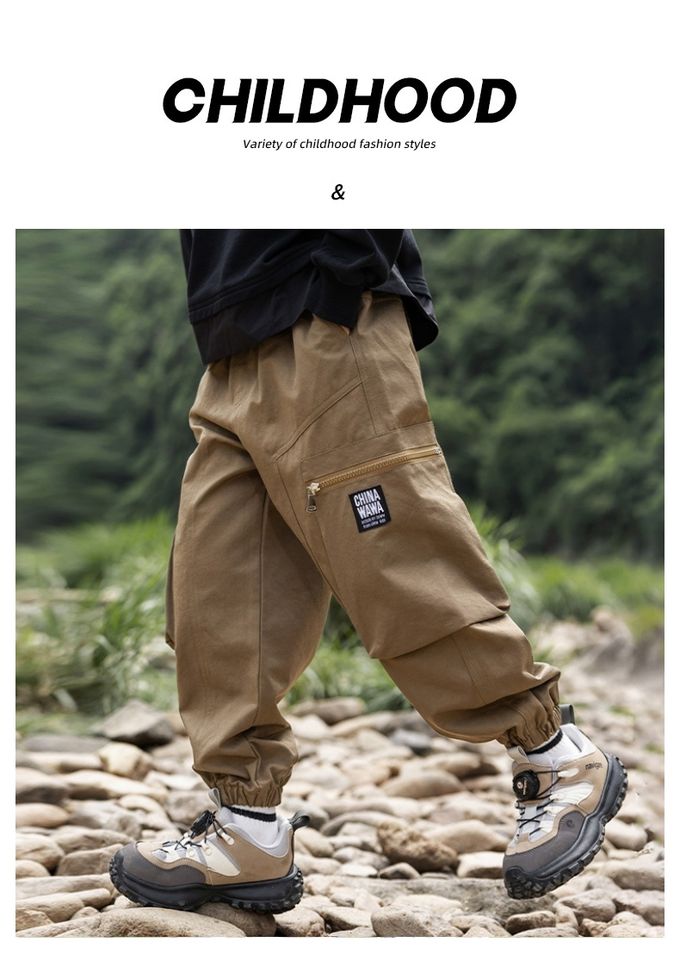 純棉腰鬆緊拉鍊口袋工裝長褲-卡其色
