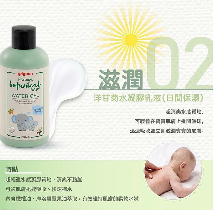 注意事項:【商品規格】 成份:橄欖油、摩洛哥堅果油、洋甘菊萃取...,全成份詳見外包裝標示。 容量:200ml 產地:泰國 【注意事項】 ● 若肌膚不適,或有傷口、濕疹等異常部位,請勿使用。 ● 使用期間,如有發紅、紅腫、搔癢、刺激等異常狀況,請停止使用,並向皮膚科醫師諮詢。 ● 請勿將產品放置在嬰幼兒可觸及的地方。 ● 請勿將本產品放置在高溫、低溫或潮濕的地方,並避免陽光直接照射。 ● 使用方法:寶寶洗澡後或任何時間,取適量乳液在手掌上,溫柔地爲寶寶按摩肌膚。