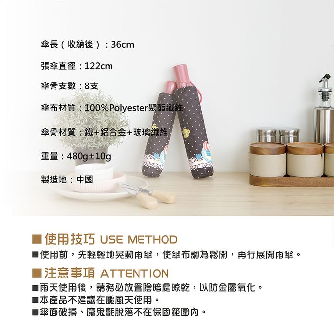 注意事項:1.雨天使用後,請務必放置於陰暗處晾乾,以防金屬氧化。 2.本產品不建議在颱風天使用。