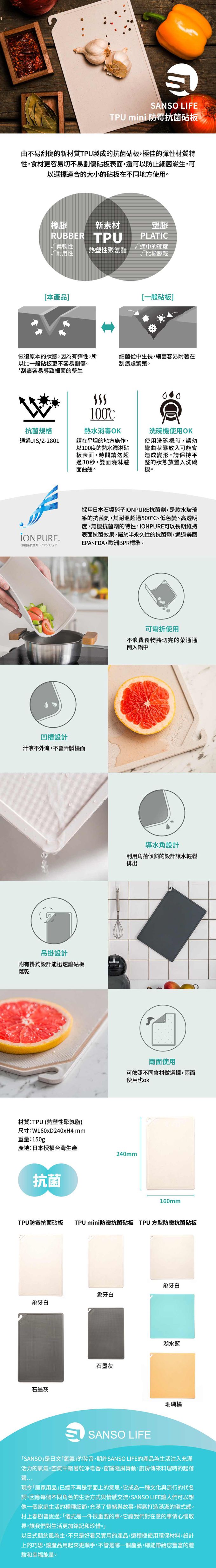 由不易刮傷的新材質TPU製成的抗菌砧板,極佳的彈性材質特性,食材更容易切不易劃傷砧板表面,還可以防止細菌滋生,可以選擇適合的大小的砧板在不同地方使用。添加日本石塚硝子IONPURE抗菌劑,是款水玻璃系的抗菌劑,其耐溫超過500℃、低色變、高透明度,無機抗菌劑的特性可以長期維持表面抗菌效果,通過美國EPA、FDA,歐洲BPR標準,消費者可以安心使用。