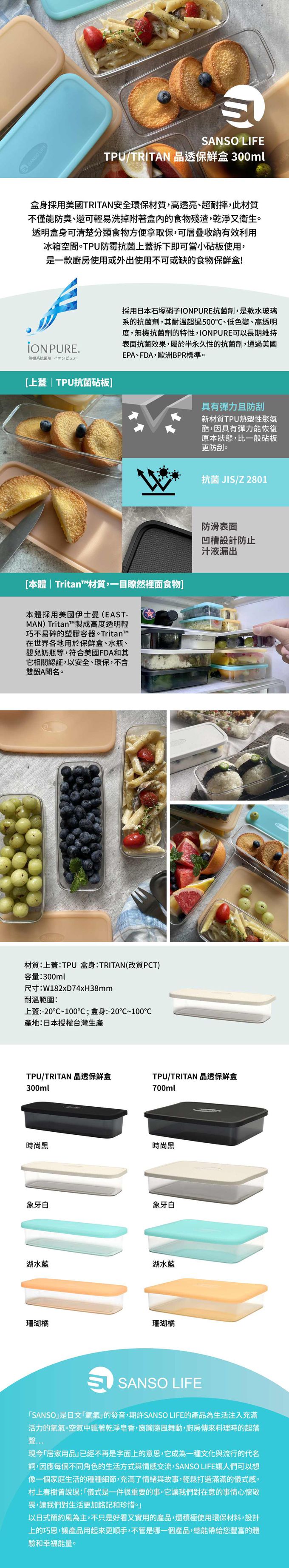 TPU上蓋添加日本石塚硝子IONPURE抗菌劑,是款水玻璃系的抗菌劑,其耐溫超過500℃、低色變、高透明度,無機抗菌劑的特性可以長期維持表面抗菌效果,通過美國EPA、FDA,歐洲BPR標準,消費者可以安心使用。TPU防霉抗菌上蓋拆下即可當小砧板使用,是一款廚房使用或外出使用不可或缺的食物保鮮盒!