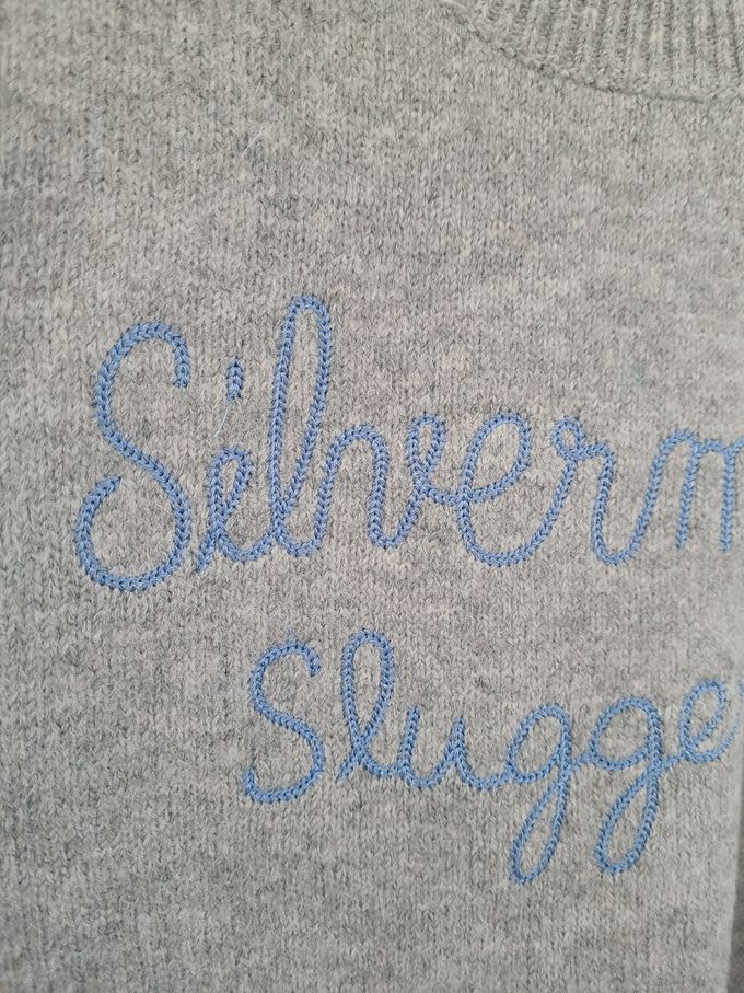 韓國女裝連線 - 刺繡文字點綴圓領針織上衣-淺灰 (FREE)