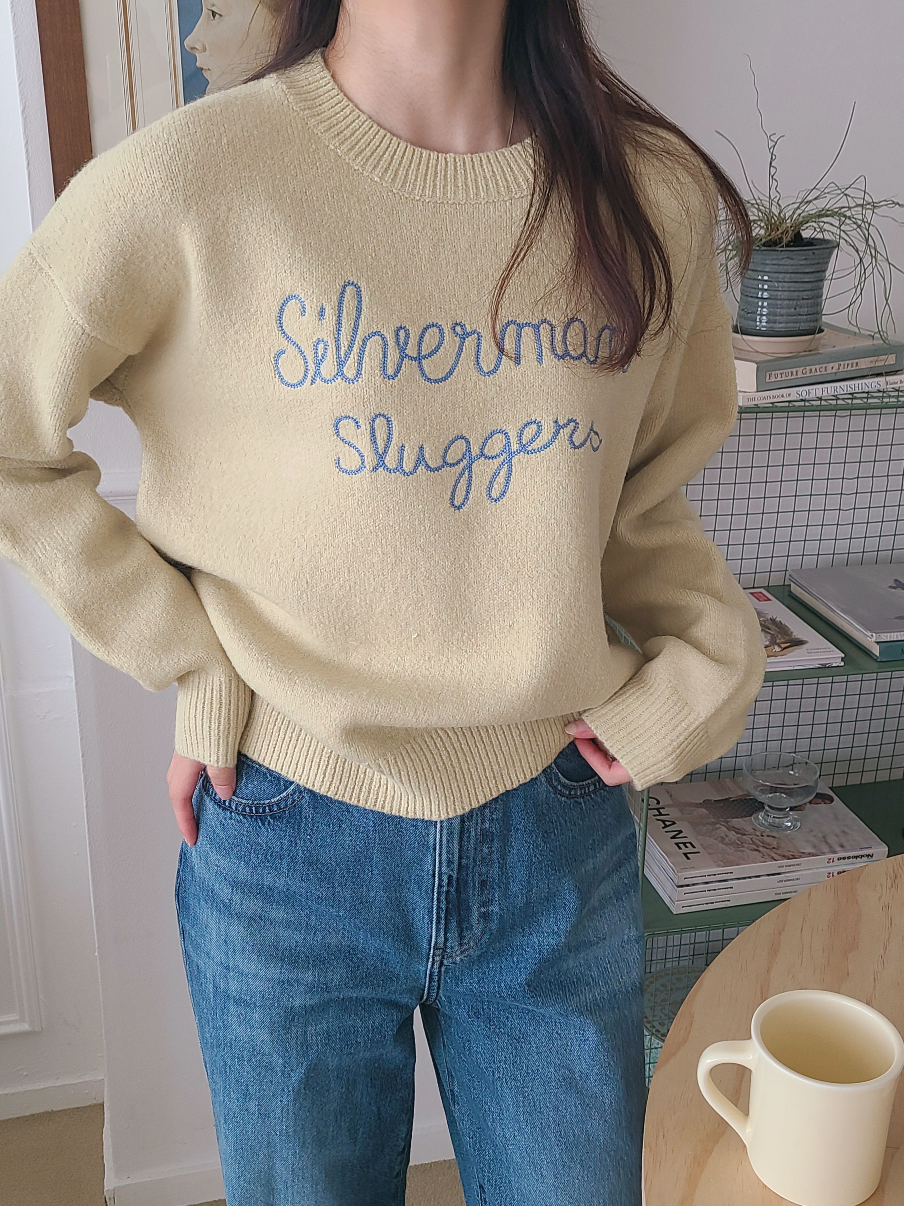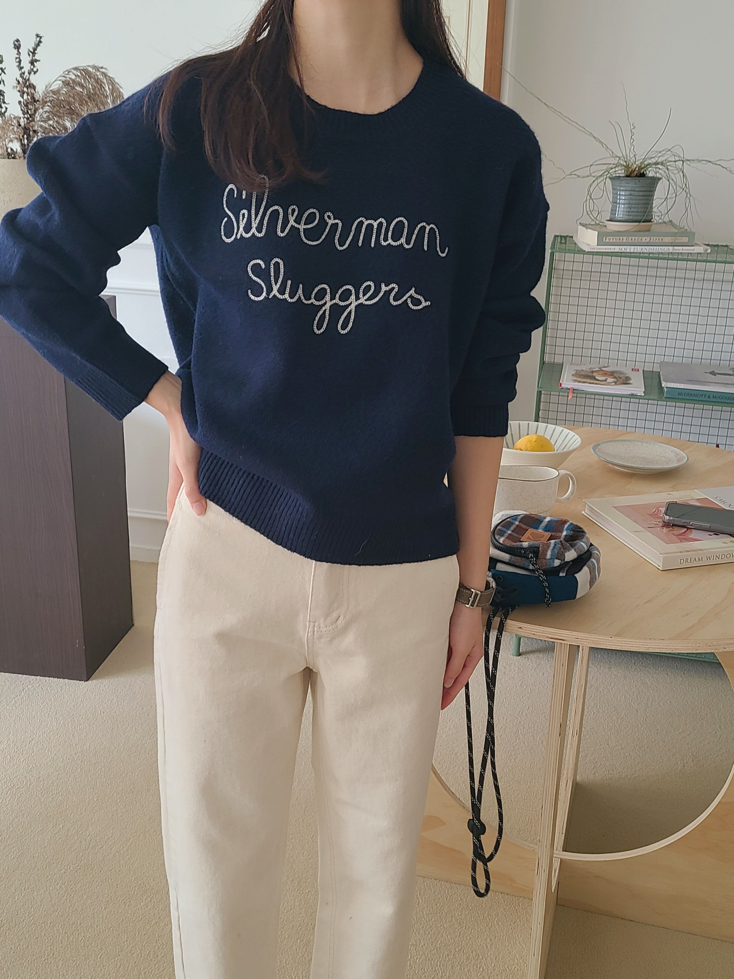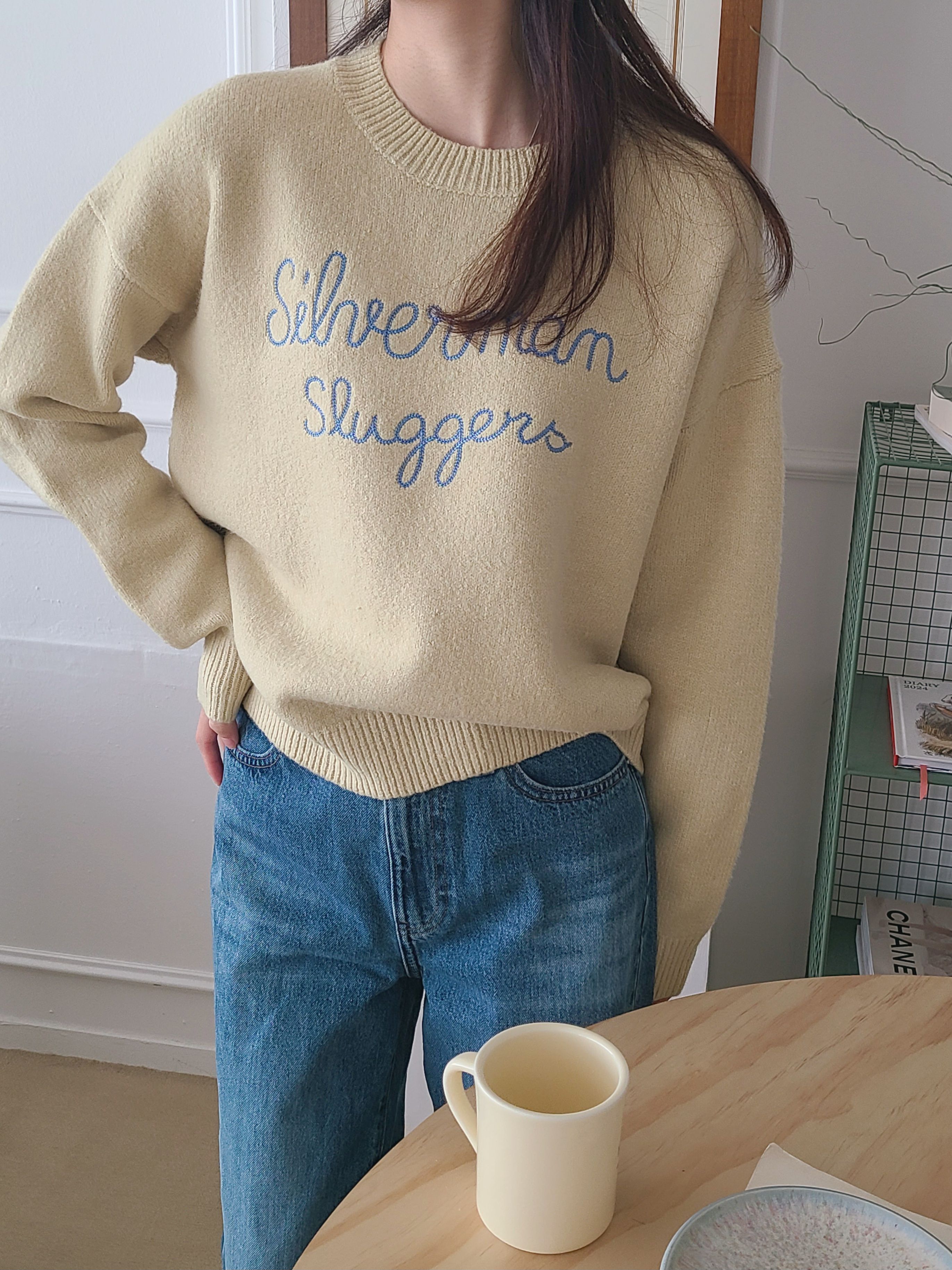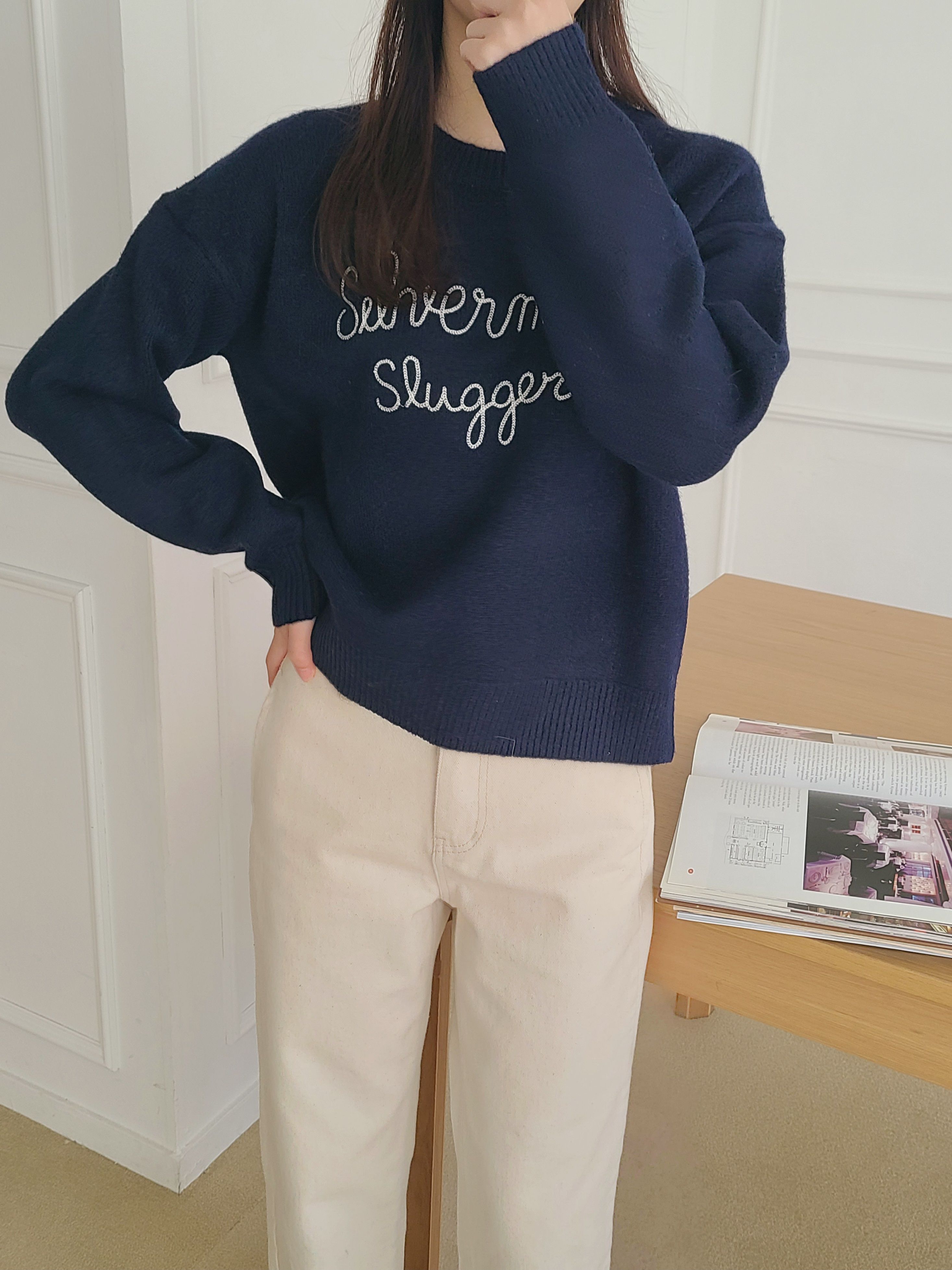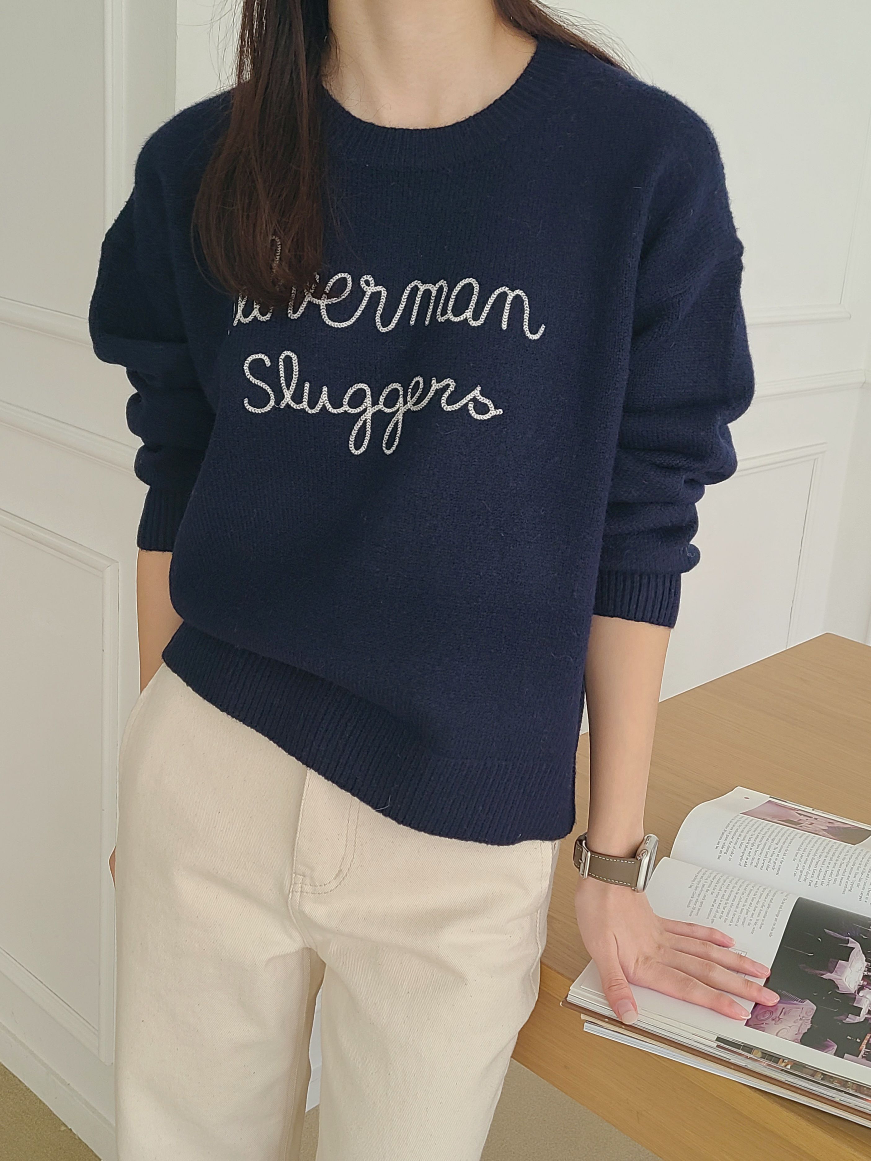 韓國女裝連線 - 刺繡文字點綴圓領針織上衣