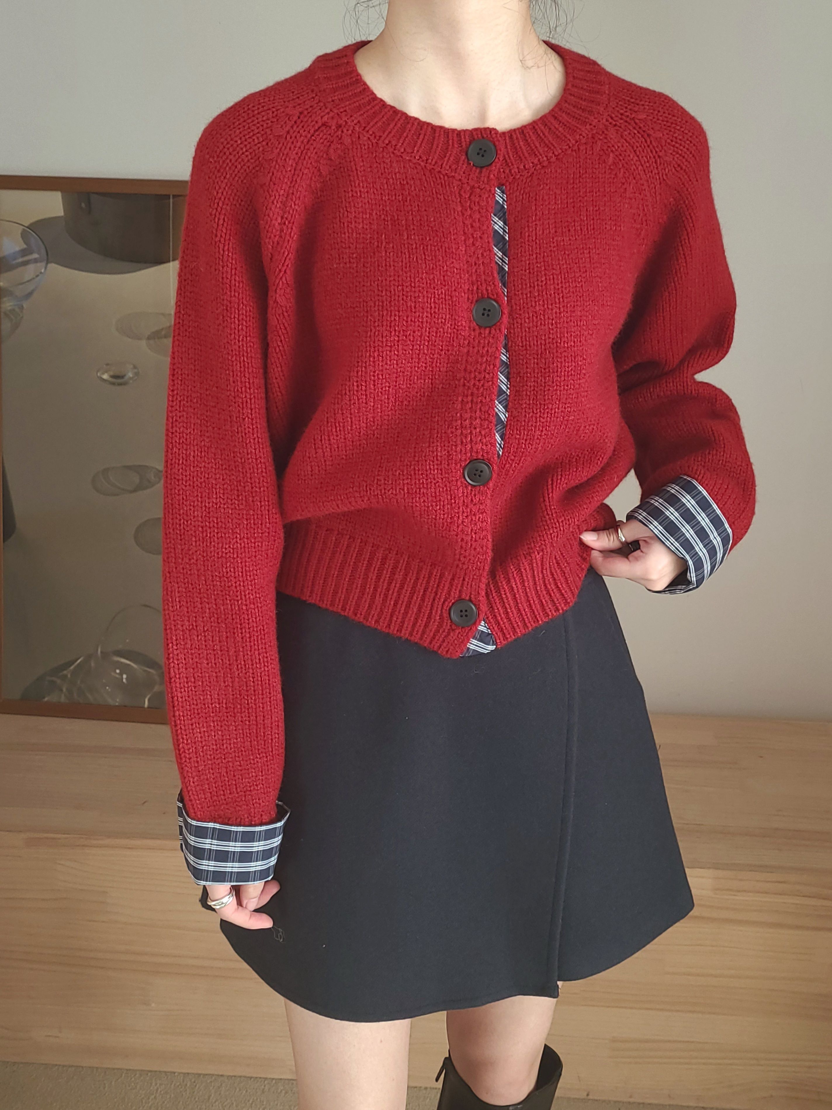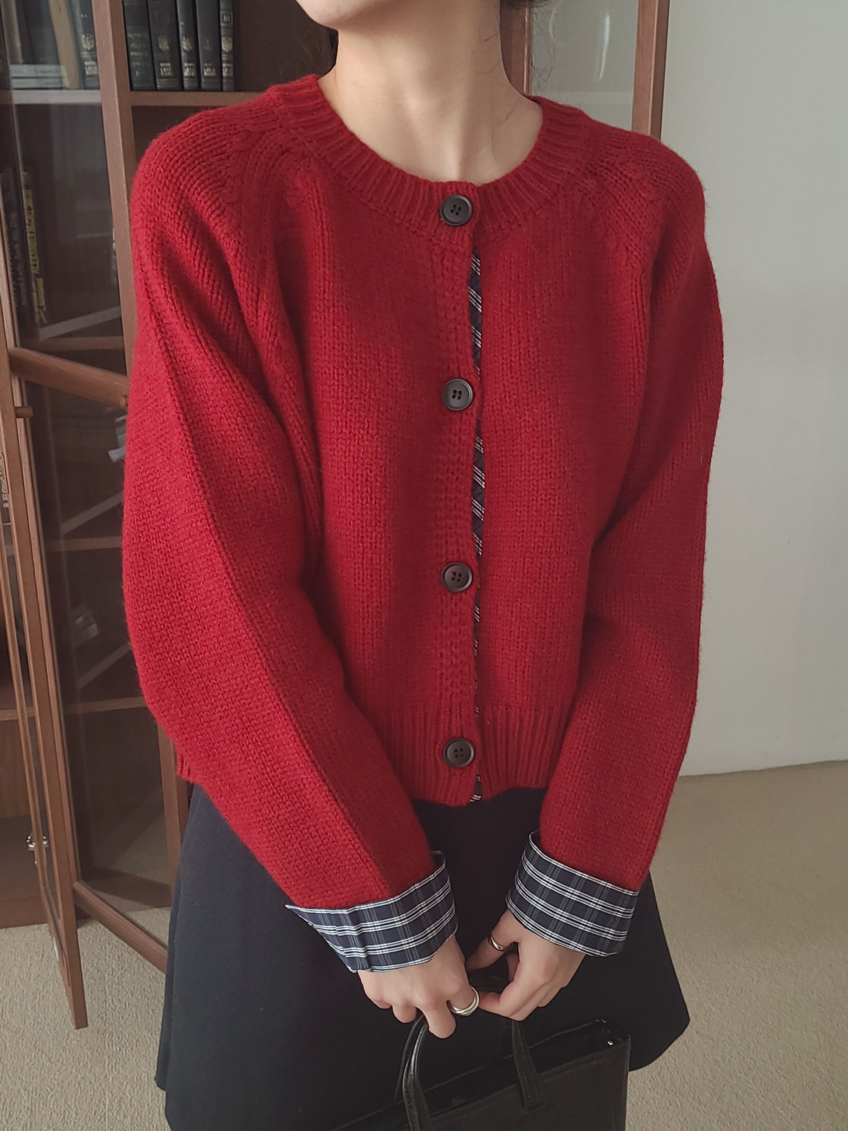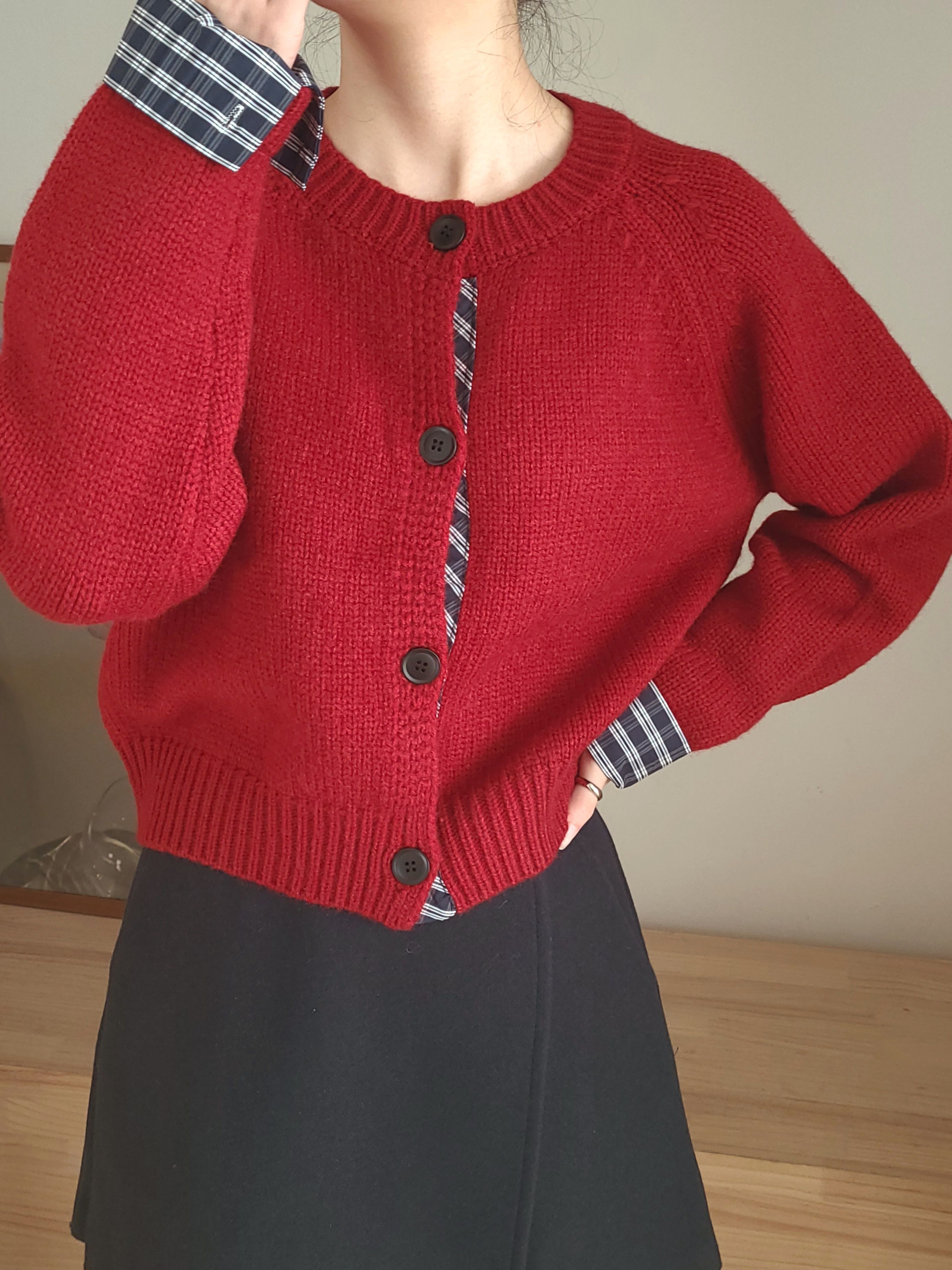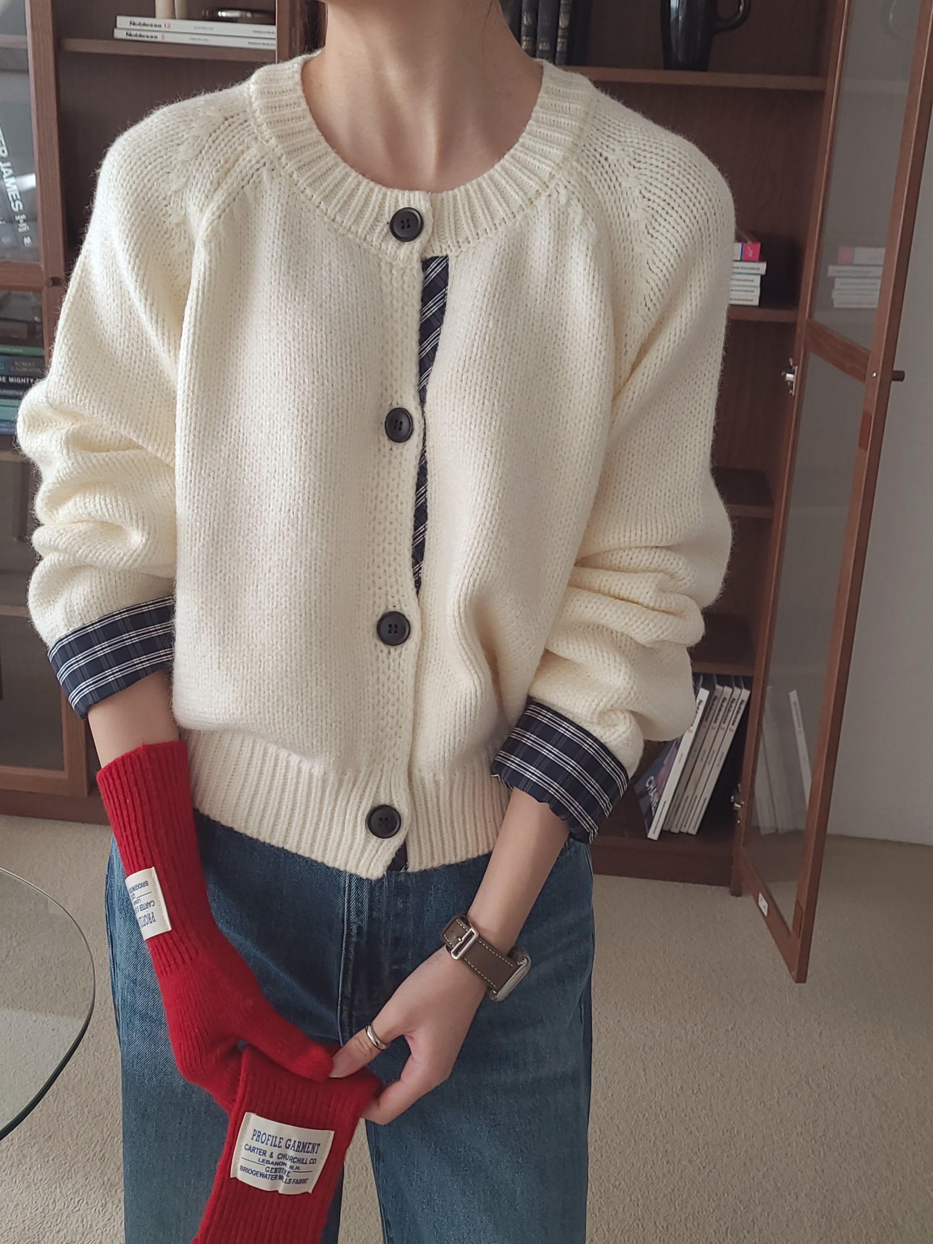 • 品名:格紋點綴鈕扣針織衫/外套