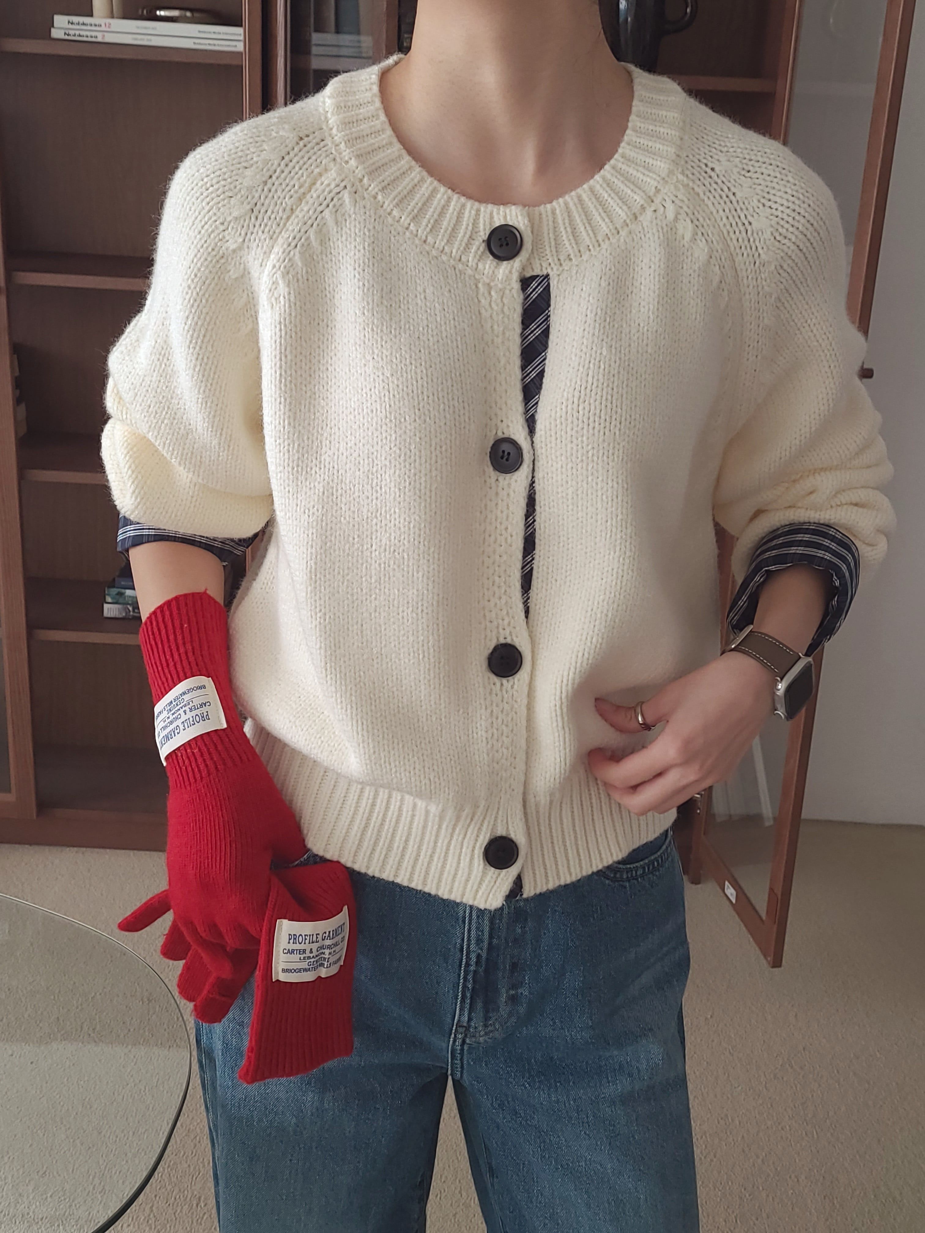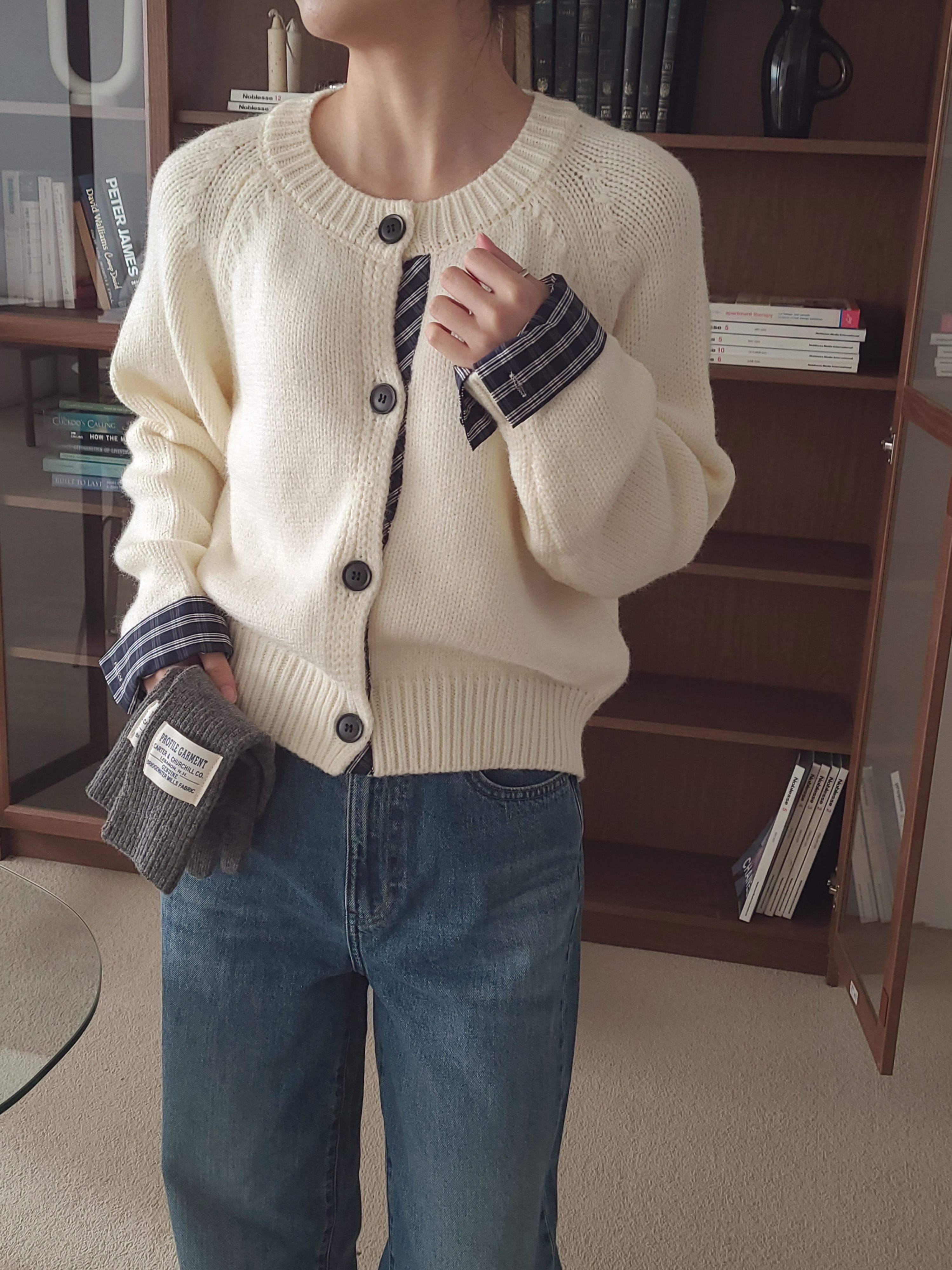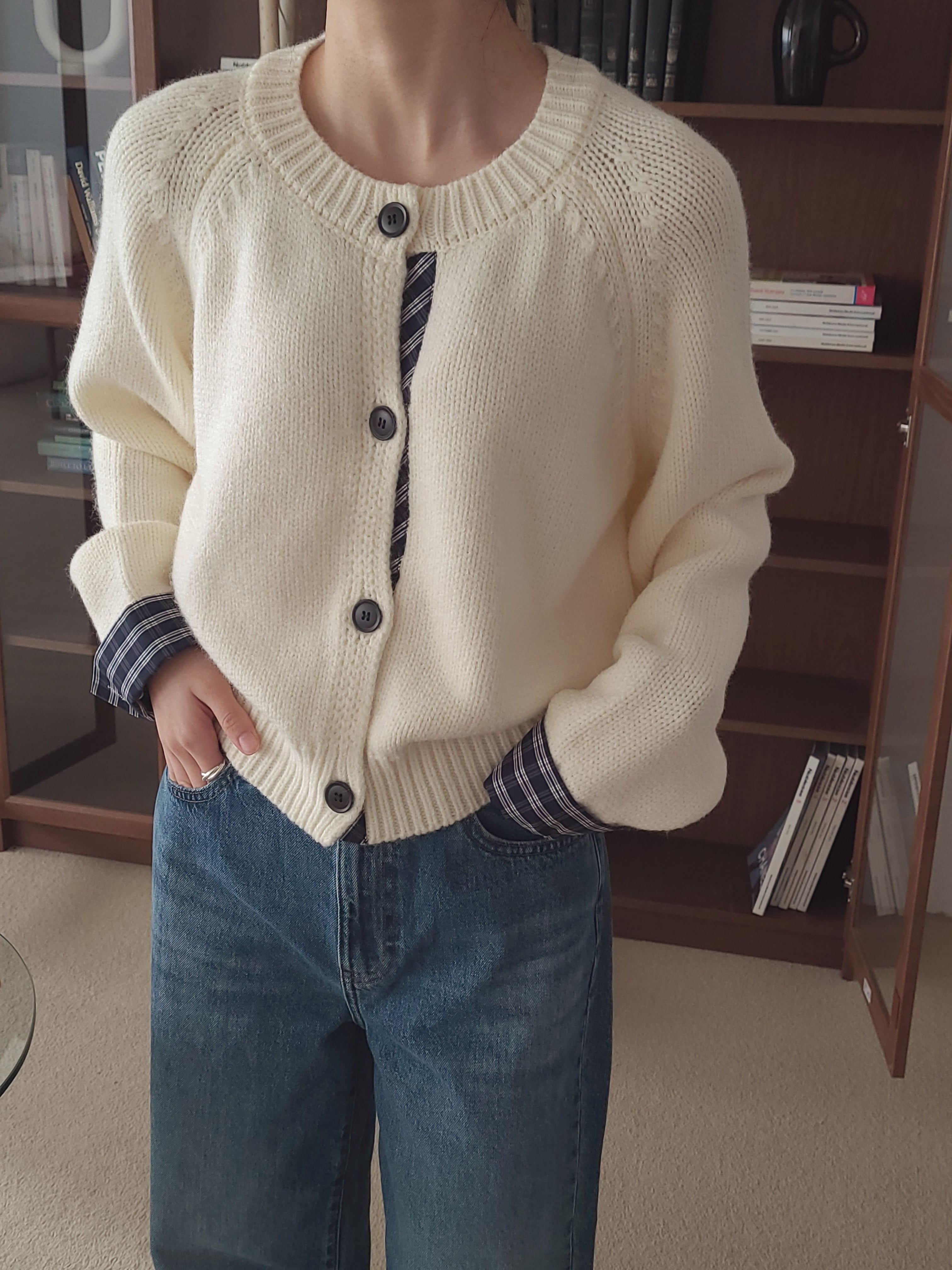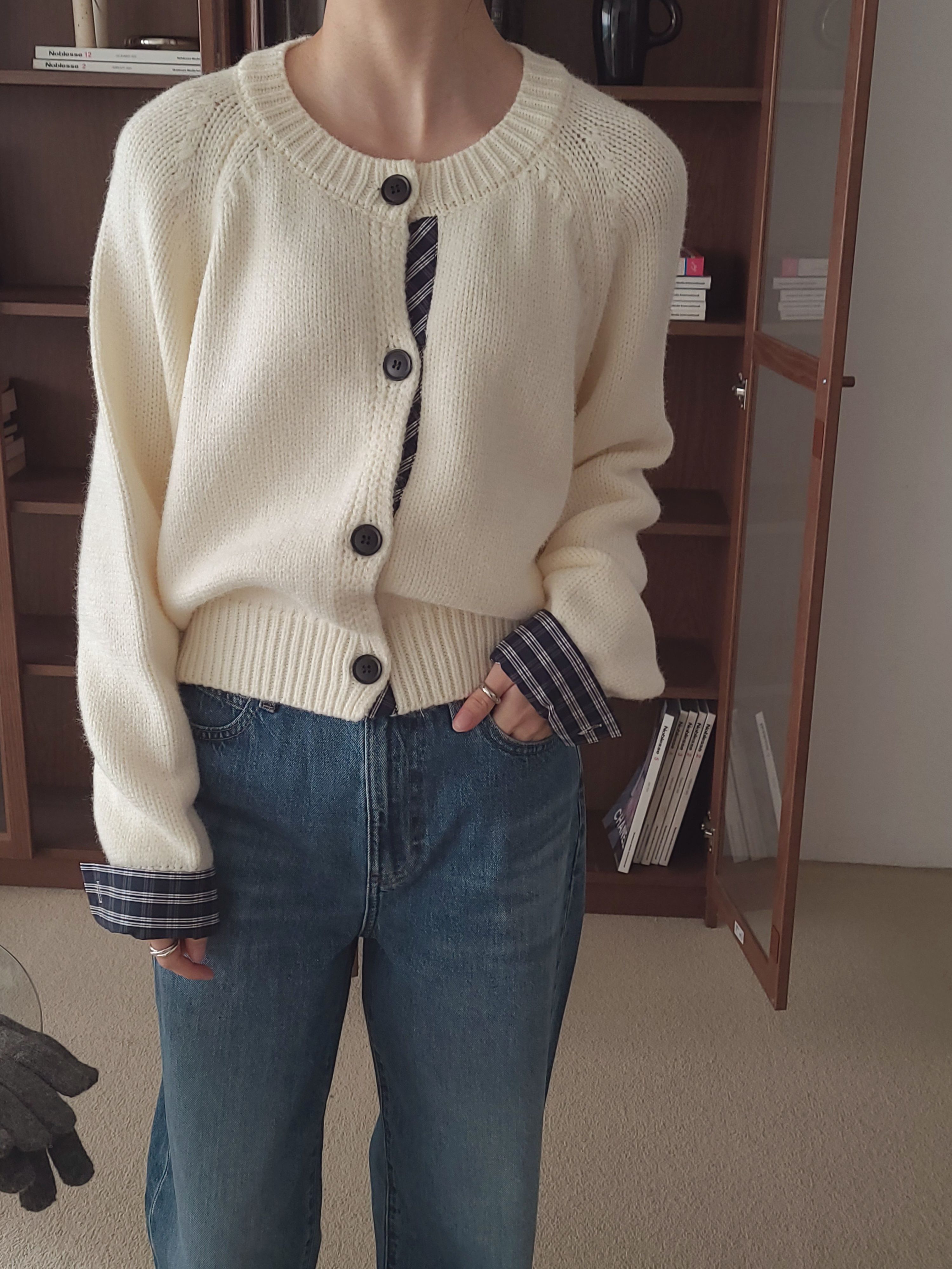 • 品名:格紋點綴鈕扣針織衫/外套