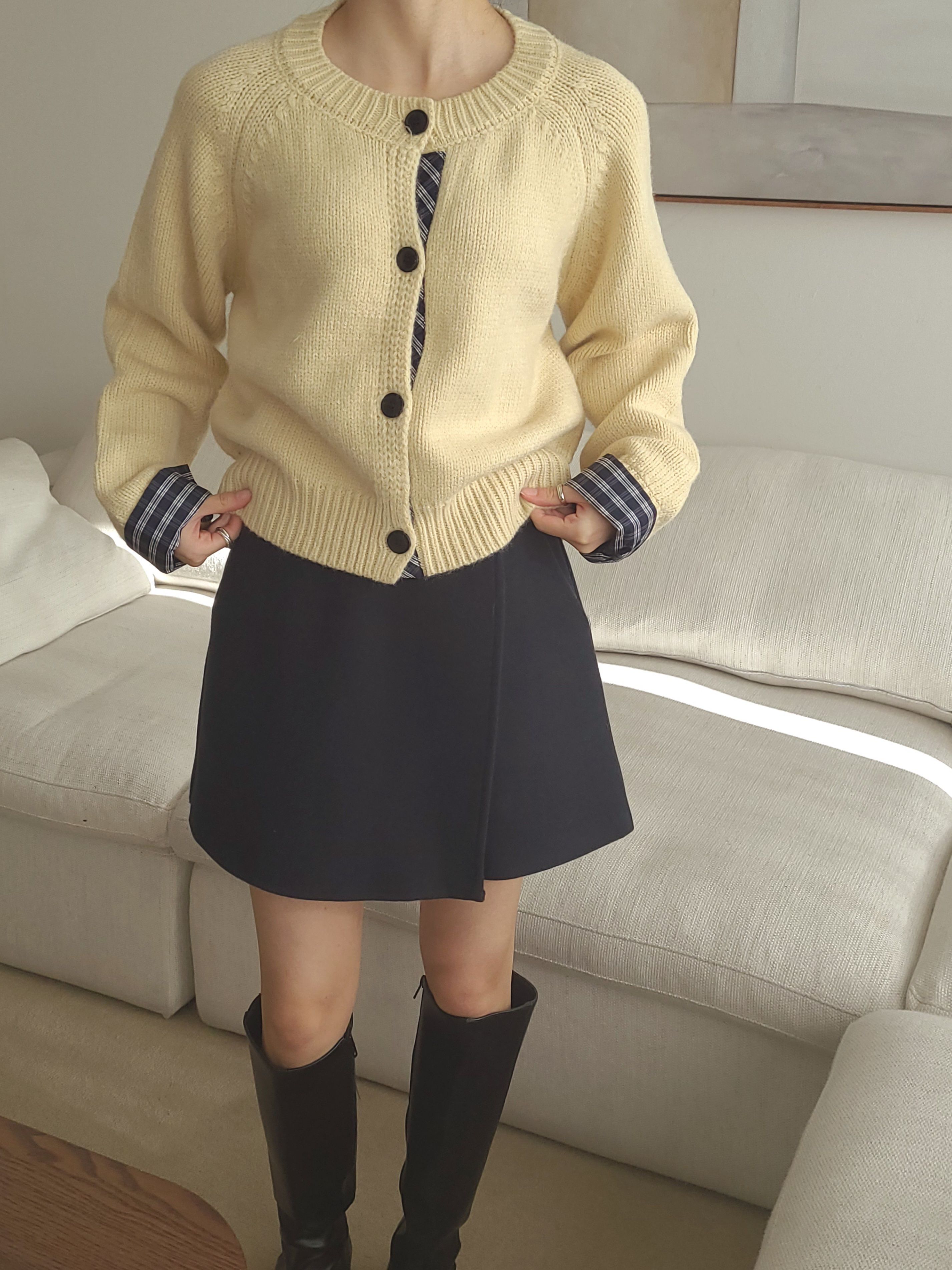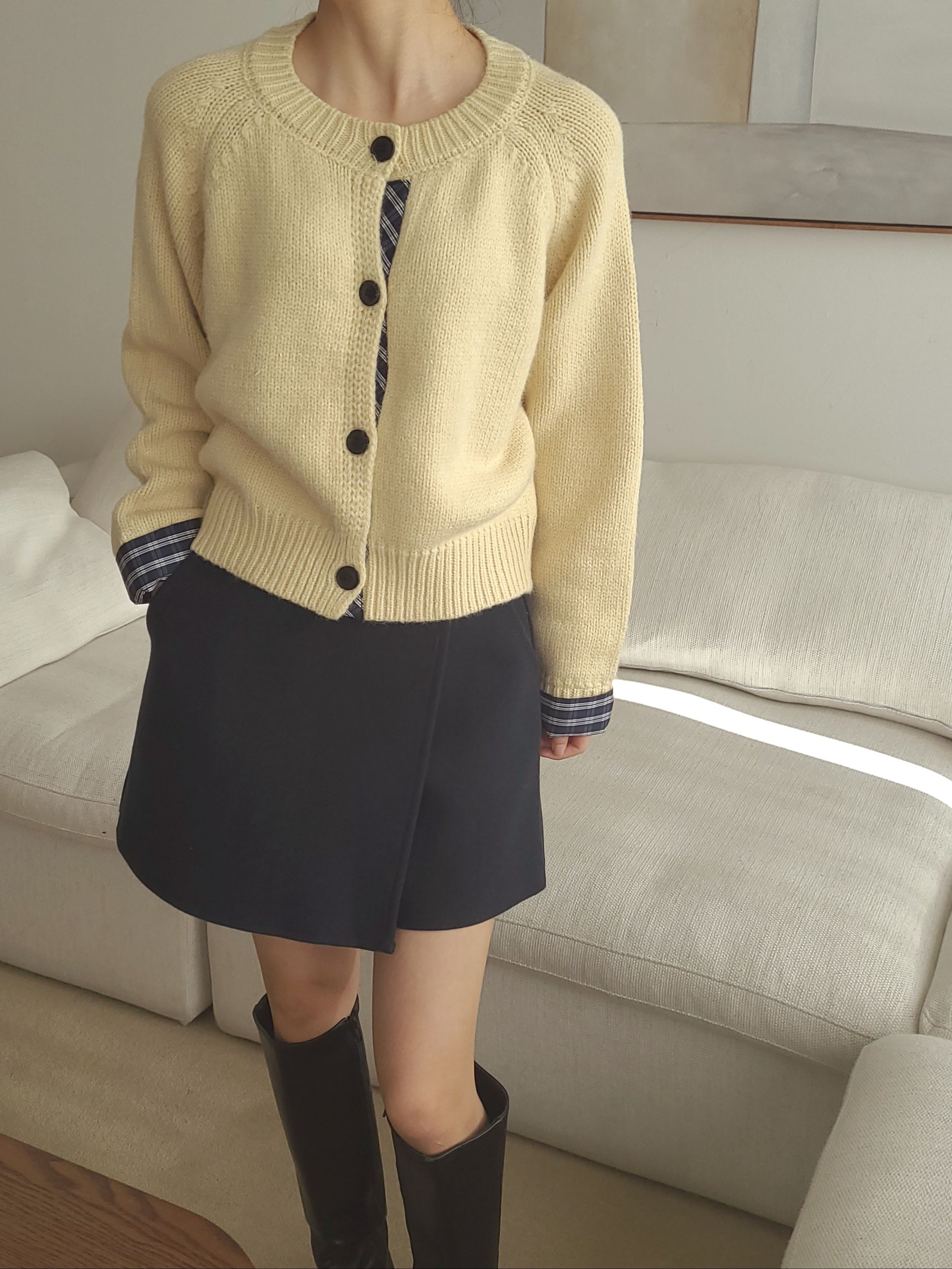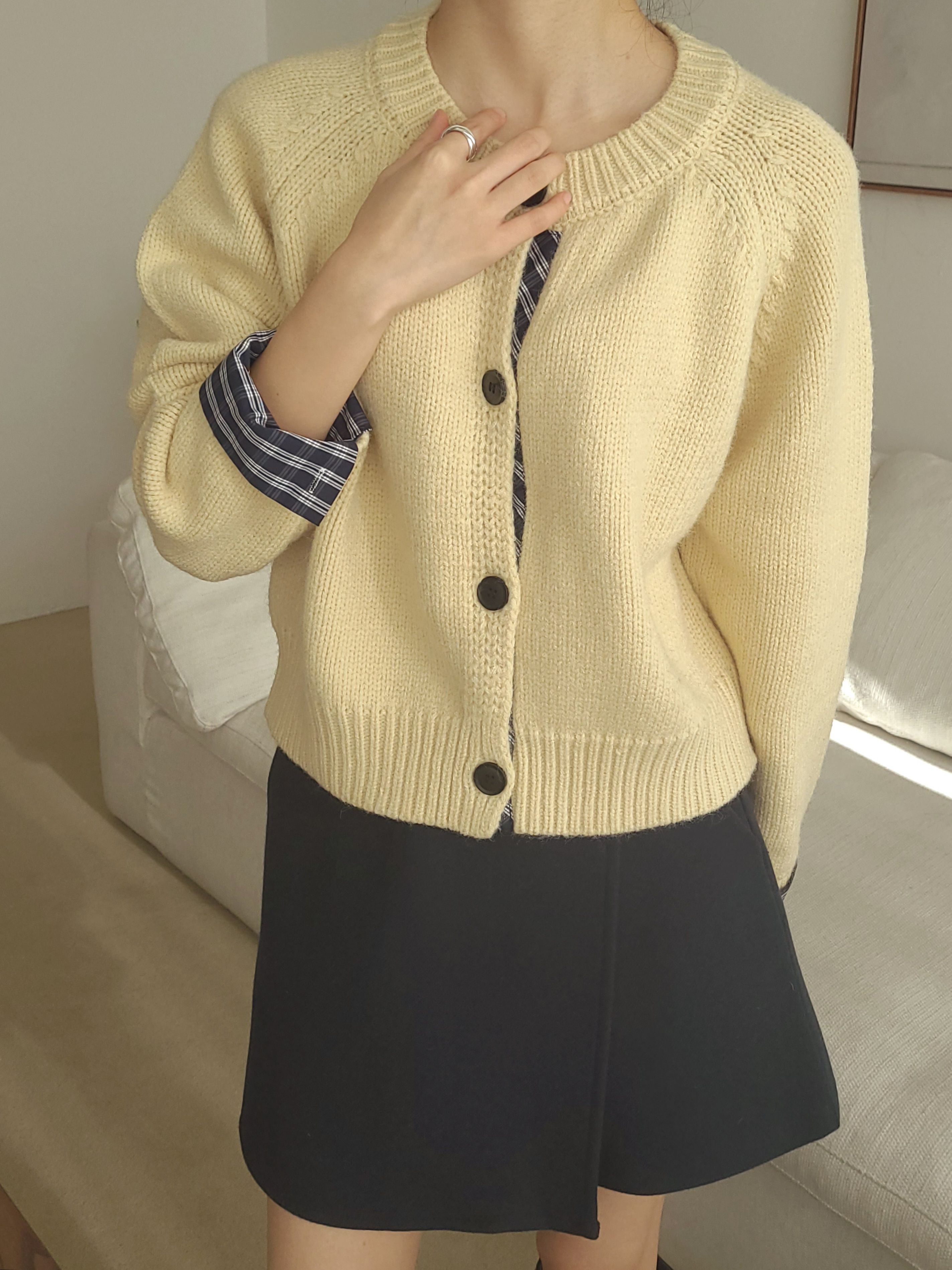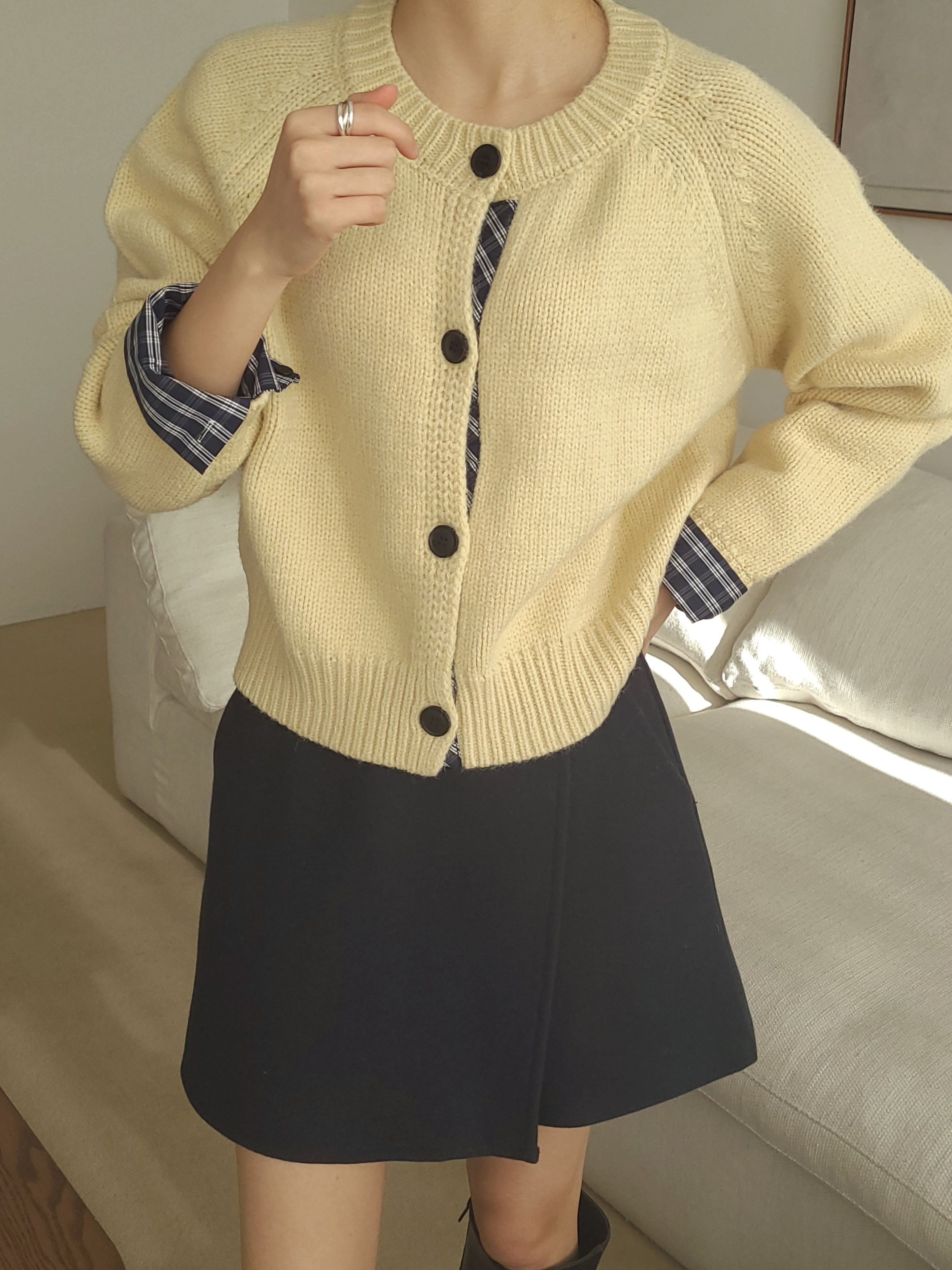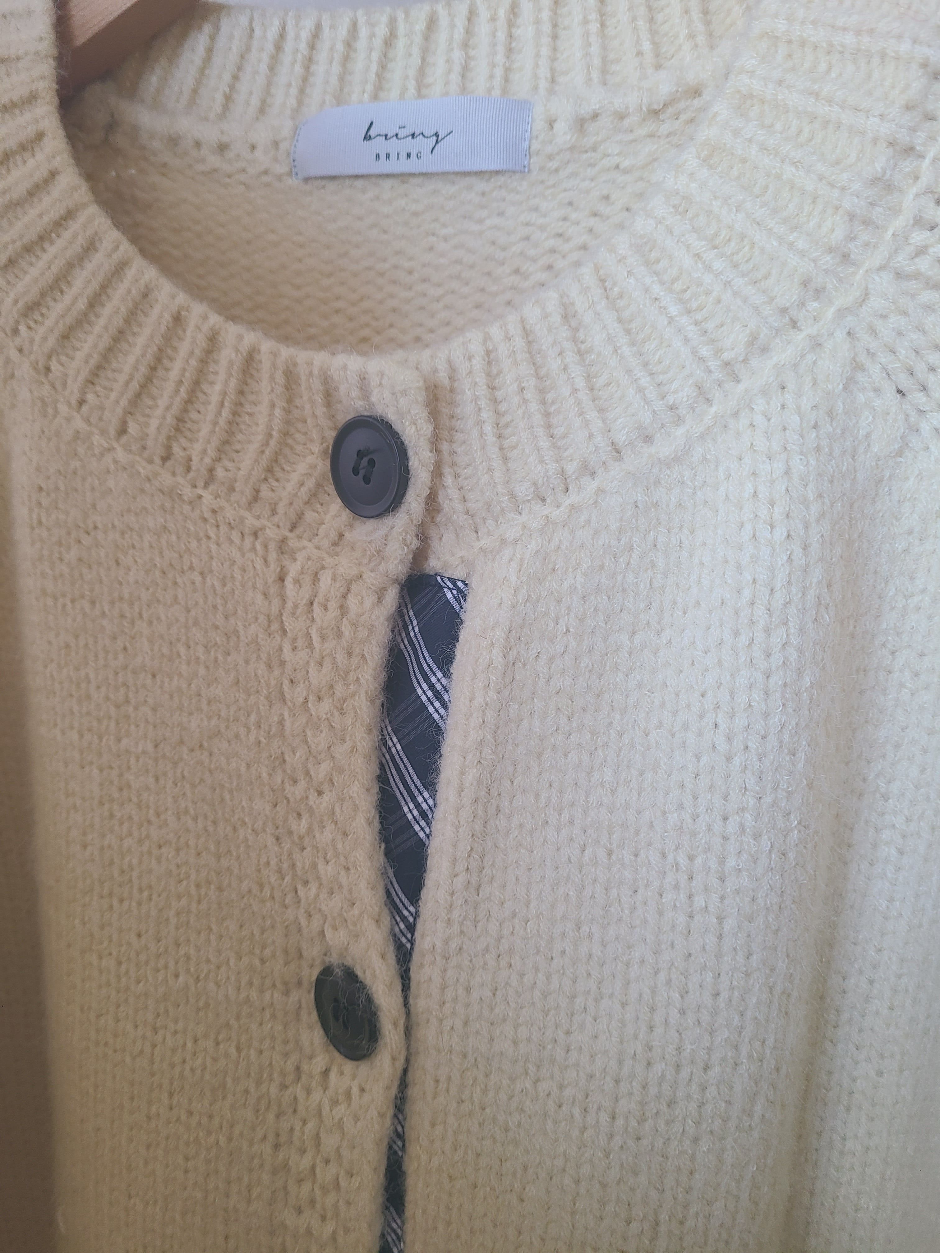 韓國女裝連線 - 格紋點綴鈕扣針織衫/外套-奶油黃 (FREE)