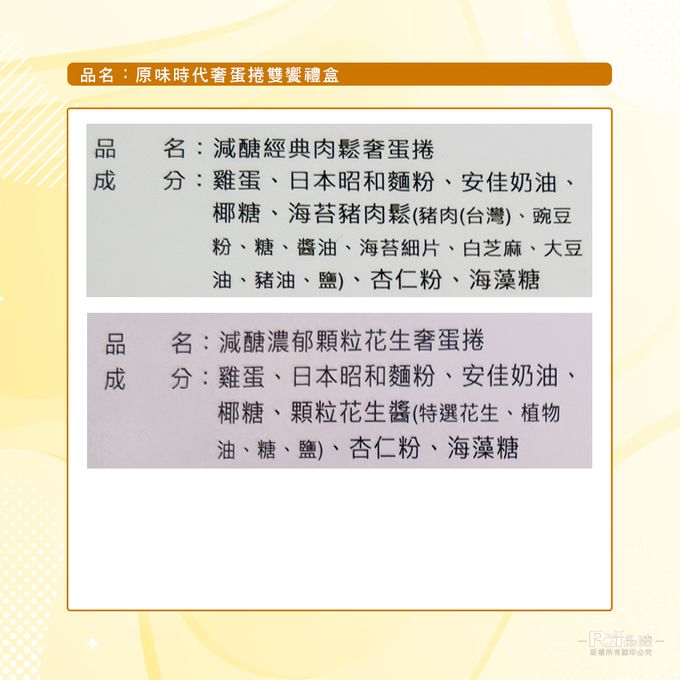 成分:低GI濃餡奢蛋捲(濃郁花生):雞蛋、日本昭和麵粉、安佳奶油、椰糖、顆粒花生醬、杏仁粉、海藻糖 低GI濃餡奢蛋捲(經典肉鬆):雞蛋、日本昭和麵粉、安佳奶油、椰糖、芝麻海苔豬肉鬆、杏仁粉、海藻糖
