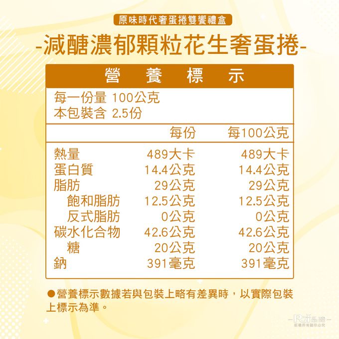 過敏原:低GI濃餡奢蛋捲(濃郁花生):本產品含奶、蛋、堅果、花生等麩質穀物類其製品,不適合對其過敏體質者食用 低GI濃餡奢蛋捲(經典肉鬆):本產品含奶、蛋、堅果等麩質穀物類其製品,不適合對其過敏體質者食用