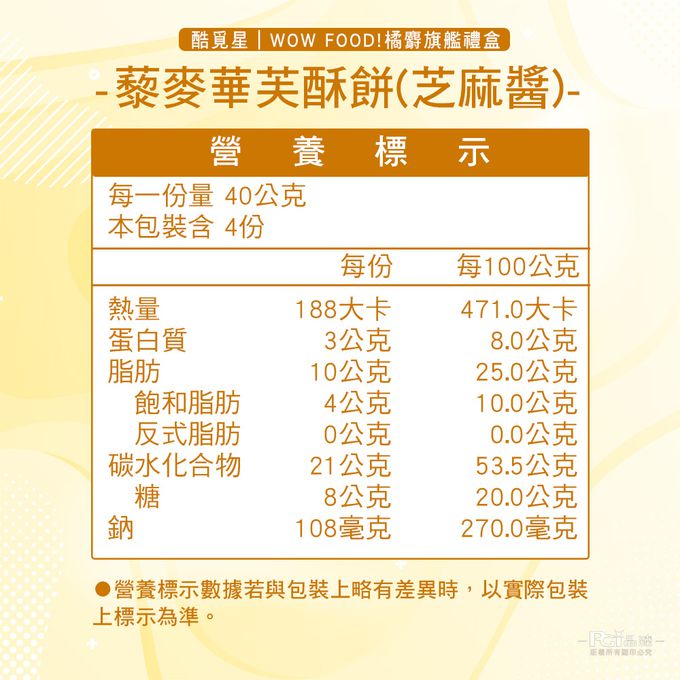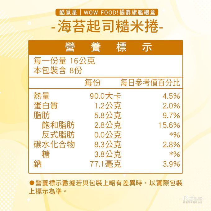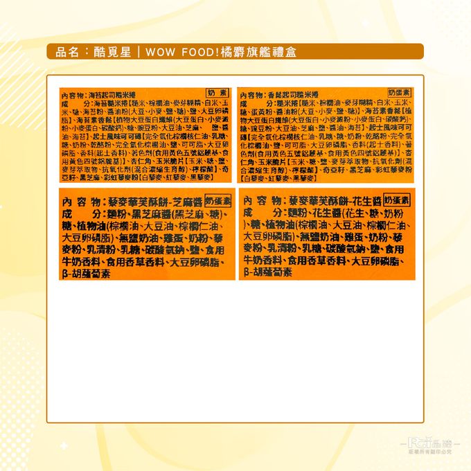 成分:香鬆起司糙米捲:糙米捲【糙米、棕櫚油、麥芽糊精、白米、玉米、糖、蛋黃粉、醬油粉(大豆、小麥、鹽、糖)】、海苔素香鬆【植物大豆蛋白纖維(大豆蛋白、小麥澱粉、小麥蛋白、碳酸鈣)、糖、豌豆粉、大豆油、芝麻、鹽、醬油、海苔】、起士風味可可磚【完全氫化棕櫚核仁油、乳糖、糖、奶粉、乾酪粉、完全氫化棕櫚油、鹽、可可脂、大豆卵磷脂、香料(起士香料)、著色劑(食用黃色五號鋁麗基、食用黃色四號鋁麗基) 】、杏仁角、玉米脆片【玉米、糖、鹽、麥芽萃取物、抗氧化劑(混 合濃縮生育醇)、檸檬酸】、奇亞籽、黑芝麻、彩虹藜麥粉【白藜麥、紅藜麥、黑藜麥】 海苔起司糙米捲:海苔糙米捲【糙米、棕櫚油、麥芽糊精、白米、玉米、糖、海苔粉、醬油粉(大豆、小麥、鹽、糖)、鹽、大豆卵磷脂】、海苔素香鬆【植物大豆蛋白纖維(大豆蛋白、小麥澱粉、小麥蛋白、碳酸鈣)、糖、豌豆粉、大豆油、芝麻、 鹽、醬油、海苔】、起士風味可可磚【完全氫化棕櫚核仁油、乳糖、糖、奶粉、乾酪粉、完全氫化棕櫚油、鹽、可可脂、大豆卵磷脂、香料(起士香料)、著色劑(食用黃色五號鋁麗基、食用黃色四號鋁麗基) 】、杏仁角、玉米脆片【玉米、糖、鹽、麥芽萃取物、抗氧化劑(混合濃縮生育醇)、檸檬酸】、奇亞籽、黑芝麻、彩虹藜麥粉【白藜麥、紅藜麥、黑藜麥】 藜麥華芙酥餅-花生醬:麵粉、花生醬(花生、糖、奶粉)、糖、植物油(棕櫚油、大豆油、棕櫚仁油、大豆卵磷脂)、無鹽奶油、雞蛋、奶粉、藜麥粉、乳清粉、乳糖、碳酸氫鈉、鹽、食用牛奶香料、食用香草香料、大豆卵磷脂、β-胡蘿蔔素 藜麥華芙酥餅-芝麻醬:麵粉、黑芝麻醬(黑芝麻、糖)、糖、植物油(棕櫚油、大豆油、棕櫚仁油、大豆卵磷脂)、無鹽奶油、雞蛋、奶粉、藜麥粉、乳清粉、乳糖、碳酸氫鈉、鹽、食用牛奶香料、食用香草香料、大豆卵磷脂、β-胡蘿蔔素