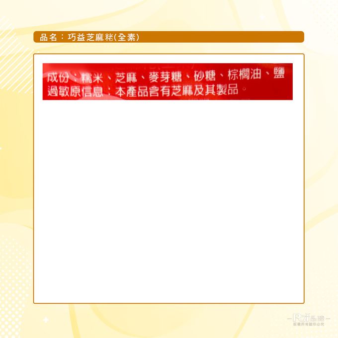 過敏原:花生:本產品含有花生、含有麩質的穀物及其製品。 芝麻:本產品含有芝麻及其製品。 米粩:無