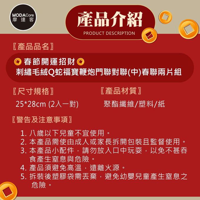 品名:◉春節開運招財◉刺繡毛絨Q蛇福寶鞭炮門聯對聯(中)春聯兩片組