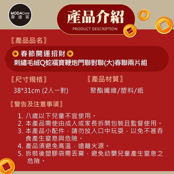 品名:◉春節開運招財◉刺繡毛絨Q蛇福寶鞭炮門聯對聯(大)春聯兩片組